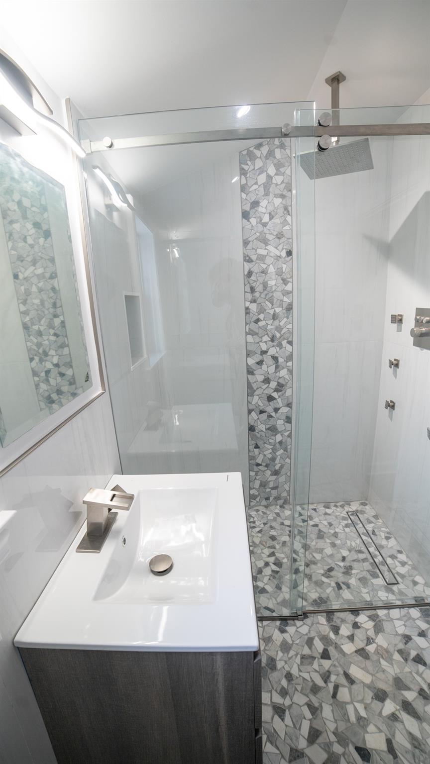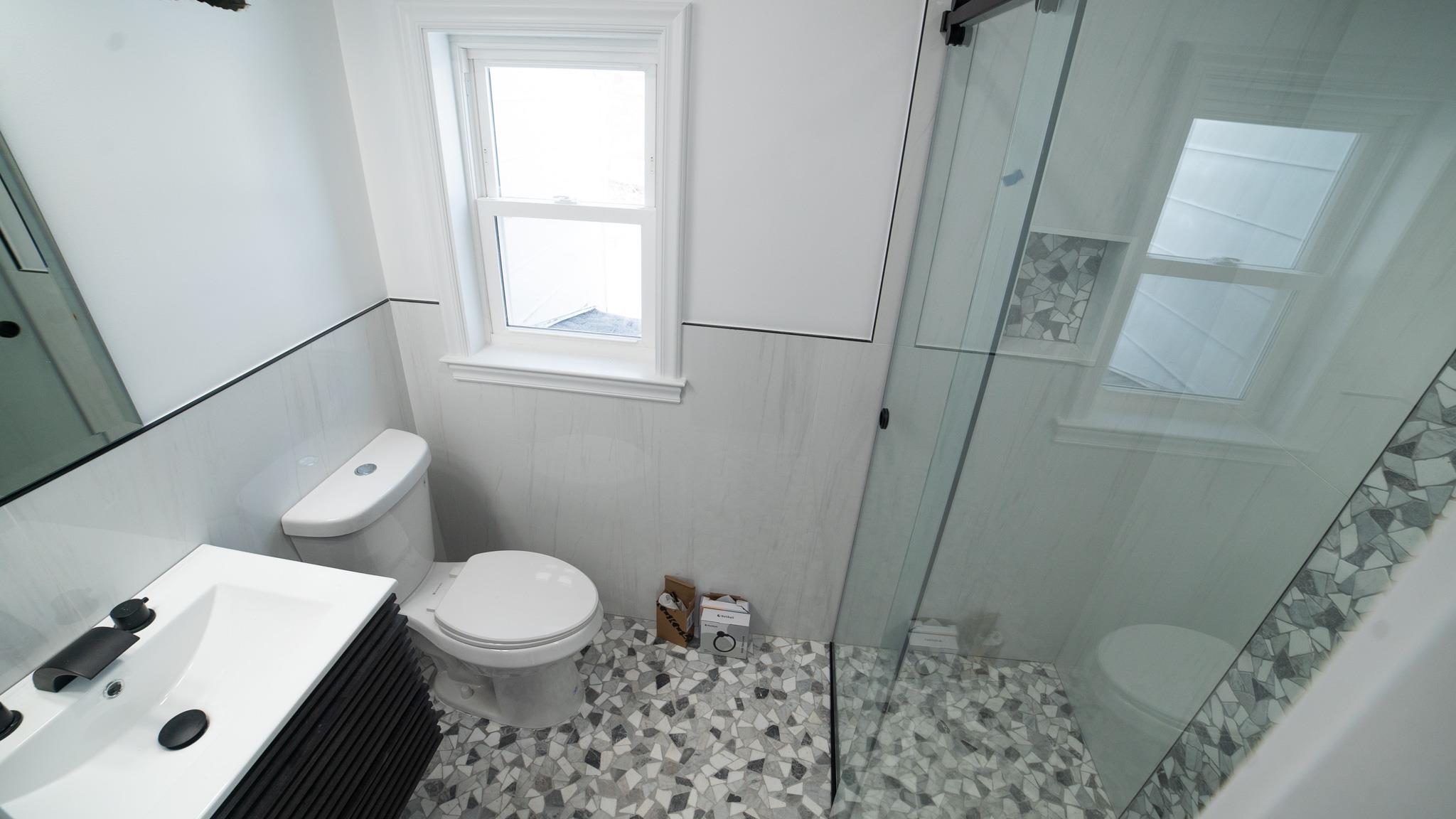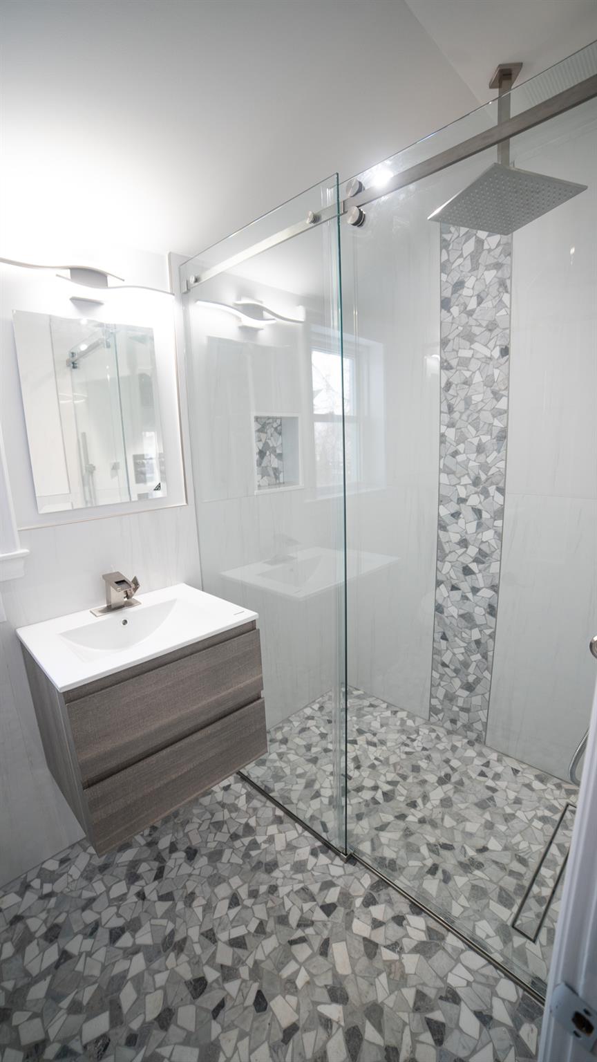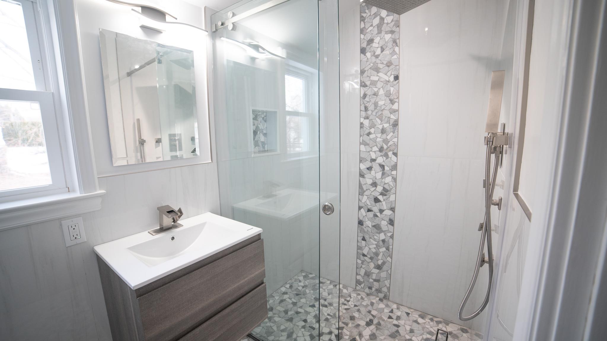 Come and see this exquisite, totally renovated 3 bedrooms/2. 5 baths home on a Cul de sac. It's as if brand new. . . featuring a new boiler and state of the art fixtures in 2. 5 bathrooms with spray jets, handheld shower sprays and rainfall shower heads. Also, fully tiled walls with seamless sliding glass doors in the showers complimented with floating vanities and quartz tops. Step into the inviting foyer area with beautiful hardwood floors continuing to the Living Room well-lit with radiant sunlight, and brand-new energy efficient windows and doors throughout the home; charmed with a rustic brick fireplace with built-ins on either side. The wall colors are soft neutrals giving a sense of elegance enhanced by the ceiling moldings. Enter the sizeable Formal Dining Room which has a door to the patio, juxtaposed to the walkthrough kitchen which has all new stainless-steel appliances, shaker wood cabinets, working counter space, glass-tiled backsplash and quartz countertops - all convenient for the Chef in your family! A door from the kitchen leads to a full unfinished, walkout basement with laundry hook-ups. Leading from the foyer up a few steps is the powder room and then on the other side to the Primary bedroom - its own full bathroom, walk-in closet and ceiling fan. There are two hall closets. Going up a few more steps are 2 sizeable bedrooms with ceiling fans. There is an upscale full hall bath with modern fixtures. This home boasts recessed lighting throughout and modern light fixtures. There is a patio area in the rear leading from the Dining Room. Lots of yard space to do some special plantings and entertaining. This home can be easily converted to Central Air conditioning as the vents are in place already. A dream house to live in!
