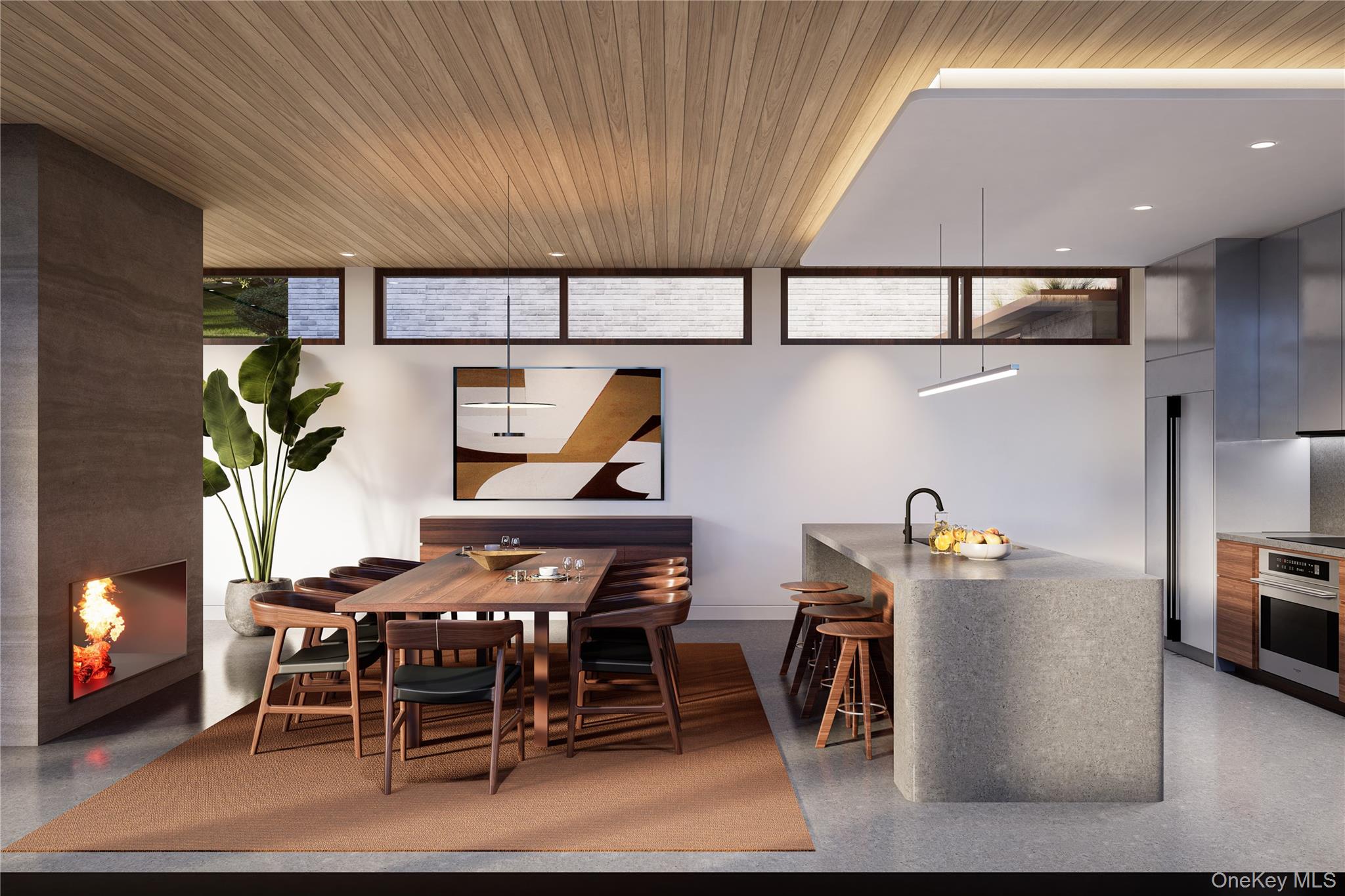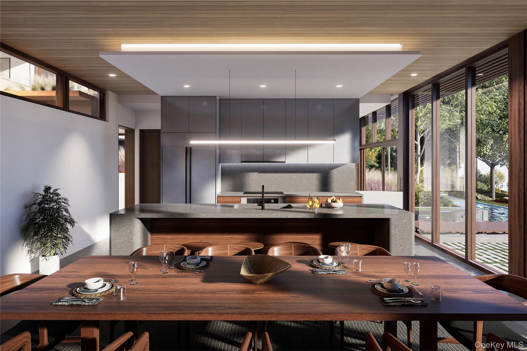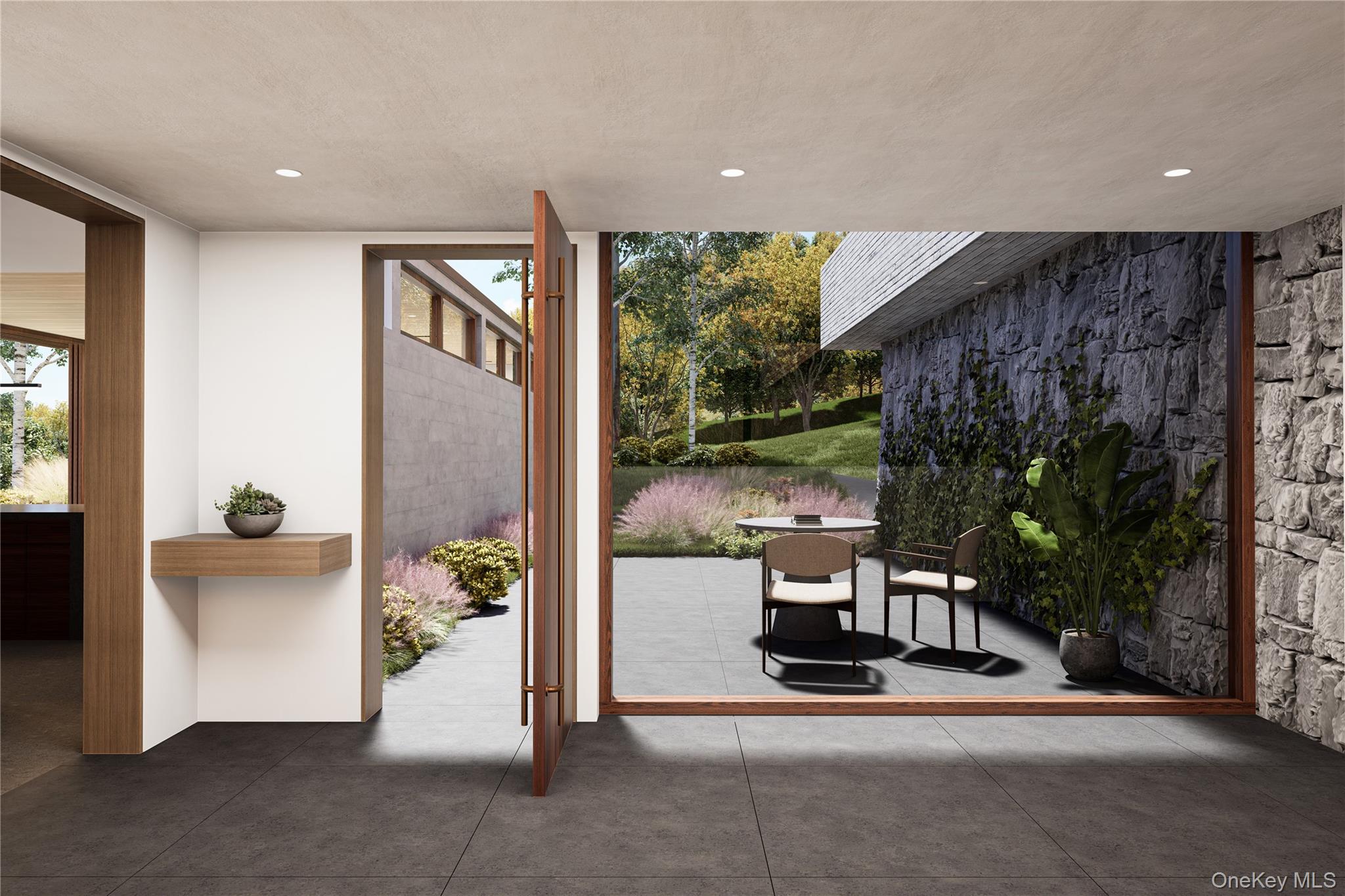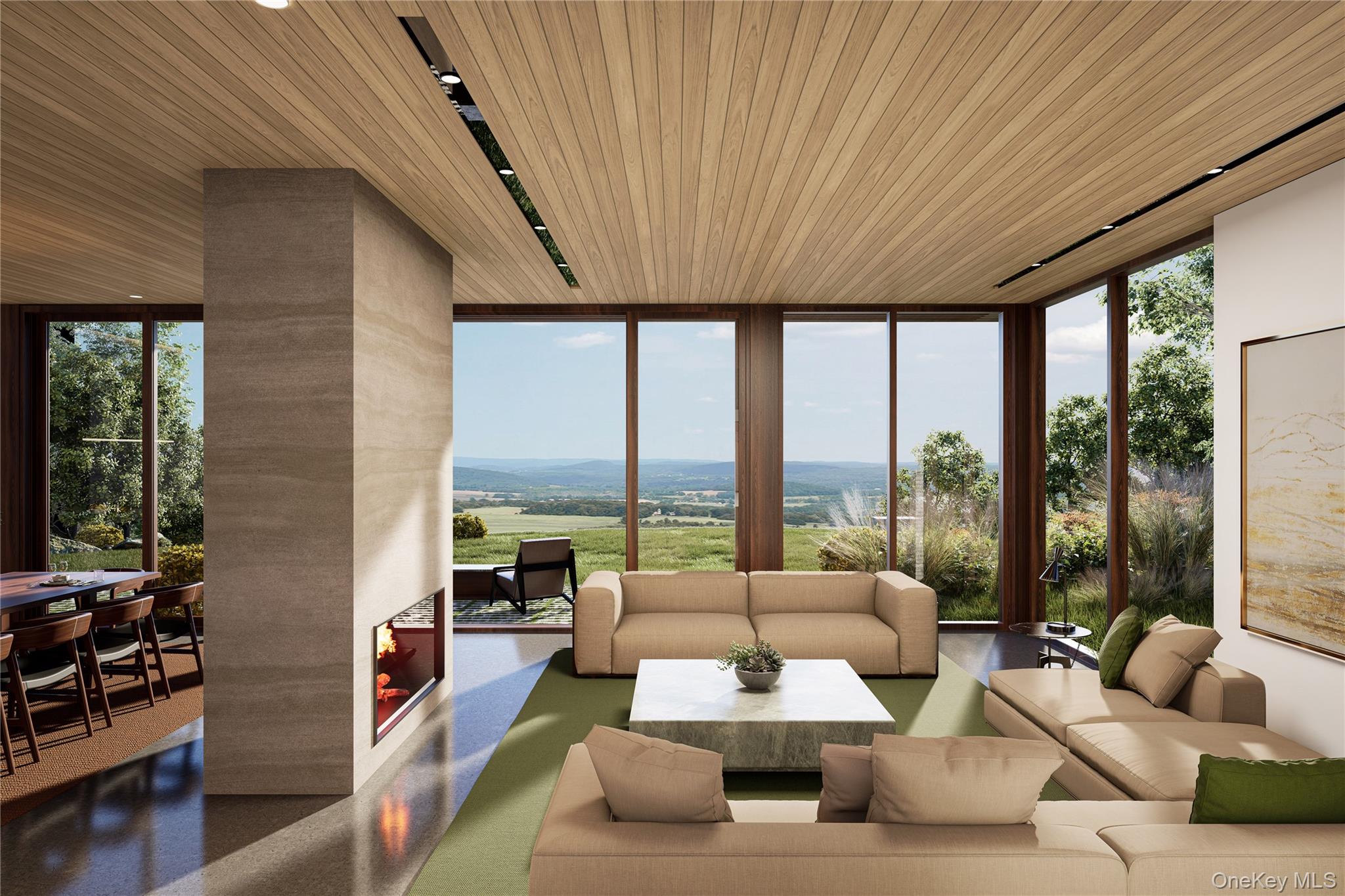 Nestled in the scenic Hudson Valley, the town of Amenia offers a peaceful blend of rural beauty, rich history, and vibrant community life. Surrounded by rolling hills and tranquil farmlands, it’s the perfect escape for nature lovers. Home to renowned communities like Troutbeck, a historic estate turned retreat, and Silo Ridge, a members-only golf community, Amenia offers elegance and charm. With easy access to the Metro-North Wassaic station, the town is well-connected to New York City, making it an ideal getaway that combines serene countryside living with urban convenience. The "Cascade House", a to-be-built residence, embodies modernism, blending architectural and landscaped elements with contemporary design principles. Situated on a sloping 13-acre plot, the home connects with the site’s topography to take advantage of expansive views of Amenia and beyond. One approaches the site via a gently curving creek leading to a clearing in the surrounding woods. The home features three architectural volumes. The upper structure, containing bedrooms and a home office, floats above the landscape. The central volume, dedicated to social spaces, is enclosed in floor-to-ceiling glass with large sliding doors connecting the interior to the surroundings. The lower volume is sunken into the earth, an exterior hardscaped area with seating, outdoor kitchen, dining, or the optional pool area. These volumes cascade down the mountainside, offering unobstructed views of nature and vistas beyond. Approaching the residence, one is struck by the interplay of materials. The stone-clad driveway walls seamlessly transition into the exposed foundation walls for the upper volume. On top of this floats the upper volume, clad in light, weathered brick. The living space box showcases board-formed concrete on three walls and mahogany with full-height glazing on the other. Between these boxes is an entry area, a mix of wood and glass with a green roof. In this home, the landscape plays an equal role with architecture. Between each volume is a signature landscape feature. The upper landscape includes specialty plantings framing the entry court, green roof plantings, and a sloping hill of native planting visible through the foyer. The lower landscape features pervious paving, allowing the living room to flow outdoors through operable doors to seating and dining areas. Inside, the interior unfolds with an effortless flow, characterized by clean lines, open spaces, and a restrained palette of materials. The heart of the house is the open-plan public spaces with 10’ ceilings in the living room, dining, kitchen, and 13’ ceilings in the family room. These spaces are bathed in natural light from the full-height windows and doors on the south face. There is a slated mahogany ceiling and cast concrete floors. A marble-clad feature wall with a double-sided fireplace separates the living and dining rooms. The gourmet kitchen features mahogany and lacquered wood cabinetry, Miele appliances, and an expansive cast concrete island. There is a large walk-in pantry for extra storage and appliances. The principal residence boasts four generously proportioned bedrooms, each with an ensuite bathroom. The primary suite has an expansive custom walk-in closet, a spa-like bathroom, and a private terrace. Throughout, sustainable design principles are seamlessly integrated, with extensive insulation, triple-pane wood windows, energy-efficient mechanical systems, and fully electric appliances. The result is a harmonious fusion of form and function, where luxury, nature, and human experience coexist in perfect balance. In a town where history, nature, and modern elegance converge, the Cascade House offers the perfect retreat—where the serenity of Amenia meets the art of contemporary living.