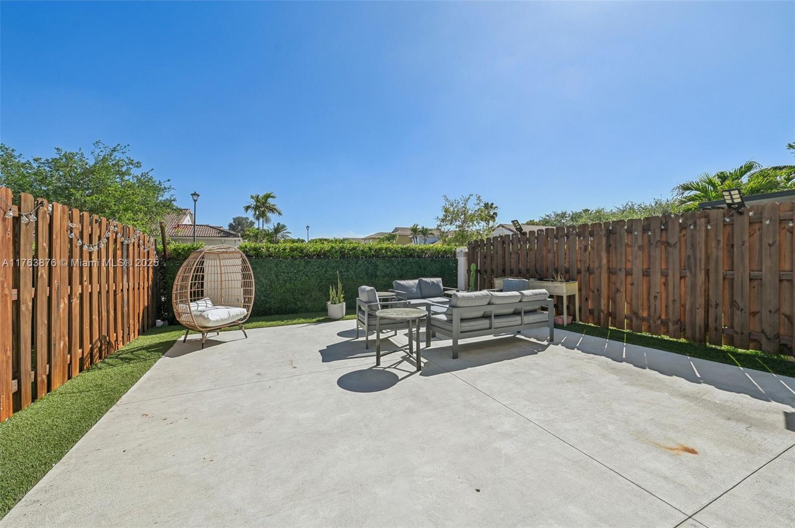 Low-Maintenance Backyard: A private oasis with a concrete slab and artificial turf for relaxation and easy upkeep.