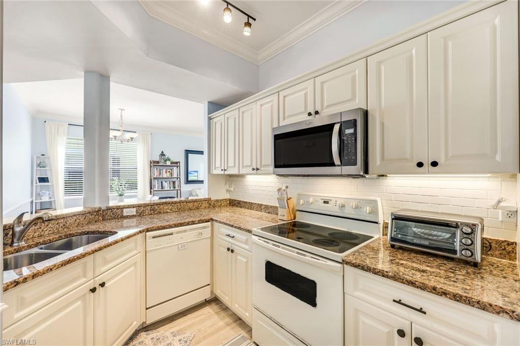 Welcome to the Fairways at Marco Shores. This 3-bedroom, 2-full bathroom end unit condo has been immaculately kept. Upon entering your private screened entry, you segue into an open foyer. The large kitchen offers granite counter tops and ample space to entertain family and friends. The updated vinyl floors and crown molding throughout provides a modern & clean look. The split-bedroom floorplan provides a private master suite which also has its own access to the screened outdoor space. This light and bright unit also has windows on all 3 sides which allows for tons of natural light. The southern exposure and views of Hammock Bay Golf Course from your screened outdoor space provides an oasis for relaxation. This unit offers two-(2) parking spaces, one of which is covered. This is a great option for your vehicle. This unit is conveniently placed between Marco Island & Naples, which allows you to enjoy the best of both worlds. Beaches, shopping, and dining are all in close proximity for ultimate enjoyment.