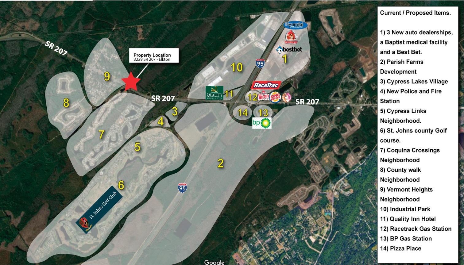 Unlock a rare chance to own 2. 07 acres of prime PUD-zoned land in one of North Florida’s fastest-growing corridors. Situated on State Hwy 207, just 1 mile west of I-95, this property is nestled among thriving neighborhoods and poised for exponential growth. The surrounding area is buzzing with development: new auto dealerships, a Best Bet casino, a modern police and fire station, a revamped golf course, a county water plant, industrial projects, a 12, 000 sq ft rum distillery, and a new Publix shopping center—all within a few miles. Plus, the colossal 2, 800-acre Parrish Farms mixed-use development sits across Hwy 207, amplifying the potential. Zoned for neighborhood commercial use, this site is ideal for a restaurant, retail space, medical facility, or more. The property does have an 900 sq. ft. existing home that was built in 2012 and totally renovated inside that could serve as an office or could be removed completely, but the value is in the property itself. With 360 feet of Hwy 207 frontage and already-impressive traffic counts, this location offers unmatched visibility in an area just hitting its stride. Don’t miss out—this is a gateway to North Florida’s booming future.