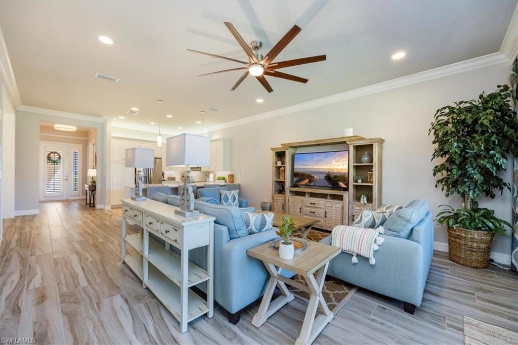 "Live Life Beautifully in Southwest Florida" in this Meticulously Maintained, Fully Furnished Villa with Lake View at Marbella Isles in Naples, FL . Welcome to this beautifully appointed 2-bedroom + den, 2-bath attached villa in the highly sought-after Marbella Isles community. Boasting a serene lake view and an array of upscale upgrades, this meticulously maintained home offers the perfect blend of comfort, style, and functionality — all from its original owner and offered fully furnished. Step inside to find wood-look tile flooring throughout the main living areas, plush carpet in the bedrooms, and designer details at every turn, including crown molding, wainscoting, plantation shutters, and custom draperies. The tray ceilings feature beautiful wood inlays adding a warm, elegant touch. The chef’s kitchen is upgraded with soft-close cabinetry, quartz countertops, and premium finishes, matched seamlessly in both bathrooms. The den is outfitted with a California Closet system with Murphy beds, making it a versatile space that allows the home to comfortably sleep six.