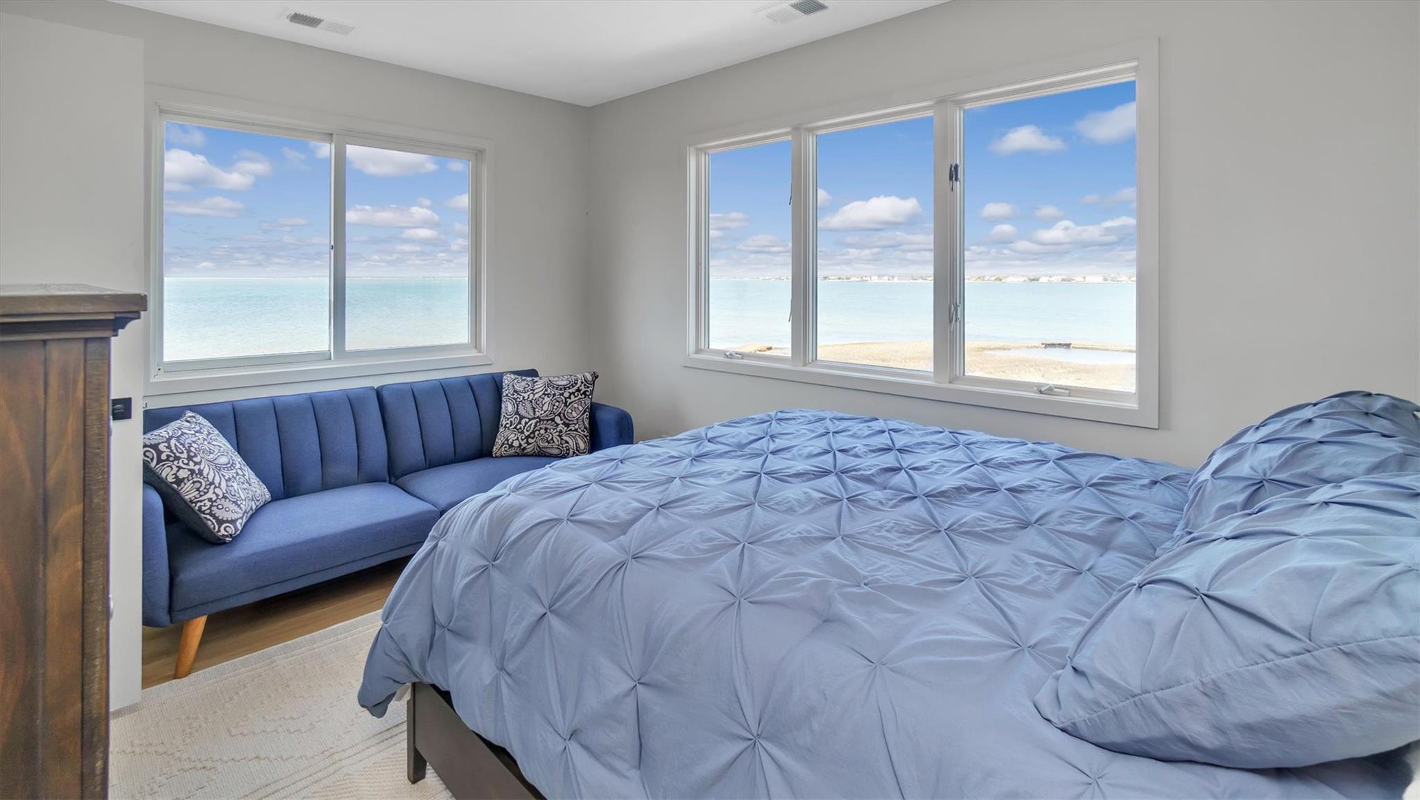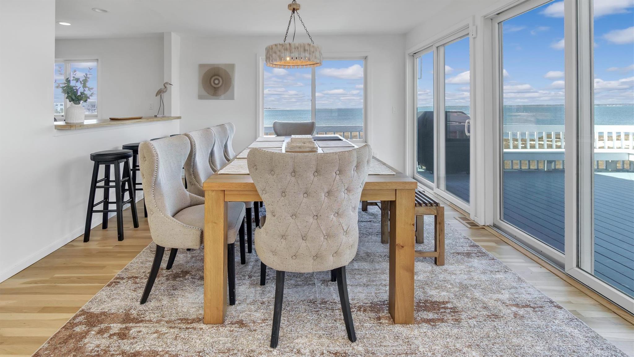 Perched along Dune Road, this delightful two-story home captures stunning sunrises and sunsets with sweeping bay views visible from nearly every room. The residence offers five bedrooms and three and a half bathrooms, blending comfort with coastal allure. On the main level, an airy living space features a warm fireplace, accompanied by a primary bedroom with its own en-suite bathroom, a fully equipped kitchen, a convenient laundry area, a dining room, and a stylish bar. Upstairs, four more bedrooms and two bathrooms provide ample space, each showcasing beautiful vistas of the bay. Interior refresh with new paint, refinished floors and furniture. Step outside to unwind on the deck just off the dining area, take a refreshing swim in the heated gunite pool, or wander down your private path to a secluded beach—perfect for launching a kayak or strolling to the ocean via an exclusive right of way. Wonderful wrap around decks for you entertain! Life on Dune Road comes with added perks, like the renowned John Scott's restaurant just a short walk away—no need to worry about parking! This house is gorgeous, private and waiting for you! Memorial Day- Labor Day $195, 000. MD-June 30 $55, 000, July - $80, 000, Aug-LD $85, 000. Call for off season pricing!