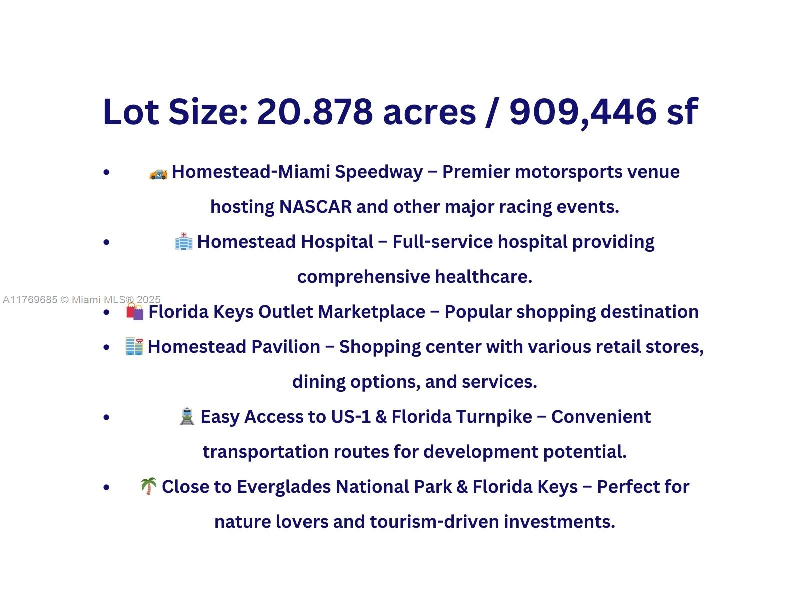Incredible investment opportunity in South Florida! This 20-acre parcel offers endless potential for development, agriculture, or long-term investment. Conveniently located near Homestead-Miami Speedway, Homestead Hospital, Florida Keys Outlet Marketplace, and major highways (US-1 & Turnpike), this property boasts easy access to key amenities. Just minutes from the Everglades & Florida Keys, it's perfect for those seeking growth in a high-demand area.