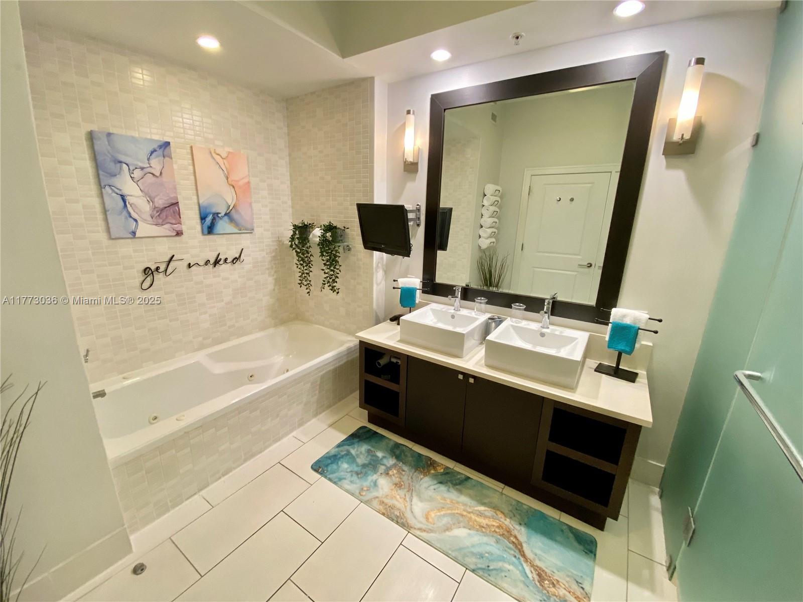 The kitchen is equipped with stainless steel appliances. Bedroom features luxurious king-size bed and plenty of storage. The spa-like bathroom boasts a whirlpool bathtub, separate shower, and dual sinks for added comfort.