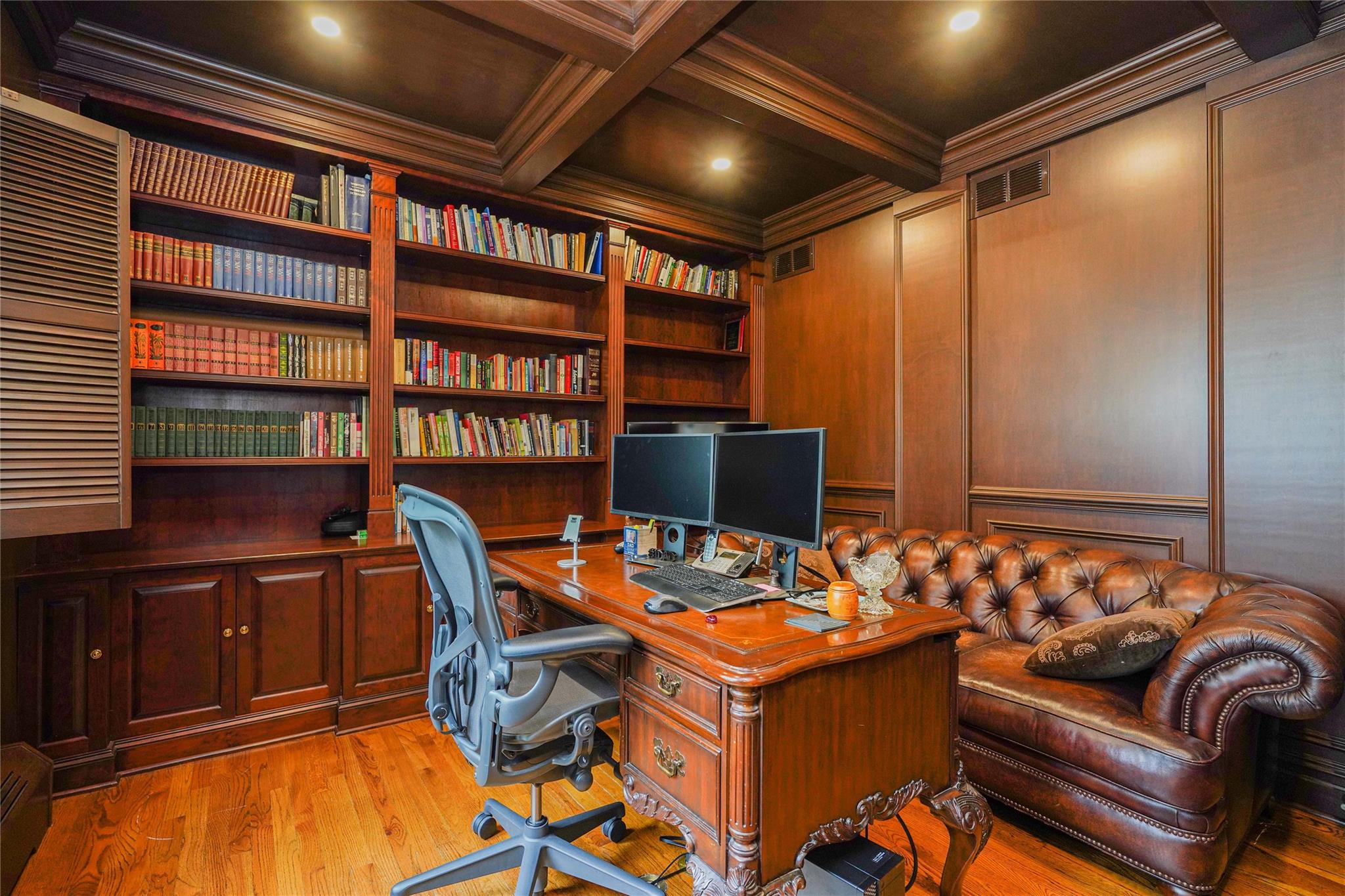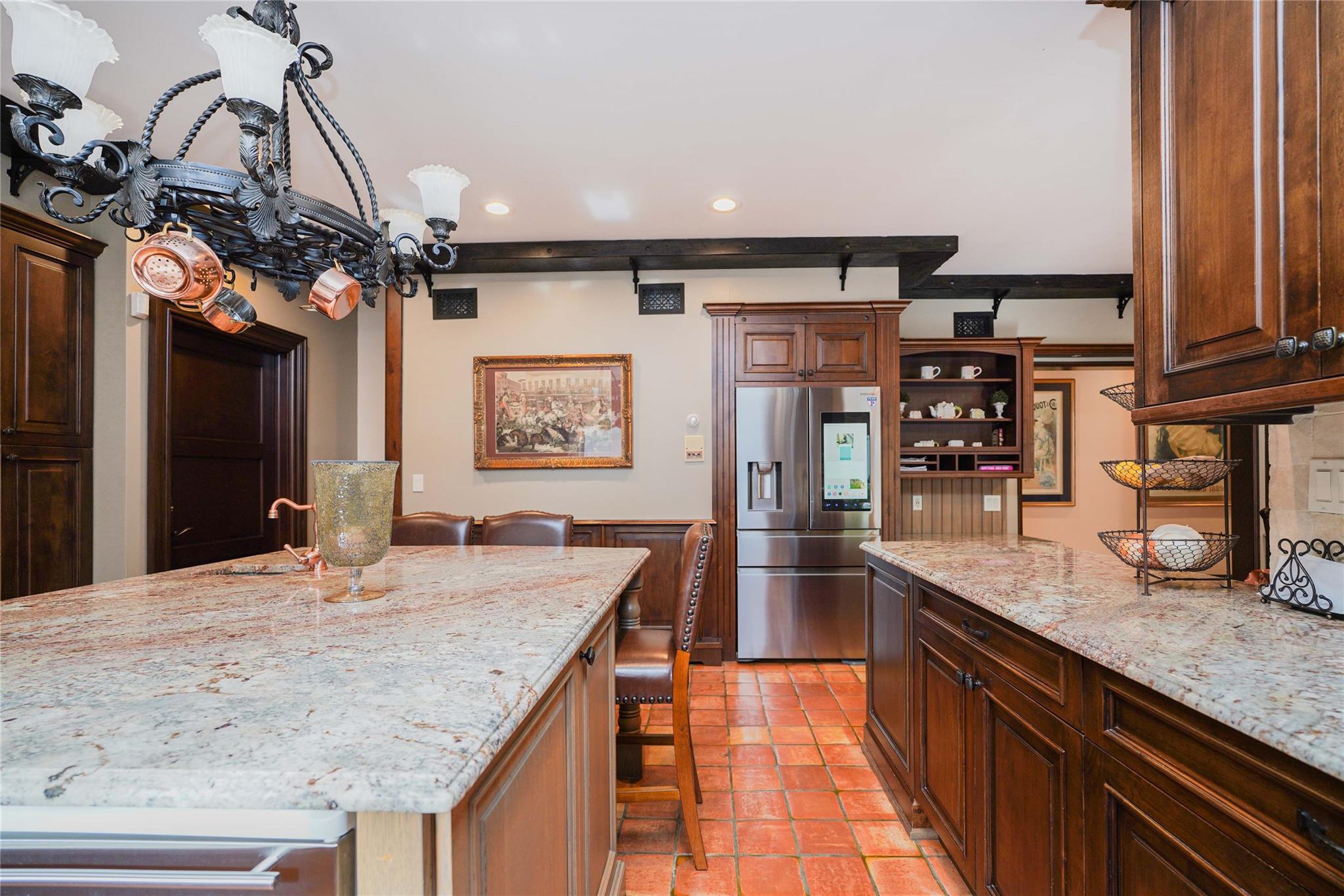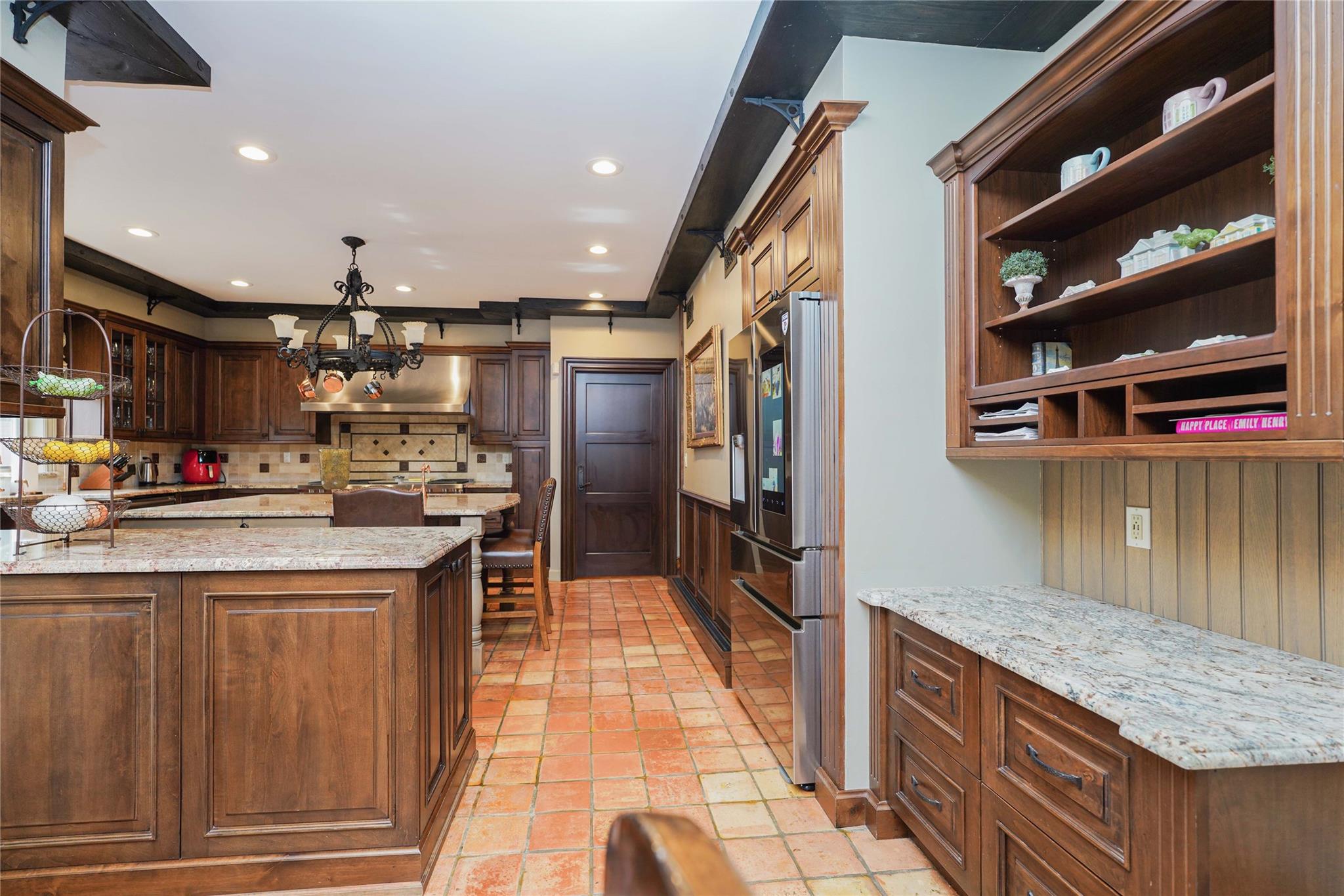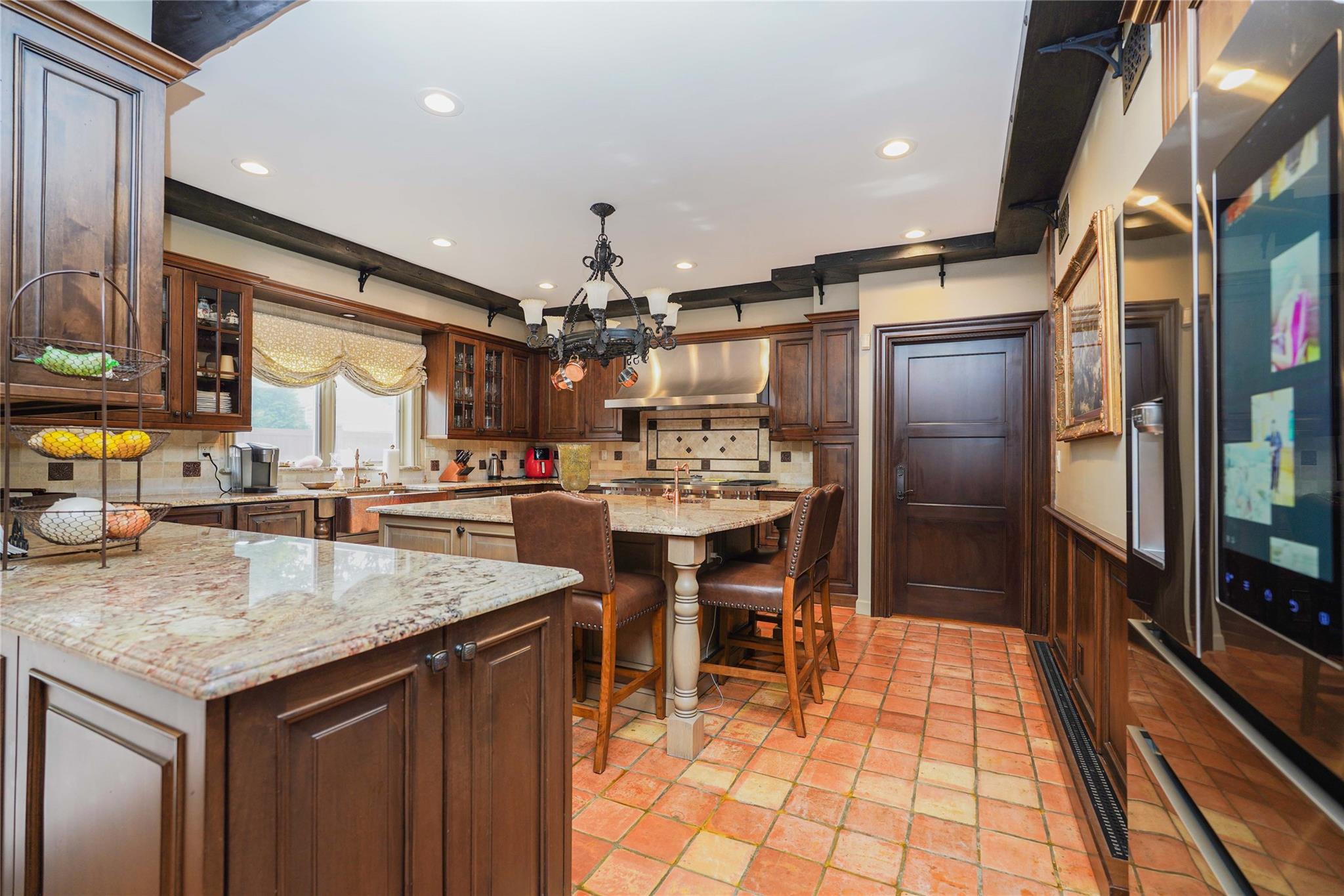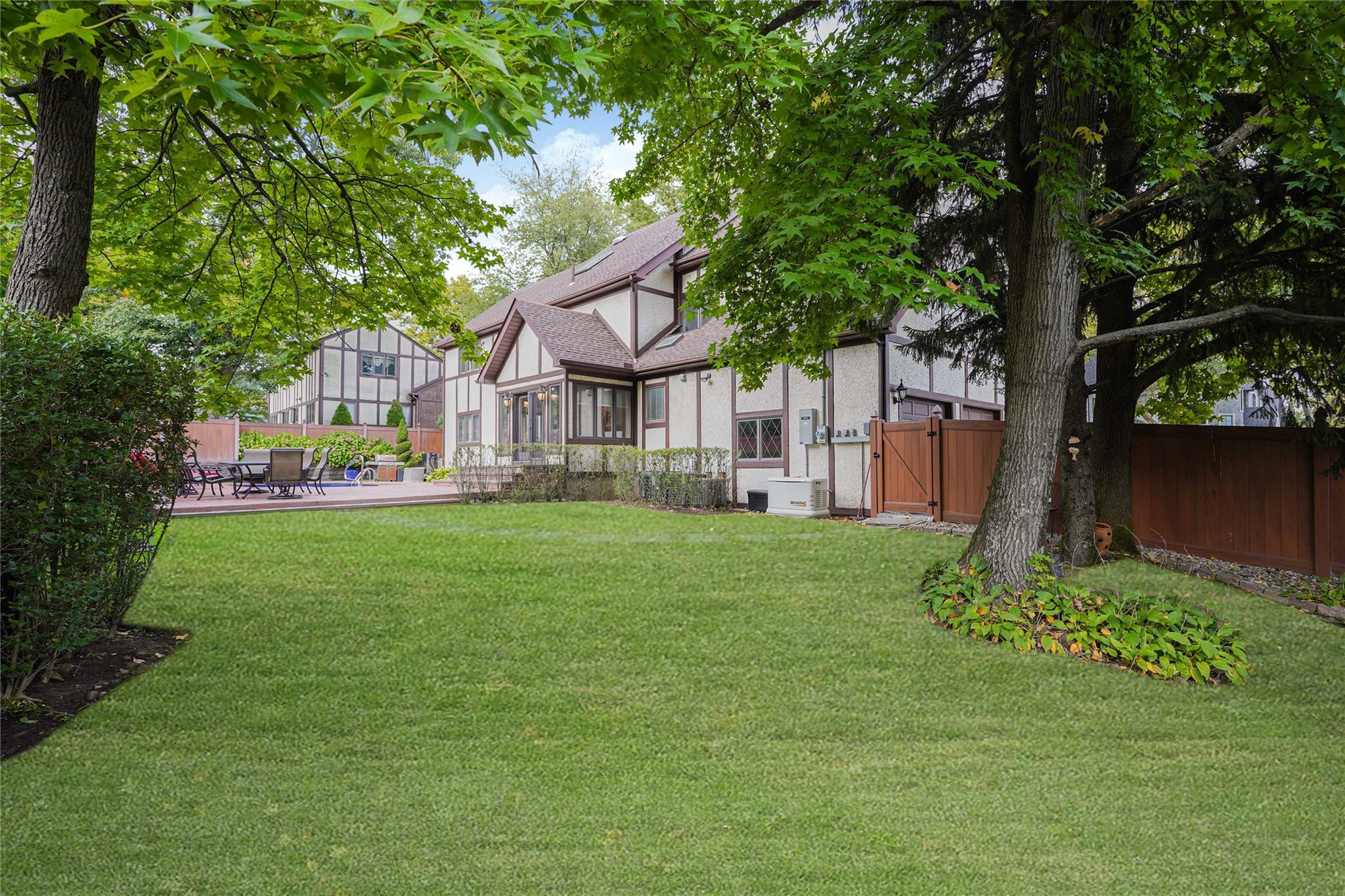 Nestled in one of the most desirable neighborhoods of Todt Hill, this exquisite 5-bedroom, 4-bath Tudor home masterfully blends classic charm with modern sophistication. Upon arrival, you're greeted by an impressive facade and a two-car garage. Step into the grand entryway, where a magnificent staircase sweeps upward, creating an immediate sense of luxury. The formal living room features soaring wood-beamed ceilings, blending classic Tudor character with modern appeal. A beautiful office off the entryway provides a private and refined space for work, complete with custom built-in bookcases. At the heart of the home, the chef's kitchen shines with a stunning island, high-end appliances, and ample seating for casual dining. The kitchen flows into the adjacent formal dining room, perfect for entertaining. Sliding glass doors lead to a beautifully landscaped backyard oasis with a saltwater pool, ideal for outdoor gatherings or peaceful relaxation. Set apart from the main living areas, the family den on the first floor offers a comfortable atmosphere for unwinding, featuring a gas fireplace and large windows that invite natural light. Upstairs, the primary suite serves as a true retreat with a grand fireplace, two spacious walk-in closets, and a luxurious marble bathroom complete with a soaking tub and separate shower. Three additional bedrooms fill the second floor. The top level, accessed via a continuation of the elegant staircase, features another bedroom, a dressing room, and a den—creating an ideal second suite Complete with a backup generator and sophisticated details throughout, this home offers both timeless elegance and modern comforts. Truly, this home has it all.