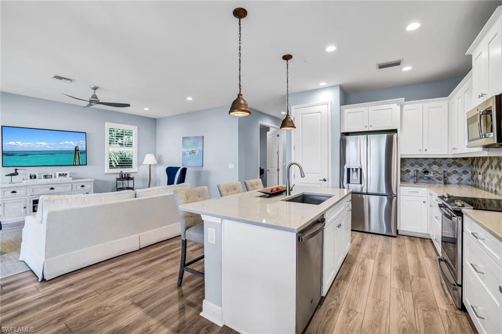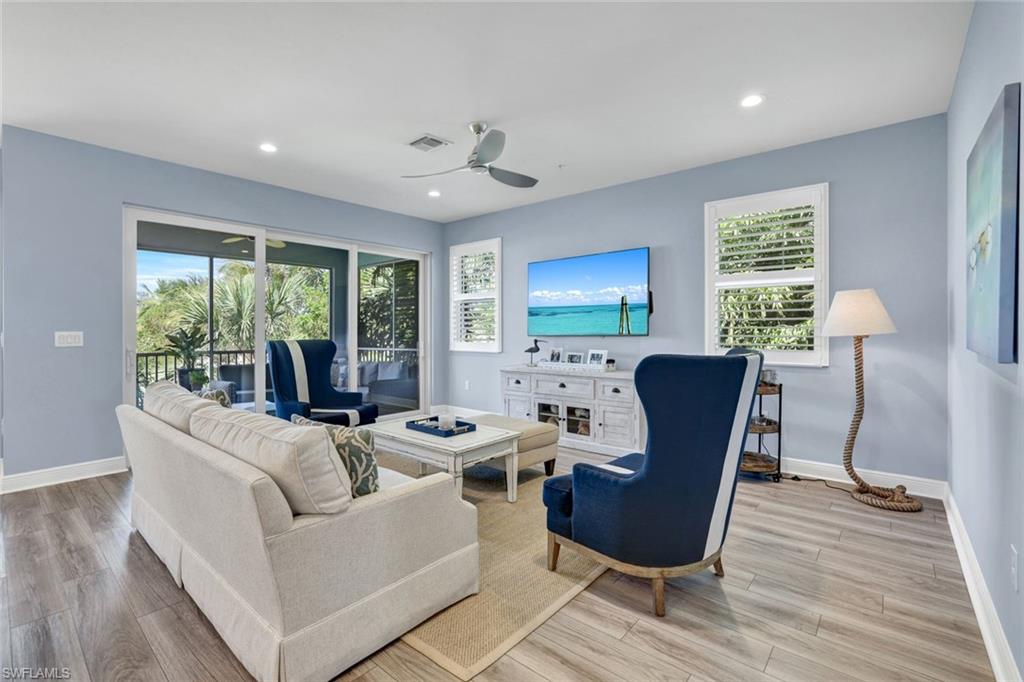 Lakeview and Western Exposure for Naples Sunsets! Seychelles built by Neal Communities with luxury British West Indies architecture. PARTIALLY FURNISHED! 2nd story carriage home located 5 minutes to downtown Naples/5th Avenue and the white sandy beaches of the Gulf. This light and airy open-concept Windemere floor plan unit is located in private cul-de-sac featuring 2 large bedrooms + Den (furnished) 2 full bathrooms and 1 car garage with long driveway for guests. Loaded with luxury upgrades, plantation shutters, including porcelain stone look flooring, chef's eat-in kitchen, dining room, white cabinets with soft close cabinetry, under mount lighting, designer backsplash, contemporary white quartz countertops, LG stainless refrigerator, appliances, and a center island. The spacious master bedroom and spa-like walk-in shower bath is elegantly appointed with double vanity, and has an oversized walk-in-closet, washer/dryer/laundry room. One of the most desirable features of this home is the lanai with TV overlooking the beautiful lakeview. Seychelles features amenities that included an oversized resort style heated pool and spa, fitness center featuring impact floors, Matrix equipment and free weights, fire pit, outdoor gas grill and clubhouse for social gatherings! Convenient location to downtown Naples, I-75 and airports.