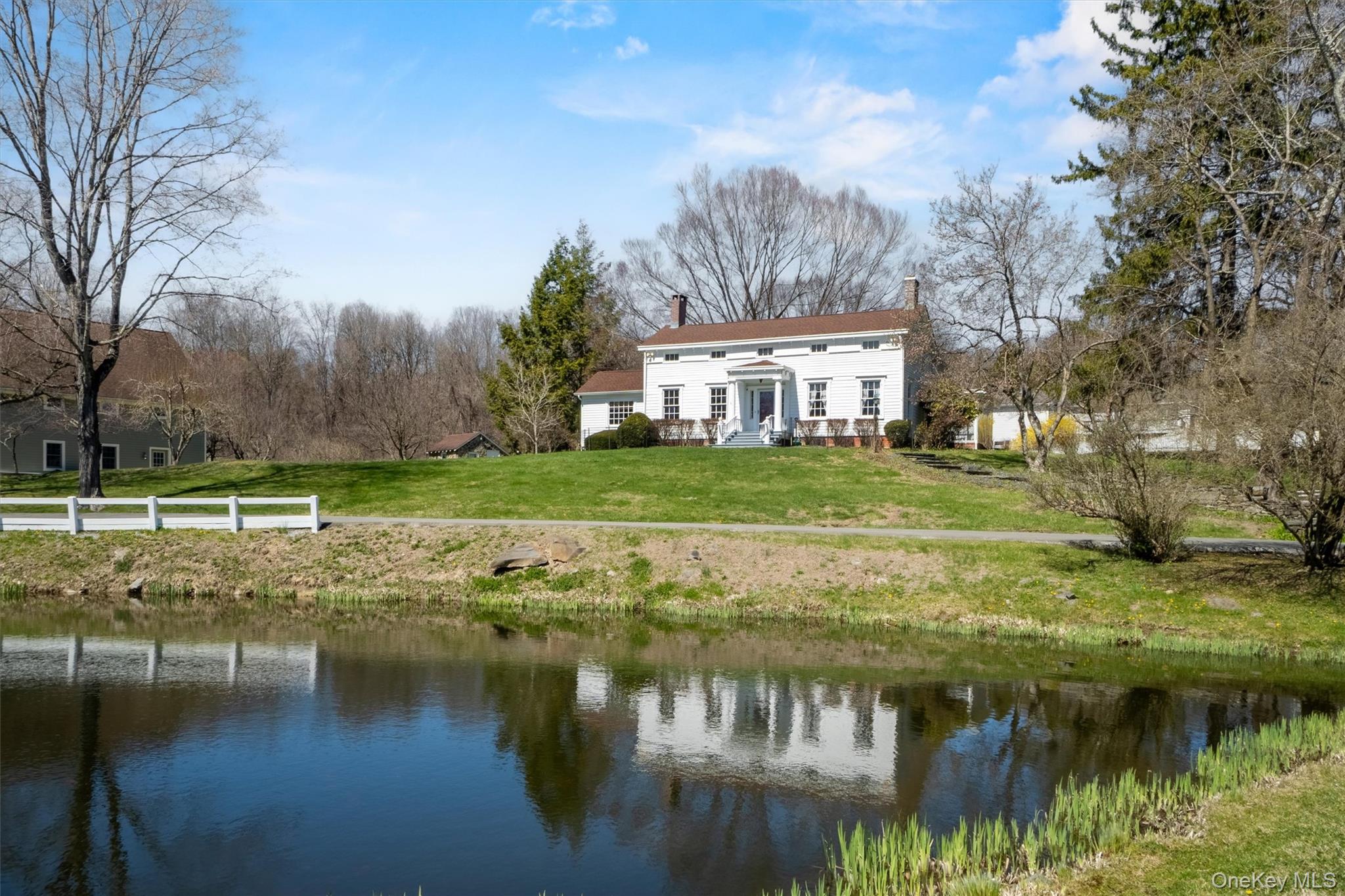 The former Gilbert Dairy Farm provides the backdrop for this legendary Dutchess County compound and the rare opportunity to own a piece of New York, history while benefiting from an income-producing apartment/art studio. This Center-Hall, Federal Colonial Farmhouse, built circa 1820, is an outstanding example of early Greek Revival Architecture that has been lovingly restored and preserved for the ages. It has all the charm of a bygone era with all the modern amenities, making it the perfect place to spend your weekends--or an entire lifetime. Offering both intimacy and grandeur, this home is breathtaking to all who enter. Original wood molding, wide board floors and a working fireplace in the parlor make this home something out of a Norman Rockwell painting. Graced with an exquisitely preserved, colonial kitchen, this home comes complete with exposed wooden beams, an open brick hearth and a Dutch door that leads to a screened side porch from which to enjoy mature trees and a beautiful landscape. This unique home boasts an 18th Century Colonial Cage bar in its basement. Enjoy the revelry of "The Tipsy Crow" with family and friends along with the fruits of a nearby wine cellar. A first-floor sitting room can be easily converted to a bedroom, allowing one to age in place with an adjoining bathroom, complete with an accessible shower. A roaring creek cuts through the heart of this estate of nearly three acres while the home is mirrored by a pond of glass, filled with fish and surrounded by daffodils in the spring and dragon lilies in the summer. A slate and stone patio allow for full enjoyment of this stunning property at every angle. The property boasts a pond house for enjoying placid views in the summer and "Rose Cottage, " a sweet and charming abode where one can read a good book and escape the demands of the day. While away your summer evenings as you dine at the stone table amid an orchard of fruit trees--while the youngsters toast marshmallows over the nearby firepit and prepare to spend the night in the custom-made treehouse, complete with a zipline. A stately and expertly constructed two-car garage boasts a studio apartment above it--an ideal, creative workspace or an income-producing, living space for a caretaker, adult child, in-law or other lucky tenant. Located in the heart of the historic Mid-Hudson Valley, this exceptional property is just minutes from Metro North and the Taconic State Parkway. Hyde Park's Vanderbilt Mansion, FDR Library and the Culinary Institute of America are just a few of the National treasures within reach of this extraordinary home.