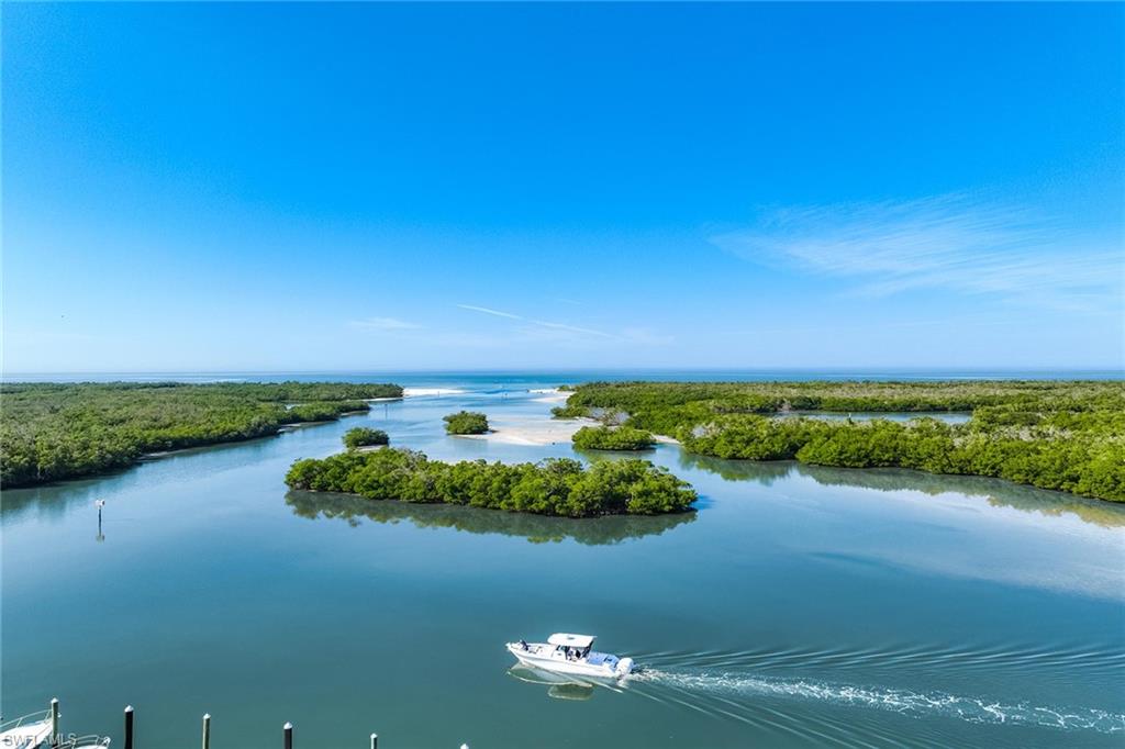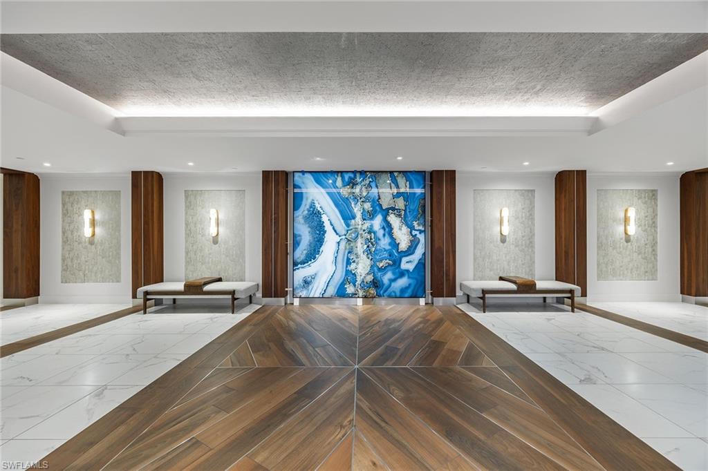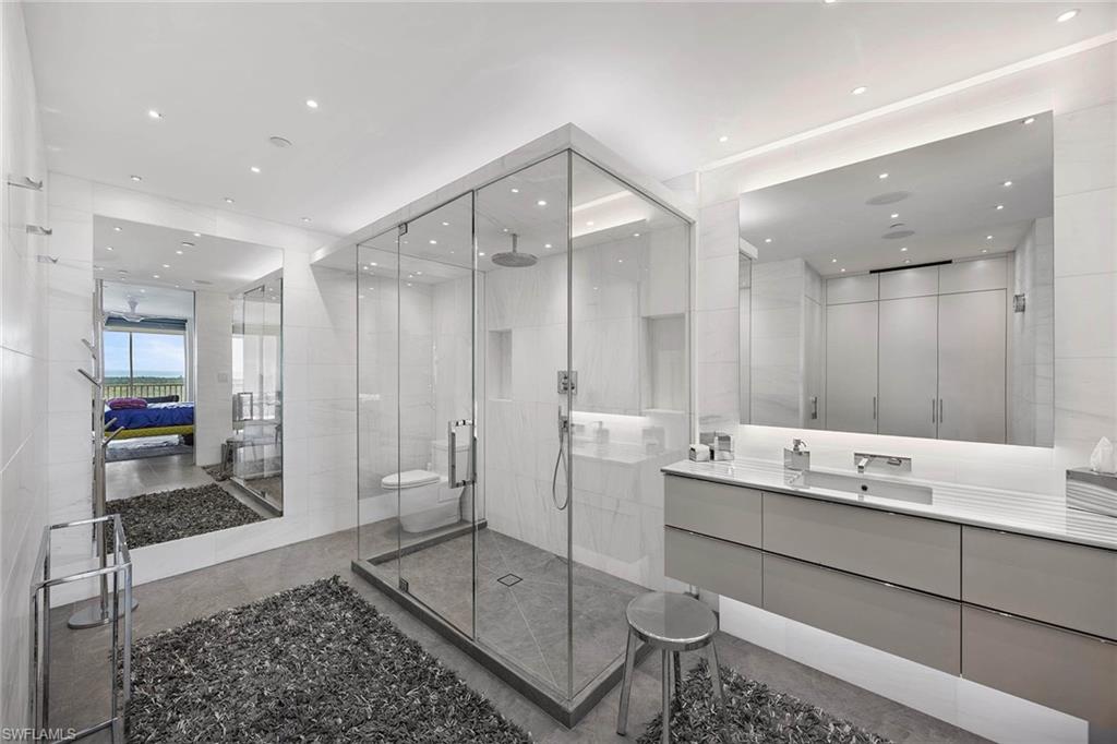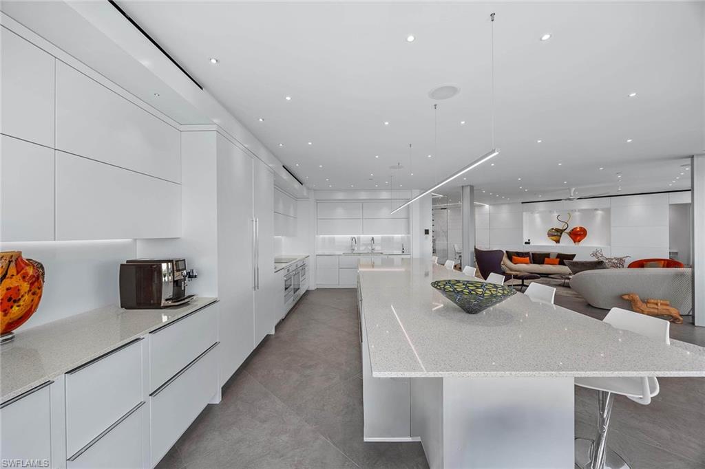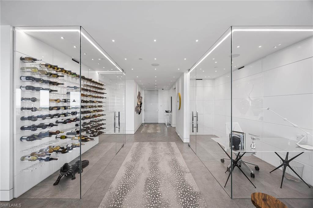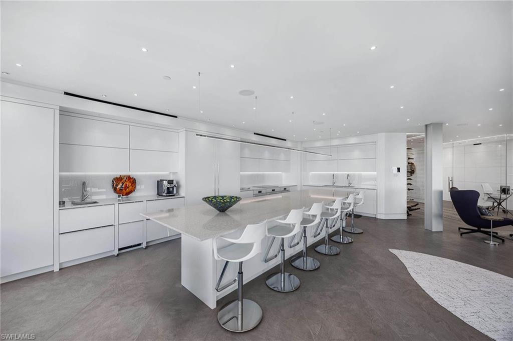 A refined expression of coastal living, this modern masterpiece has been meticulously reimagined to balance elegance, innovation and comfort, all set against the breathtaking backdrop of the Gulf and Wiggins Pass. The chef’s kitchen is a statement in sophistication, featuring vertical-opening custom cabinetry with ambient under-cabinet LED lighting, a full suite of Miele appliances including three ovens and warming drawers, a sleek cooktop and Sub-Zero refrigeration. At the center, a striking island with double-stacked cabinetry and a discreetly integrated television lift grounds the space with form and function. Throughout the home, expansive 29-by-59-inch Italian porcelain tile rests atop a sound-dampening layer, ensuring a tranquil ambiance. Above, a suspended ceiling constructed with dual layers of drywall, acoustic mastic and a level five finish offers exceptional sound isolation, echoing the home’s thoughtful design. Impact-resistant windows frame sunlit interiors enhanced by 140 dimmable mini-LEDs and halogen art lights, creating an atmosphere of curated refinement. The primary suite is a serene retreat, complete with built-in cabinetry, sound-insulating walls, sweeping Gulf views and a spa-inspired bath featuring triple showerheads, marble-topped vanities and dual benches. Two additional en-suite bedrooms and a glass-accented den offer versatile living options, while the designer-lit lanai, equipped with electric storm shutters, extends the elegance outdoors. A rare offering where modern craftsmanship meets coastal serenity, this residence is an embodiment of timeless luxury.