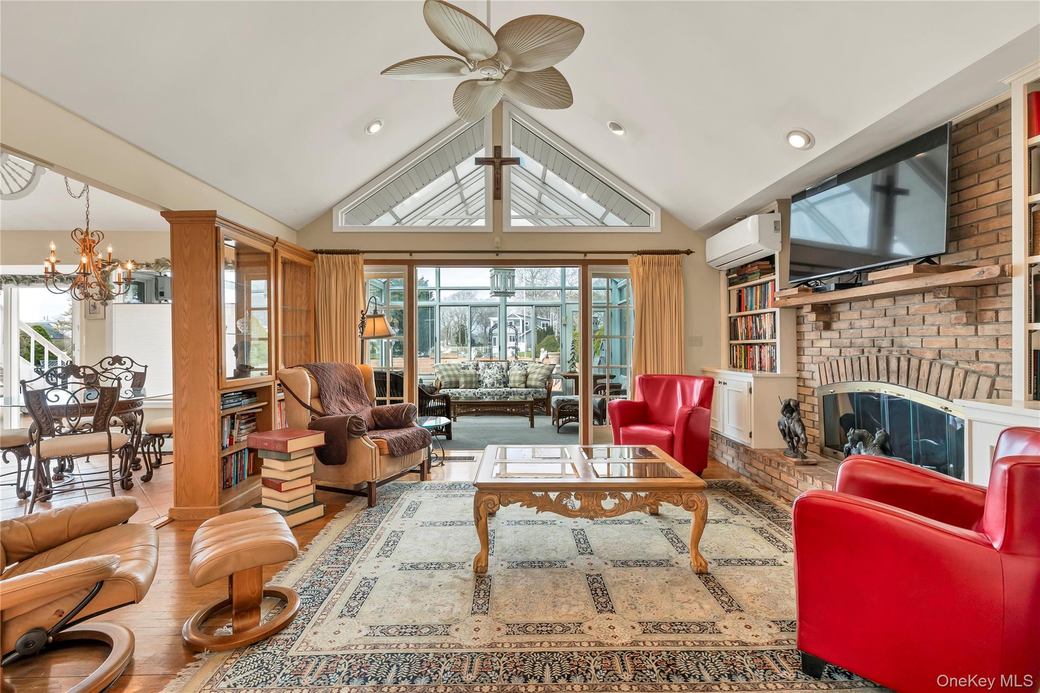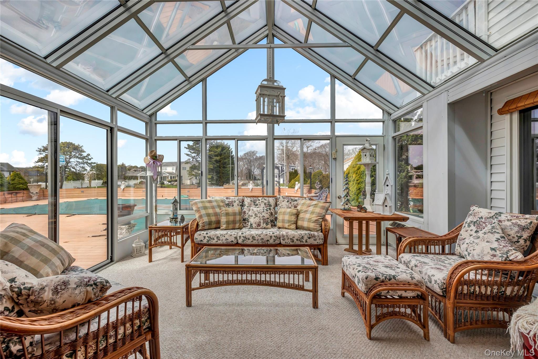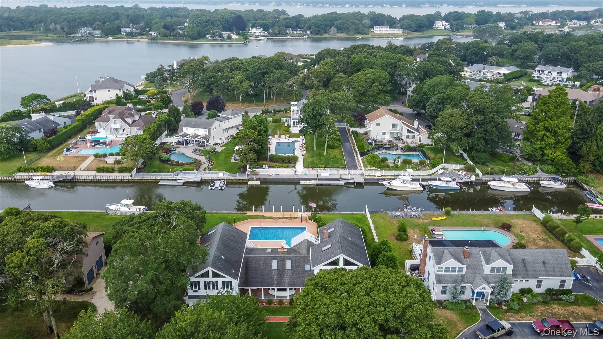 Located in Hampton Bays’ exclusive Old Harbor Colony community on a quiet street, 20 Oak Lane is a short drive to ocean beaches, waterfront dining, and Hampton Bays town, and it’s not far from Southampton, East Hampton, and Long Island wine country. With views of Shinnecock Bay and the ocean inlet, this home has 4, 263-square feet of living space, five large bedrooms (two are primary suites), four full bathrooms, one half bath, sunroom, recreation room, a newly lined (2024) pool, waterfront deck, and a canal with a 120-foot composite bulkhead. The beautifully landscaped yard has an inground sprinkler system and large deck surrounding the pool with loads of space for entertainment, outdoor dining, a pool shed, and more. Enter through the foyer to the main level where cathedral ceilings and recessed lighting adorn the family room, kitchen, and living room, and dining room. The huge kitchen has loads of cabinets, kitchen Island, new stainless-steel stove, new stainless-steel refrigerator, and two additional wall ovens. The kitchen sliding doors lead out to the composite deck and pool. Hardwood floors flow from the family room to the living room, and into the dining room. There is a gas fireplace in the family room and a wood-burning fireplace in the living room. From the family room, French doors lead out to the sunroom where you can catch some rays indoors while enjoying water views. The butler’s pantry offers even more cabinet space, an additional sink, a second refrigerator, and access to the two-car garage and laundry room. On the south side of the main level is a bedroom with hardwood floors, water views, and access to a full bathroom just outside the bedroom door. On the north side of the main level is the first of two primary bedrooms, which includes an ensuite bathroom with a tub/shower combo, and hardwood floors. The room is large enough for a king-sized bed and more, and it has a walk-in plus two additional closets. On the other end of the home is the huge recreation room with access to the half bathroom. This large space is perfect for watching TV, playing board games, and other recreational activities. Upstairs, on the south side of the home you can enjoy maximum exposure to amazing water views inside the second primary bedroom, a private oasis accessible by elevator or through the exterior sliding glass doors. The suite includes a living room area, a bedroom area, mini-kitchen, spacious walk-in-closet, extra-large ensuite bathroom, and an upper-level deck. Cathedral ceilings add even more allure, and its sunny exposure bathes the suite in natural light. The bedroom area includes a gorgeous hardwood floor with more than enough space to include a king-sized bed and other furniture. The walk-in closet offers loads of places to hang clothes, store luggage, and more. The mini kitchen area includes a bar sink, cabinets, small refrigerator inside the cabinet, counter space, and a two-burner cooktop. The ensuite bathroom includes double sinks with lots of counter-space, separate shower and tub, loads of cabinet storage, and the toilet is inside a water closet for extra privacy. The living/lounge area has a gas fireplace and is large enough to fit a comfy couch, chairs, and a bistro table. You can take the elevator down to the kitchen or exit out through the sliding glass doors to a balcony/deck with amazing waterfront views. This deck includes steps down to the main-level deck and pool area. On the north end of the house is another upper level with two gorgeous and spacious bedrooms with cathedral ceilings, recessed lighting, and hardwood flooring. These rooms share a large Jack-and-Jill bathroom with a tiled shower, linen closet, and water closet for the toilet. The back bedroom includes a balcony with beautiful canal views.