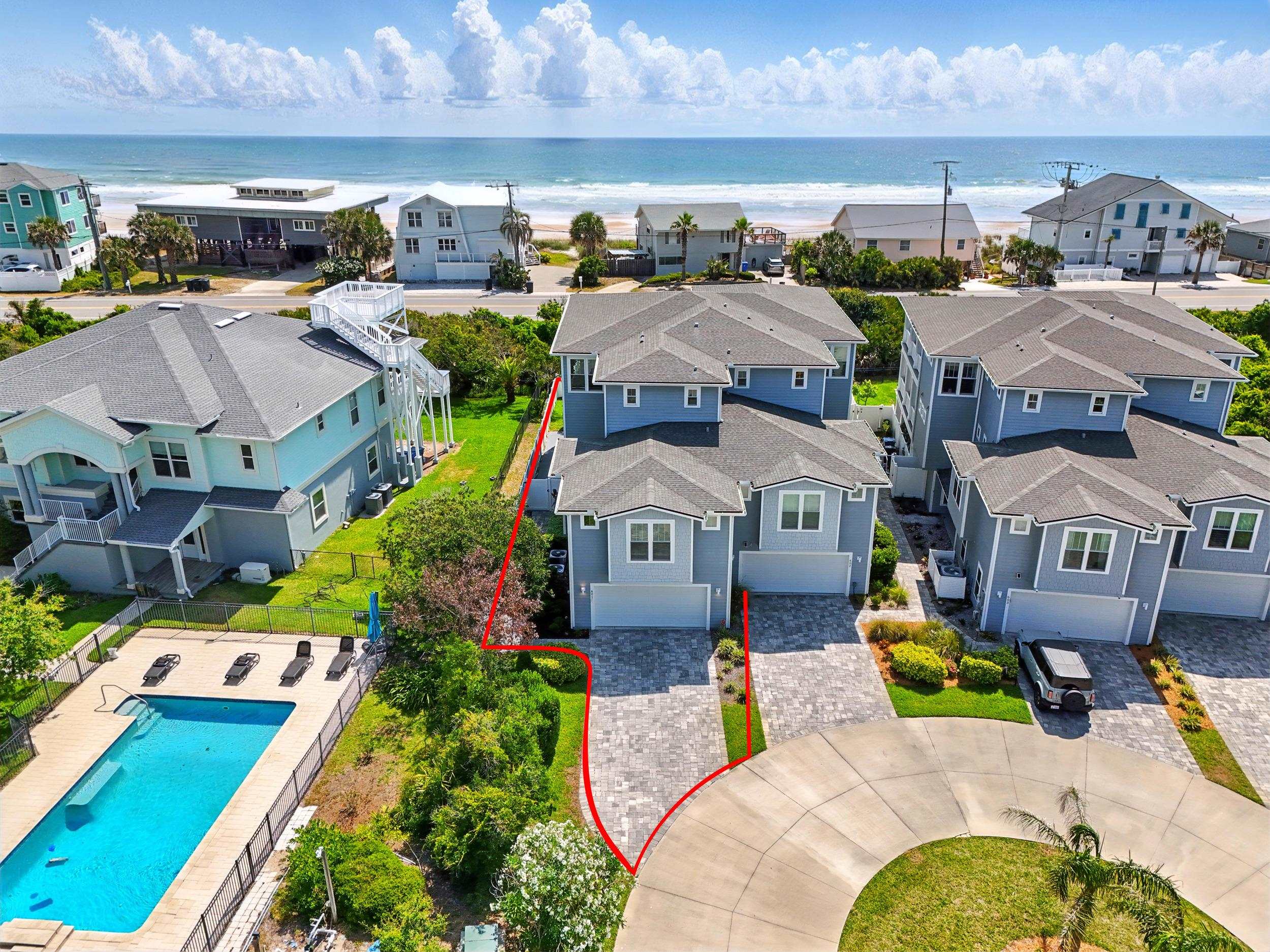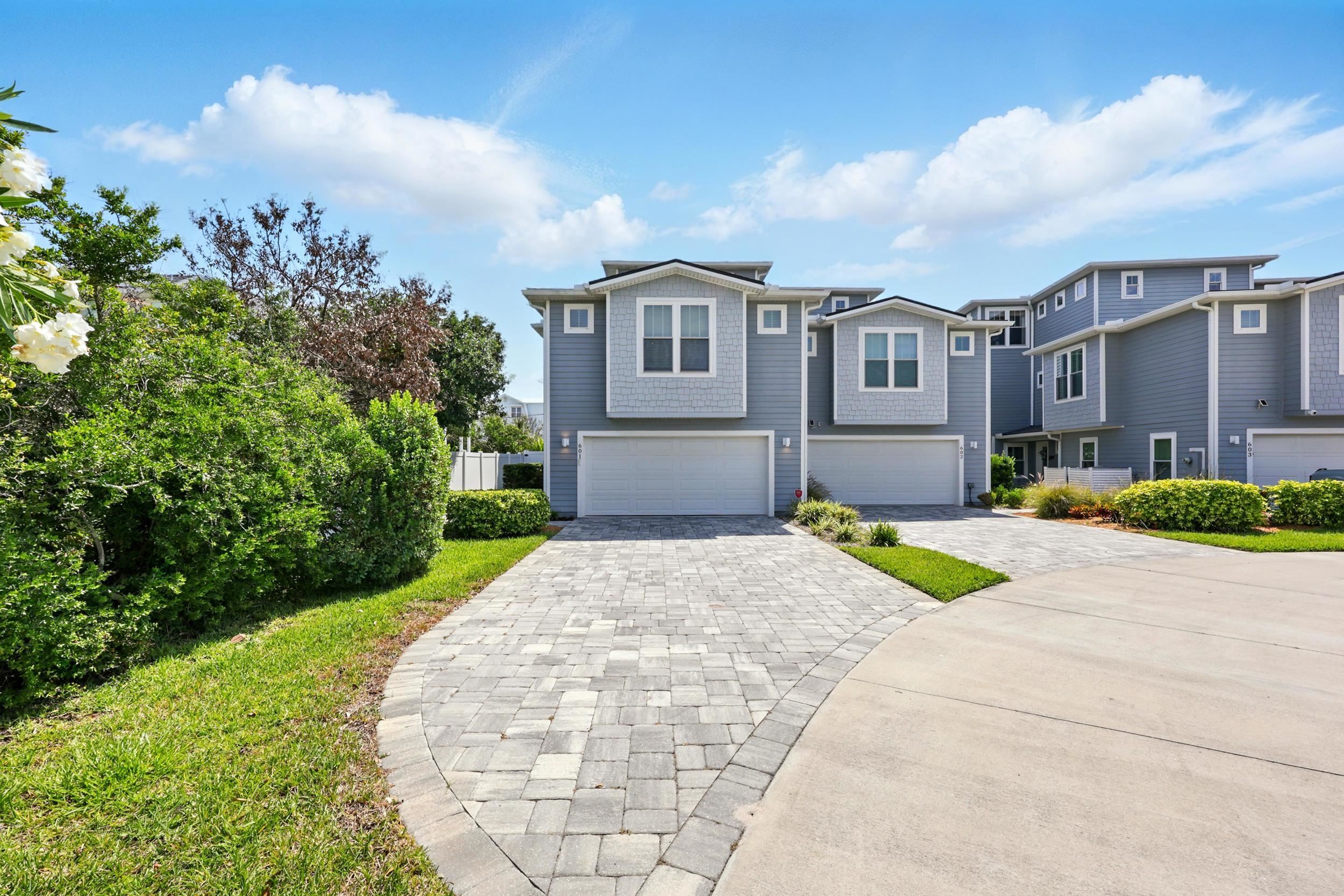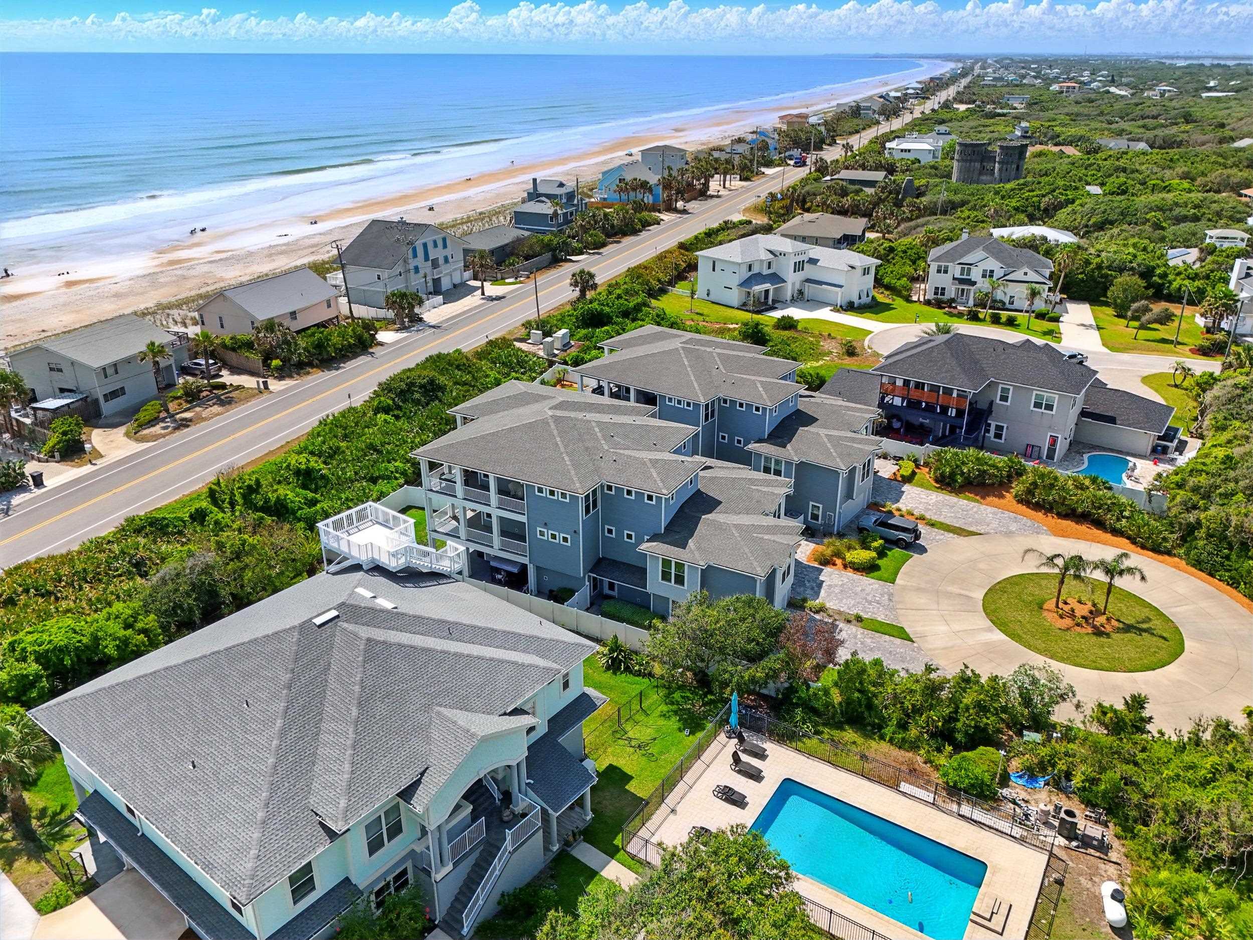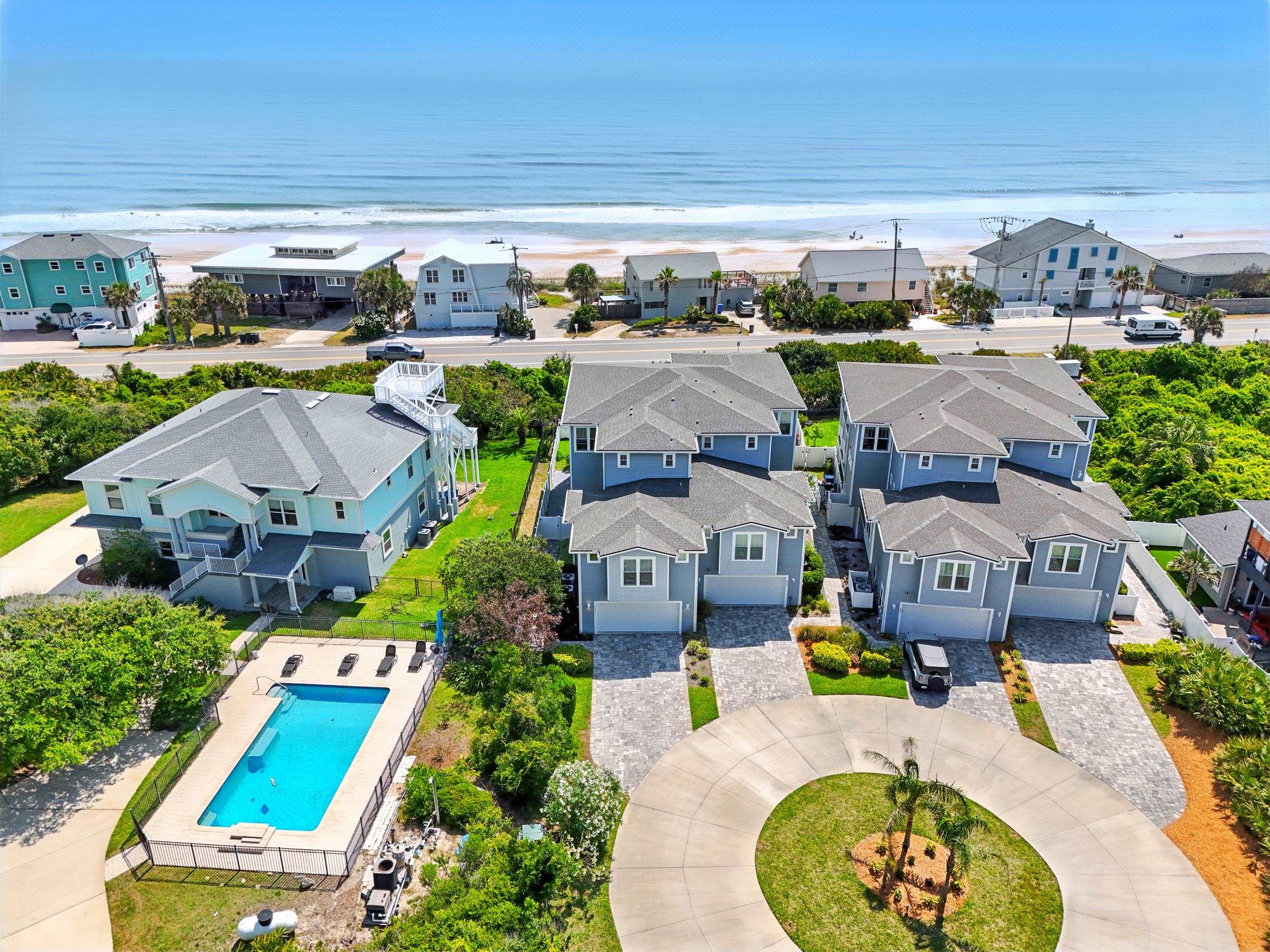 Experience the best of oceanside living in this exceptional three-story duplex, ideally situated just steps from the beach in a refined coastal townhome community. Offering 5 bedrooms, 4. 5 baths, and 3, 301 square feet of thoughtfully designed living space, this coastal retreat blends modern elegance with relaxed comfort. From the moment you arrive via the shared circular drive at the end of a cul de sac, you'll appreciate the privacy and convenience of dedicated pavered parking and an oversized two-car garage equipped with a built-in camera system. A private elevator provides seamless access to all three levels, while refined designer finishes elevate every space. The gourmet kitchen is a culinary delight featuring quartz countertops, upgraded cabinetry, a sleek tiled backsplash, and a full suite of stainless-steel appliances. The expansive great room flows effortlessly to a covered lanai—perfect for entertaining or enjoying the ocean breeze. The interior is adorned in fresh, neutral tones, enhanced by crown molding, custom lighting, recessed fixtures, and a blend of wood plank tile and hardwood floors. Multiple windows in each room, along with wrap-around balconies and three inviting covered decks, flood the home with natural light and offer stunning sunrise views. The primary suite is a luxurious sanctuary with a private deck, sweeping ocean views, and a spa-like bath featuring a large double walk-in shower, dual vanity with abundant cabinetry and a generous walk-in closet. Four additional guest bedrooms and three well-appointed baths provide ample space for family and visitors, while a dedicated laundry room adds everyday convenience. Additional highlights include a full irrigation system, a recently serviced septic tank (2024), a 3-year-old HVAC system, keyless entry, and an Xfinity security and camera system for peace of mind. Don’t miss this rare opportunity to own a beautifully crafted home where every detail has been considered. HOA allows for a minimum of 6 months for rentals.