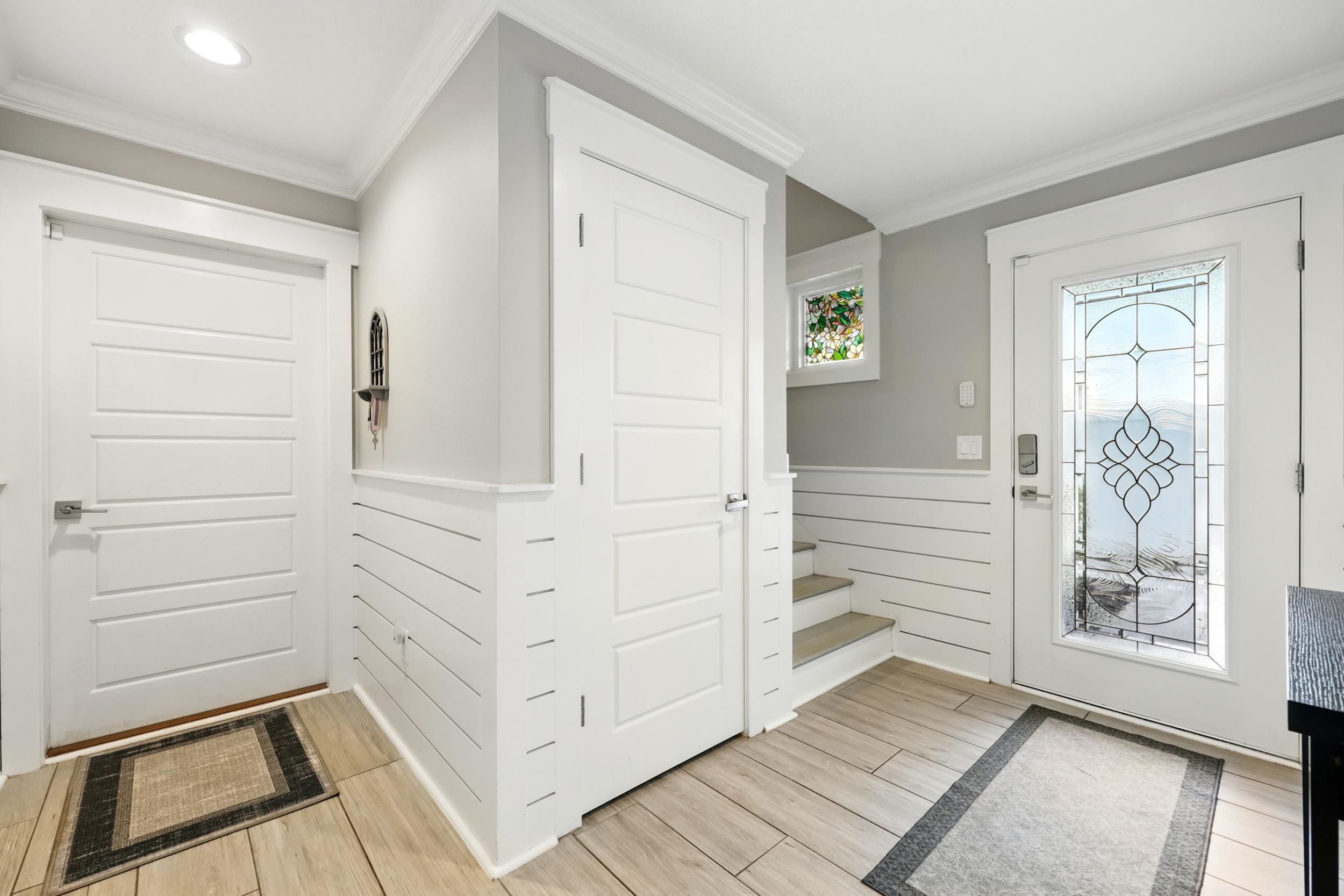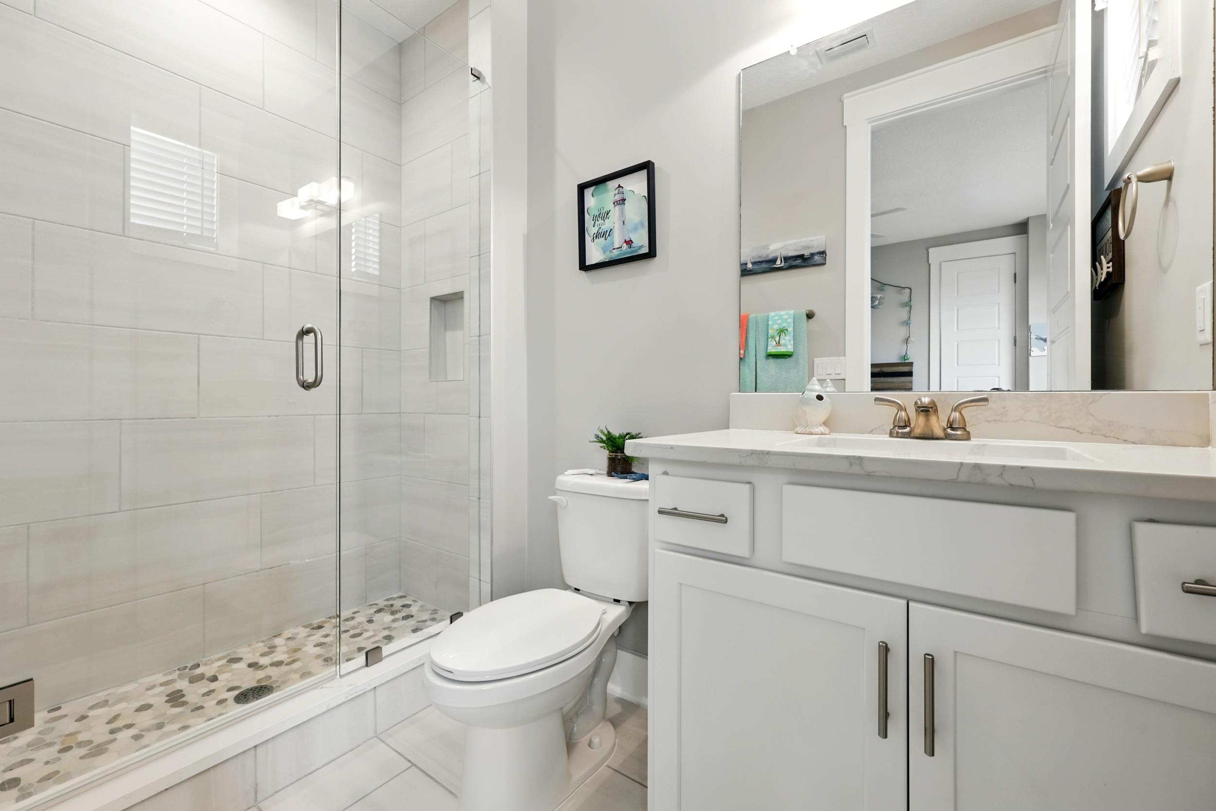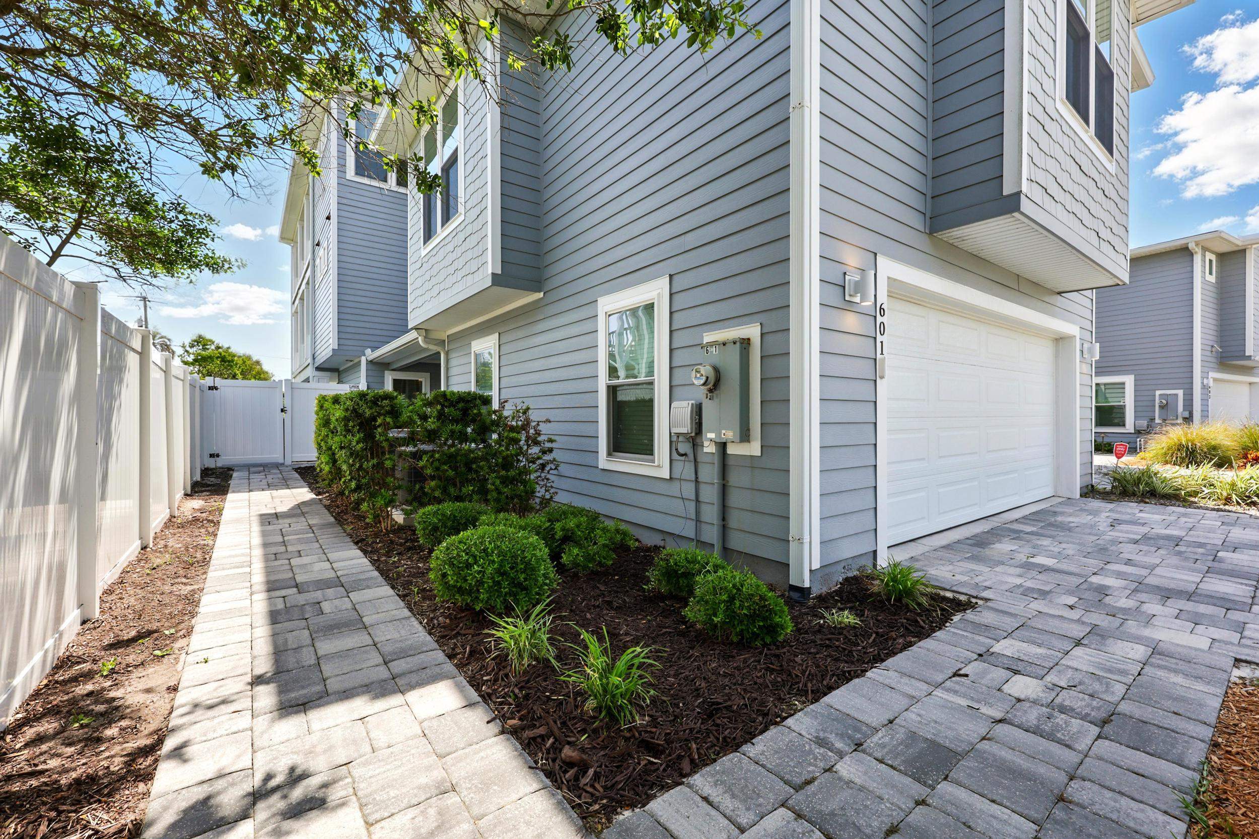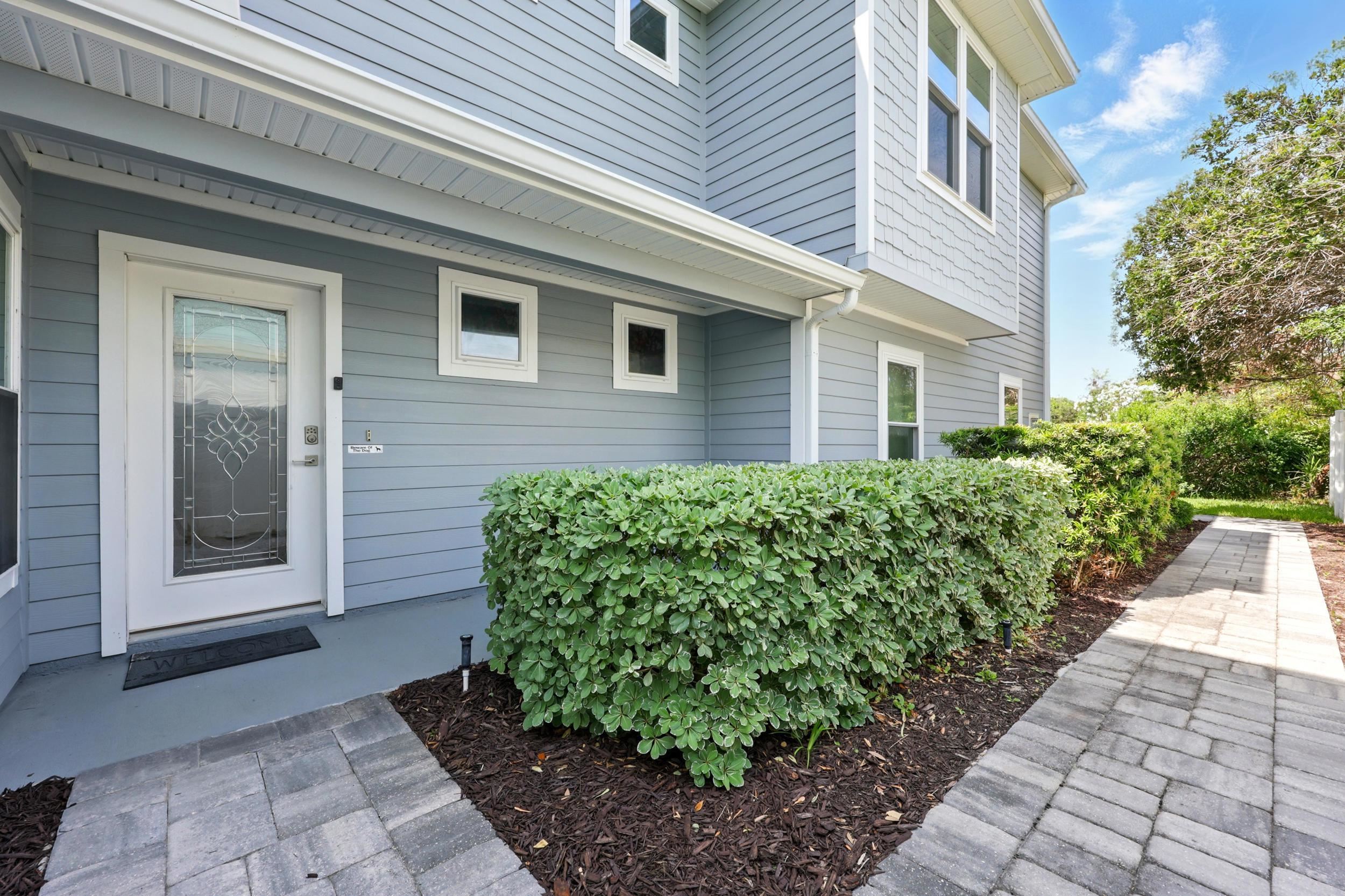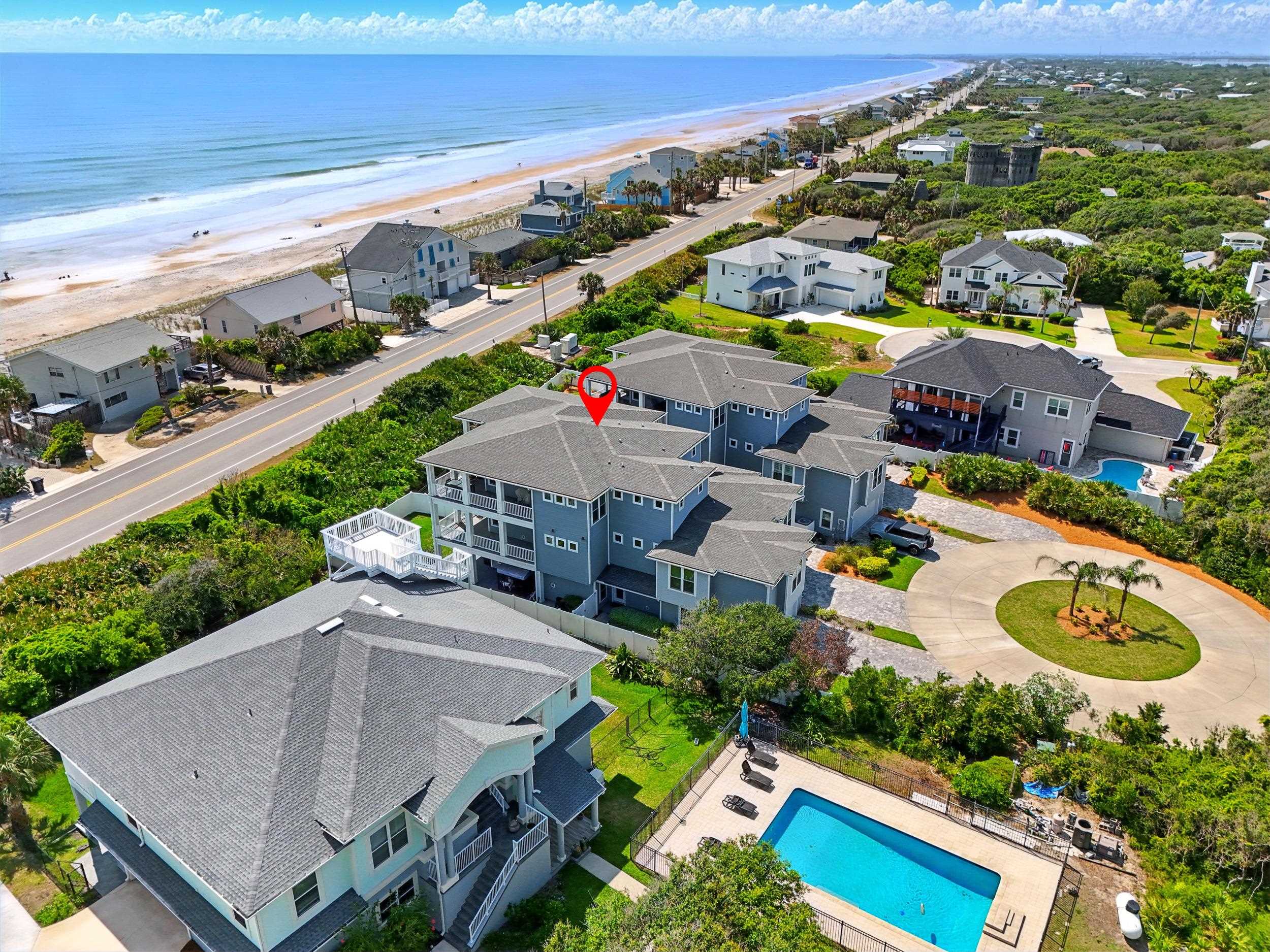 Experience the best of oceanside living in this exceptional three-story duplex, ideally situated just steps from the beach in a refined coastal townhome community. Offering 5 bedrooms, 4. 5 baths, and 3, 301 square feet of thoughtfully designed living space, this coastal retreat blends modern elegance with relaxed comfort. From the moment you arrive via the shared circular drive at the end of a cul de sac, you'll appreciate the privacy and convenience of dedicated pavered parking and an oversized two-car garage equipped with a built-in camera system. A private elevator provides seamless access to all three levels, while refined designer finishes elevate every space. The gourmet kitchen is a culinary delight featuring quartz countertops, upgraded cabinetry, a sleek tiled backsplash, and a full suite of stainless-steel appliances. The expansive great room flows effortlessly to a covered lanai—perfect for entertaining or enjoying the ocean breeze. The interior is adorned in fresh, neutral tones, enhanced by crown molding, custom lighting, recessed fixtures, and a blend of wood plank tile and hardwood floors. Multiple windows in each room, along with wrap-around balconies and three inviting covered decks, flood the home with natural light and offer stunning sunrise views. The primary suite is a luxurious sanctuary with a private deck, sweeping ocean views, and a spa-like bath featuring a large double walk-in shower, dual vanity with abundant cabinetry and a generous walk-in closet. Four additional guest bedrooms and three well-appointed baths provide ample space for family and visitors, while a dedicated laundry room adds everyday convenience. Additional highlights include a full irrigation system, a recently serviced septic tank (2024), a 3-year-old HVAC system, keyless entry, and an Xfinity security and camera system for peace of mind. Don’t miss this rare opportunity to own a beautifully crafted home where every detail has been considered. HOA allows for a minimum of 6 months for rentals.