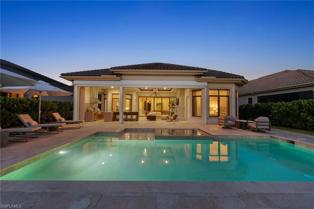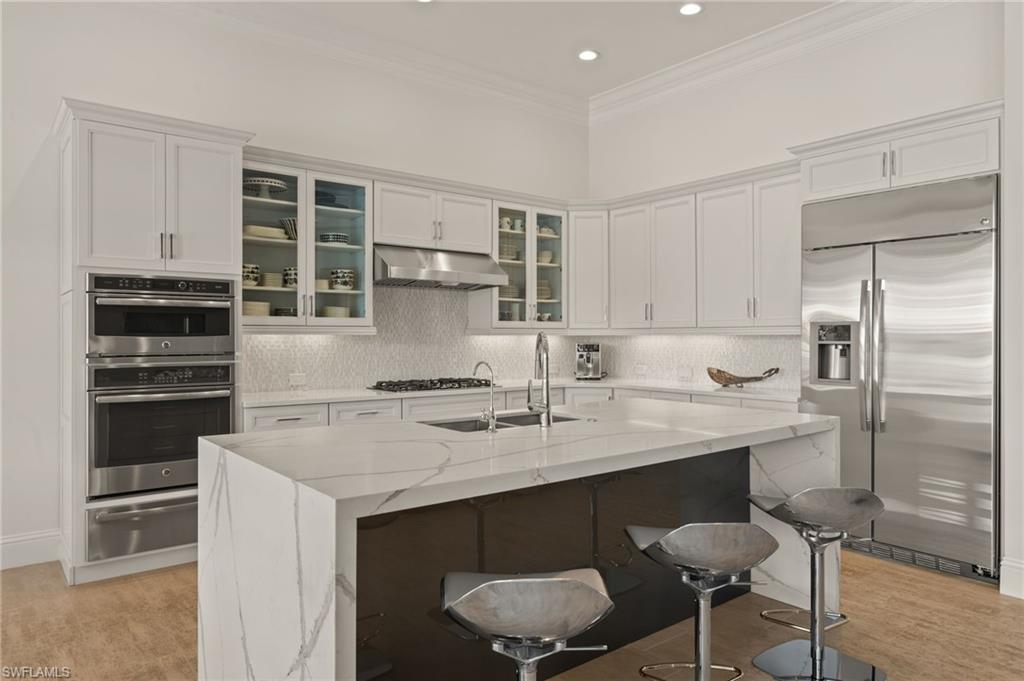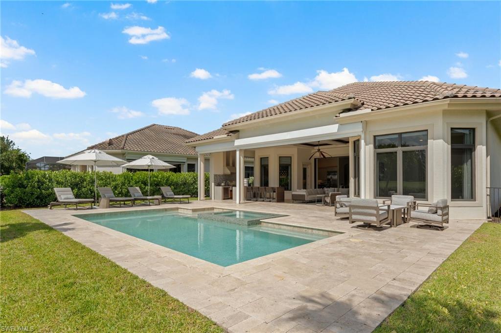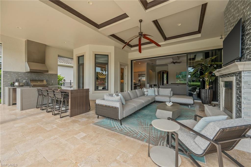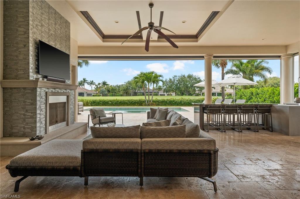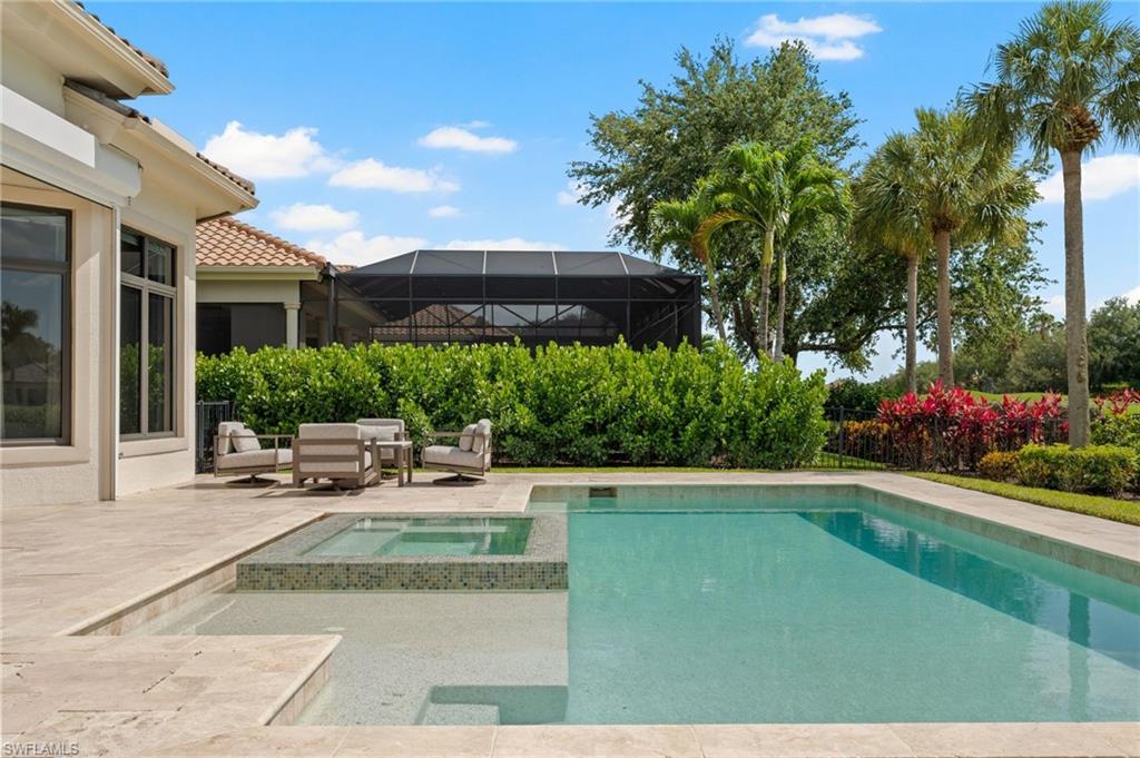 IMMEDIATE GOLF AVAILABLE - SKIP THE WAITLIST! Experience the timeless merging of chic elegance and clean lines all within the existing open spaces of this updated villa. Reimagined by Jorge Castillo Interiors/Miami, every detail has been meticulously curated to create a refined, tranquil space that’s both sophisticated and inviting. New floors were added to match the main area flooring so that each room merges effortlessly. The sleek, tailored millwork of the custom built-ins thoughtfully integrated throughout the home offers both aesthetic appeal and practical storage. The split floor plan features an open great room with gathering and dining areas as well as a gourmet kitchen boasting a large new island plus stainless steel appliances. The high design continues with a go-to wine room/game room anchored by built-in wine coolers. The primary suite has been redesigned with two re-styled walk-in closets, new shower tile and shower glass, new faucets and an enviable view. Many new designer light fixtures and fans are featured throughout as well as a renovated, air-conditioned 3-car garage with new epoxy flooring and insulated ceiling and doors. Take it outside for amazing sunset views from an expansive lanai that is the envy of the area. All new retractable screens, new tile surrounds for fireplace and grill backsplash, new cabinetry and waterfall countertops with a separate new counter for al fresco dining. Surrounded by new landscaping and open golf course views, there is no need to go inside!