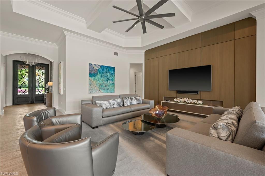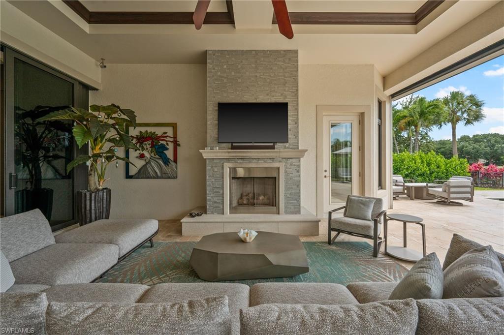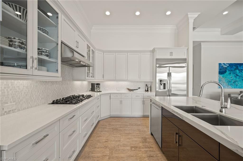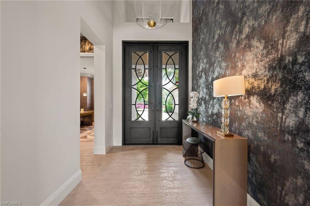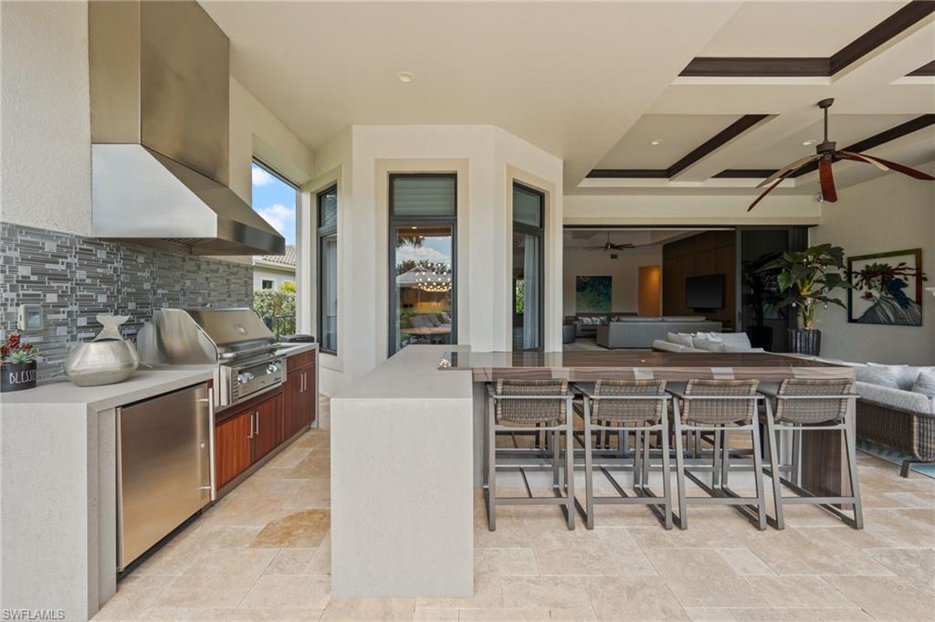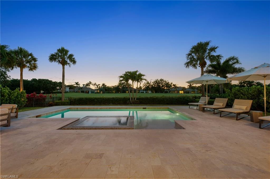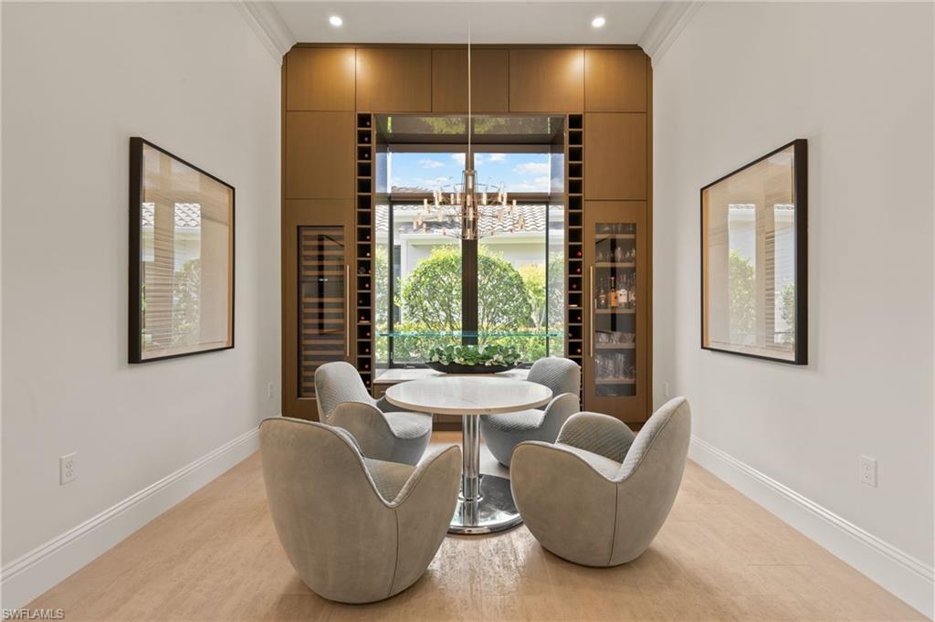 IMMEDIATE GOLF AVAILABLE - SKIP THE WAITLIST! Experience the timeless merging of chic elegance and clean lines all within the existing open spaces of this updated villa. Reimagined by Jorge Castillo Interiors/Miami, every detail has been meticulously curated to create a refined, tranquil space that’s both sophisticated and inviting. New floors were added to match the main area flooring so that each room merges effortlessly. The sleek, tailored millwork of the custom built-ins thoughtfully integrated throughout the home offers both aesthetic appeal and practical storage. The split floor plan features an open great room with gathering and dining areas as well as a gourmet kitchen boasting a large new island plus stainless steel appliances. The high design continues with a go-to wine room/game room anchored by built-in wine coolers. The primary suite has been redesigned with two re-styled walk-in closets, new shower tile and shower glass, new faucets and an enviable view. Many new designer light fixtures and fans are featured throughout as well as a renovated, air-conditioned 3-car garage with new epoxy flooring and insulated ceiling and doors. Take it outside for amazing sunset views from an expansive lanai that is the envy of the area. All new retractable screens, new tile surrounds for fireplace and grill backsplash, new cabinetry and waterfall countertops with a separate new counter for al fresco dining. Surrounded by new landscaping and open golf course views, there is no need to go inside!