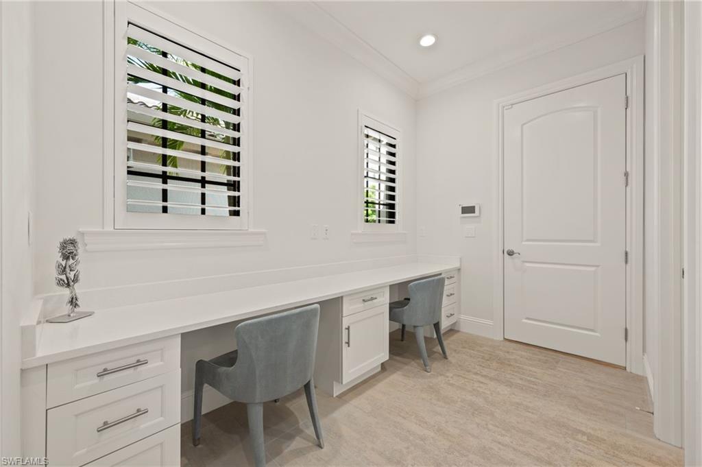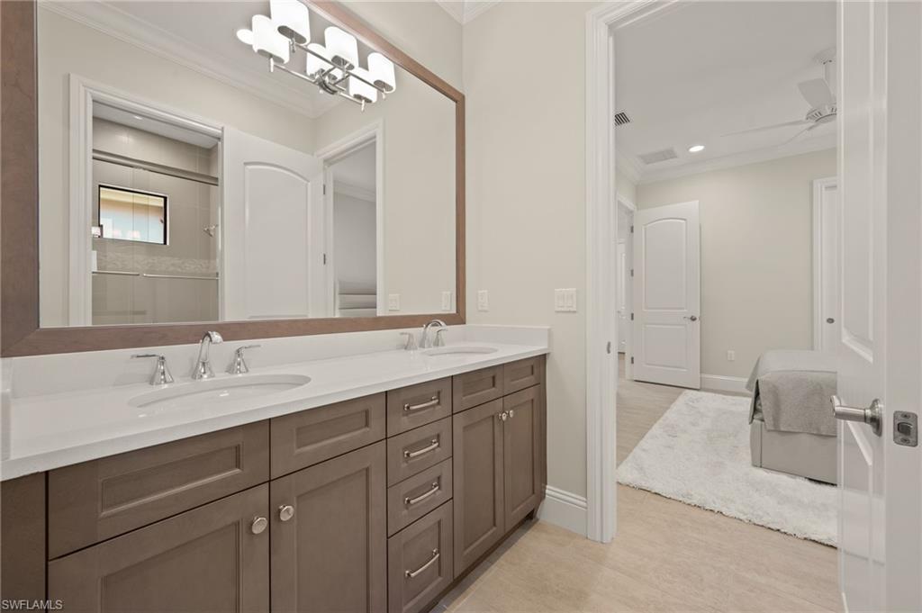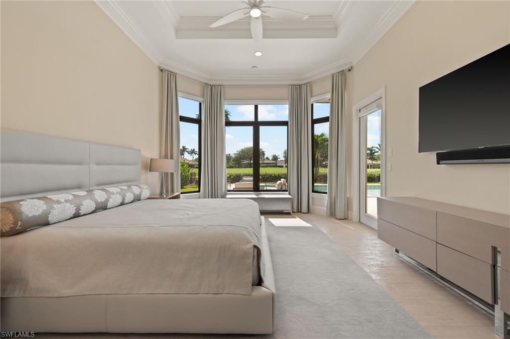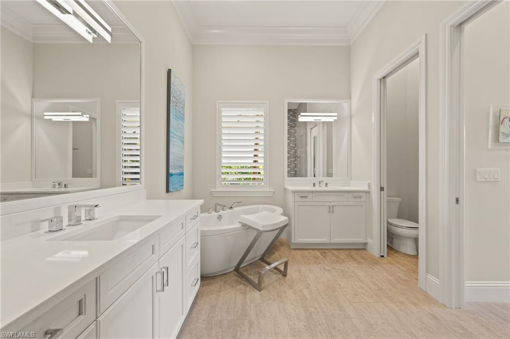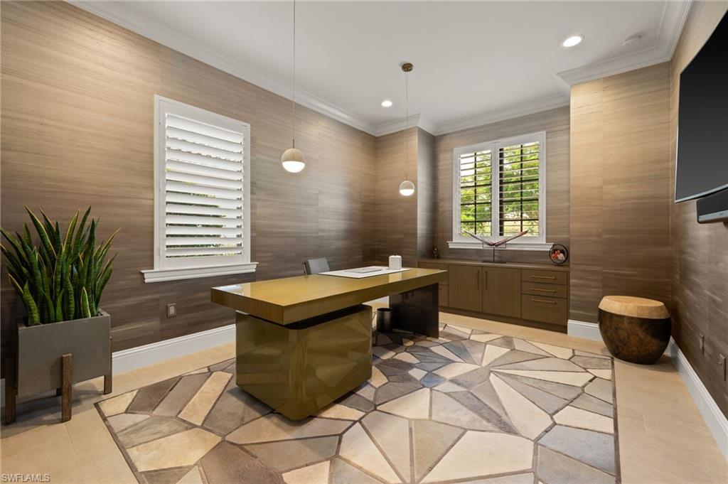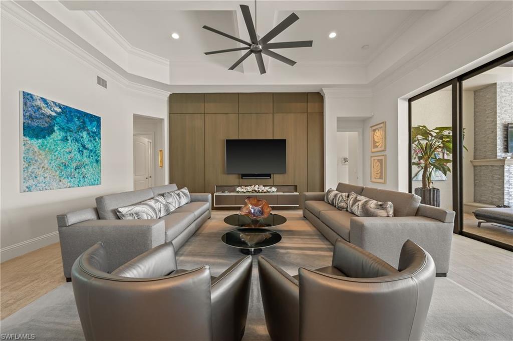 IMMEDIATE GOLF AVAILABLE - SKIP THE WAITLIST! Experience the timeless merging of chic elegance and clean lines all within the existing open spaces of this updated villa. Reimagined by Jorge Castillo Interiors/Miami, every detail has been meticulously curated to create a refined, tranquil space that’s both sophisticated and inviting. New floors were added to match the main area flooring so that each room merges effortlessly. The sleek, tailored millwork of the custom built-ins thoughtfully integrated throughout the home offers both aesthetic appeal and practical storage. The split floor plan features an open great room with gathering and dining areas as well as a gourmet kitchen boasting a large new island plus stainless steel appliances. The high design continues with a go-to wine room/game room anchored by built-in wine coolers. The primary suite has been redesigned with two re-styled walk-in closets, new shower tile and shower glass, new faucets and an enviable view. Many new designer light fixtures and fans are featured throughout as well as a renovated, air-conditioned 3-car garage with new epoxy flooring and insulated ceiling and doors. Take it outside for amazing sunset views from an expansive lanai that is the envy of the area. All new retractable screens, new tile surrounds for fireplace and grill backsplash, new cabinetry and waterfall countertops with a separate new counter for al fresco dining. Surrounded by new landscaping and open golf course views, there is no need to go inside!