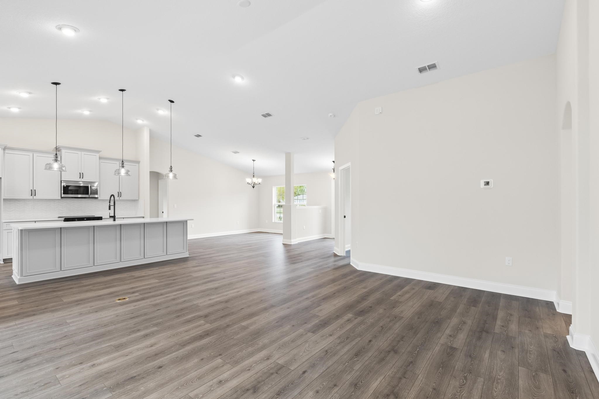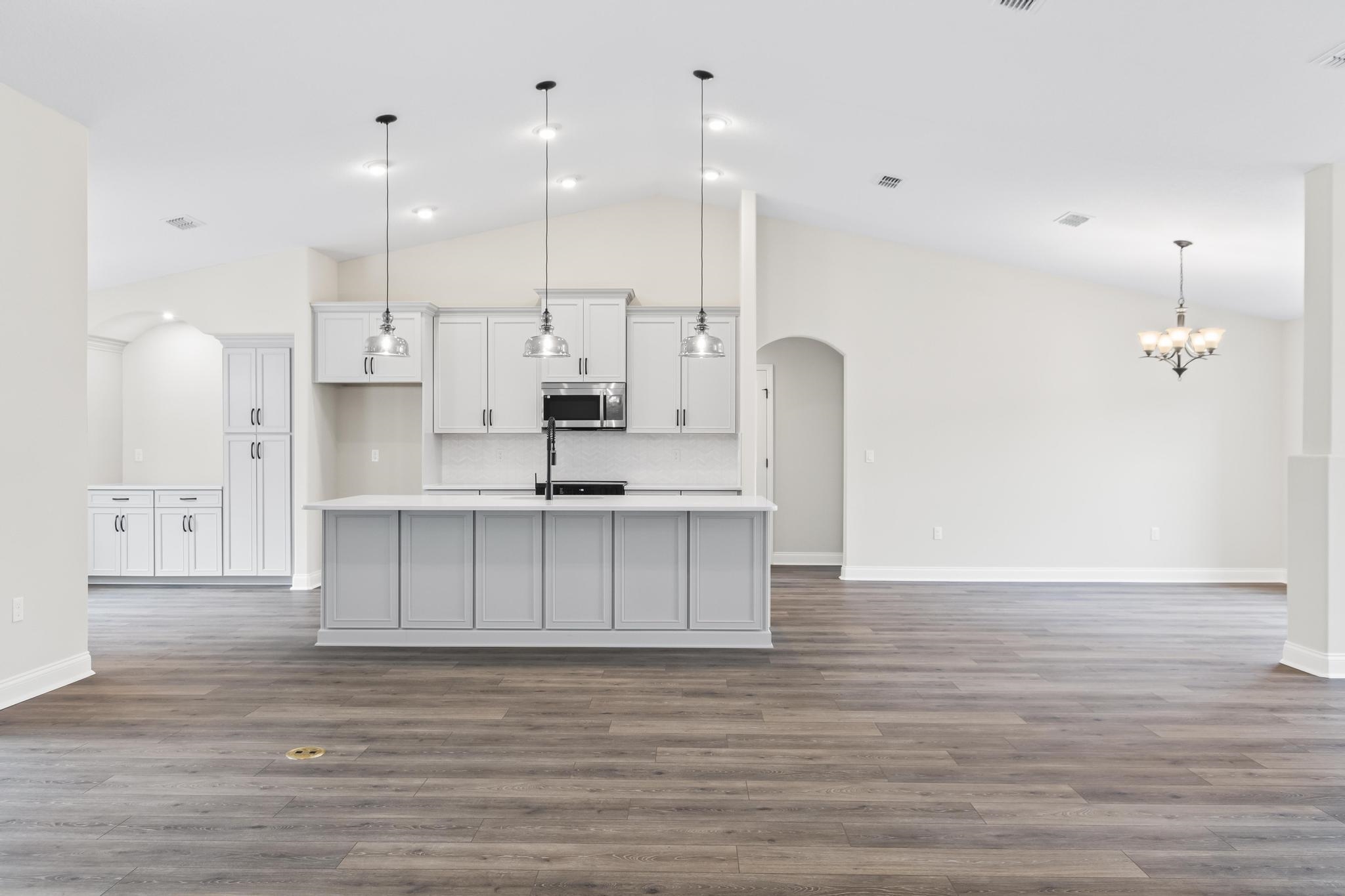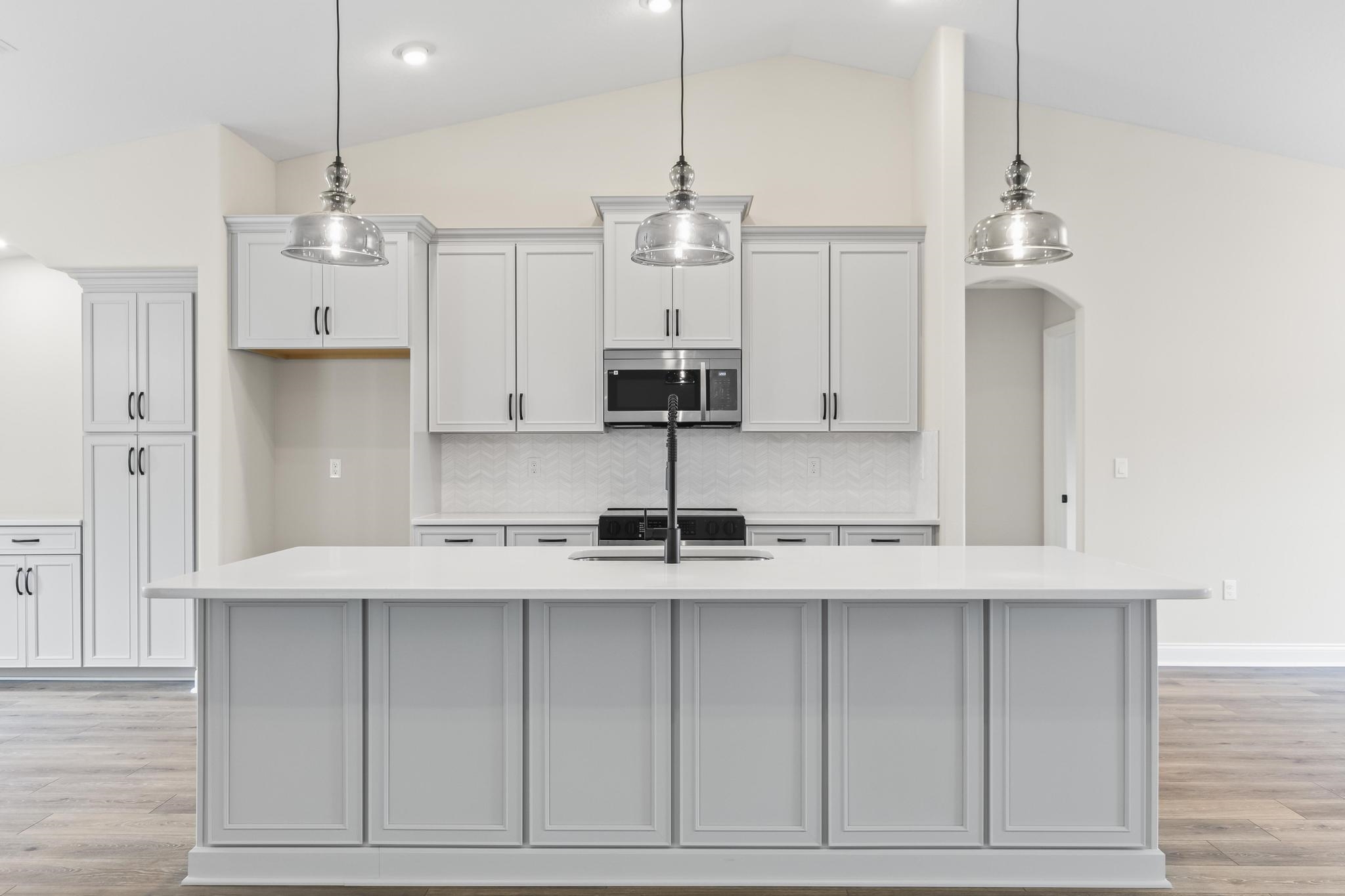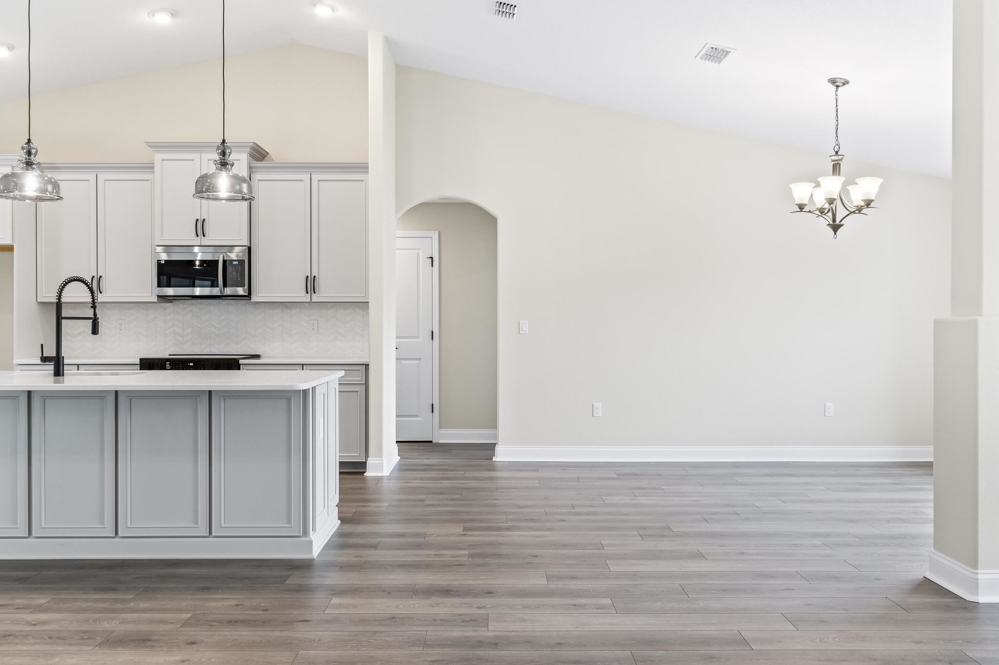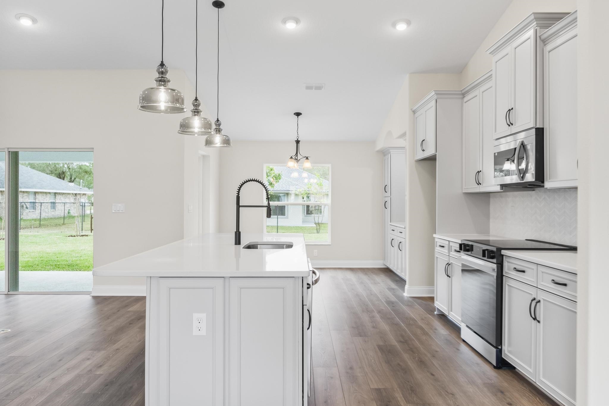 Welcome to the enchanting Willow model, a home that beckons with its warm embrace and thoughtful design. As you step inside, you'll be greeted by a spacious open floor plan adorned with arched entryways and Luxury RevWood seamlessly flowing through the main living areas and into the versatile den/flex room. For the culinary enthusiast, the kitchen is a true masterpiece, featuring quartz countertops, pendant lighting casting a gentle glow over the island bar, designer backsplash, and stainless steel appliances. Stylish hardware accents and 42" cabinets adorned with crown molding extend into the adjacent cafe, creating a perfect blend of functionality and elegance. The private owner's suite is a sanctuary of luxury, showcasing a recessed ceiling detail, two oversized walk-in closets for ample storage, a dual sink vanity offering convenience, and a generously sized walk-in shower for a spa-like experience. Upgraded landscaping and floritam sod.