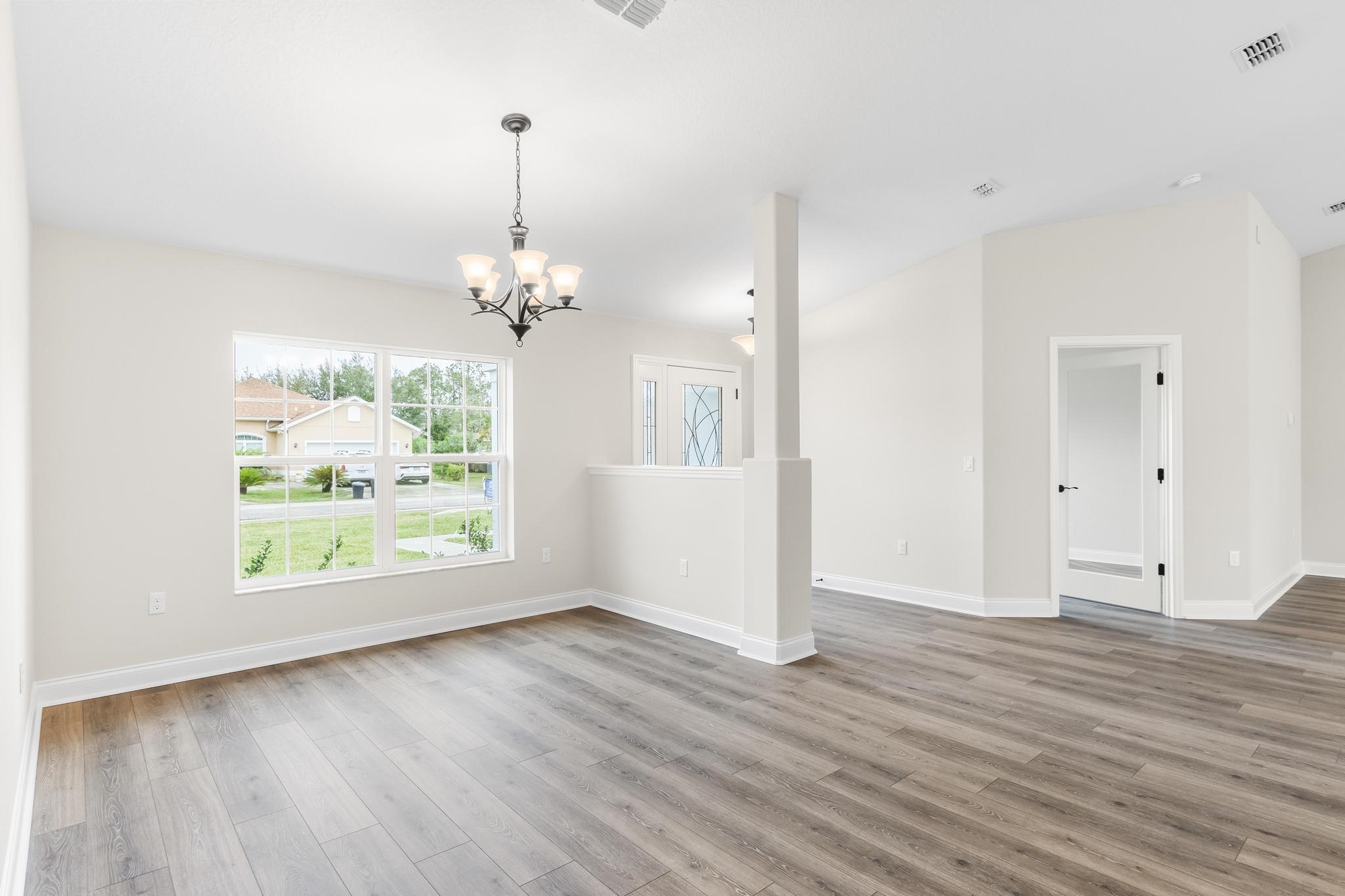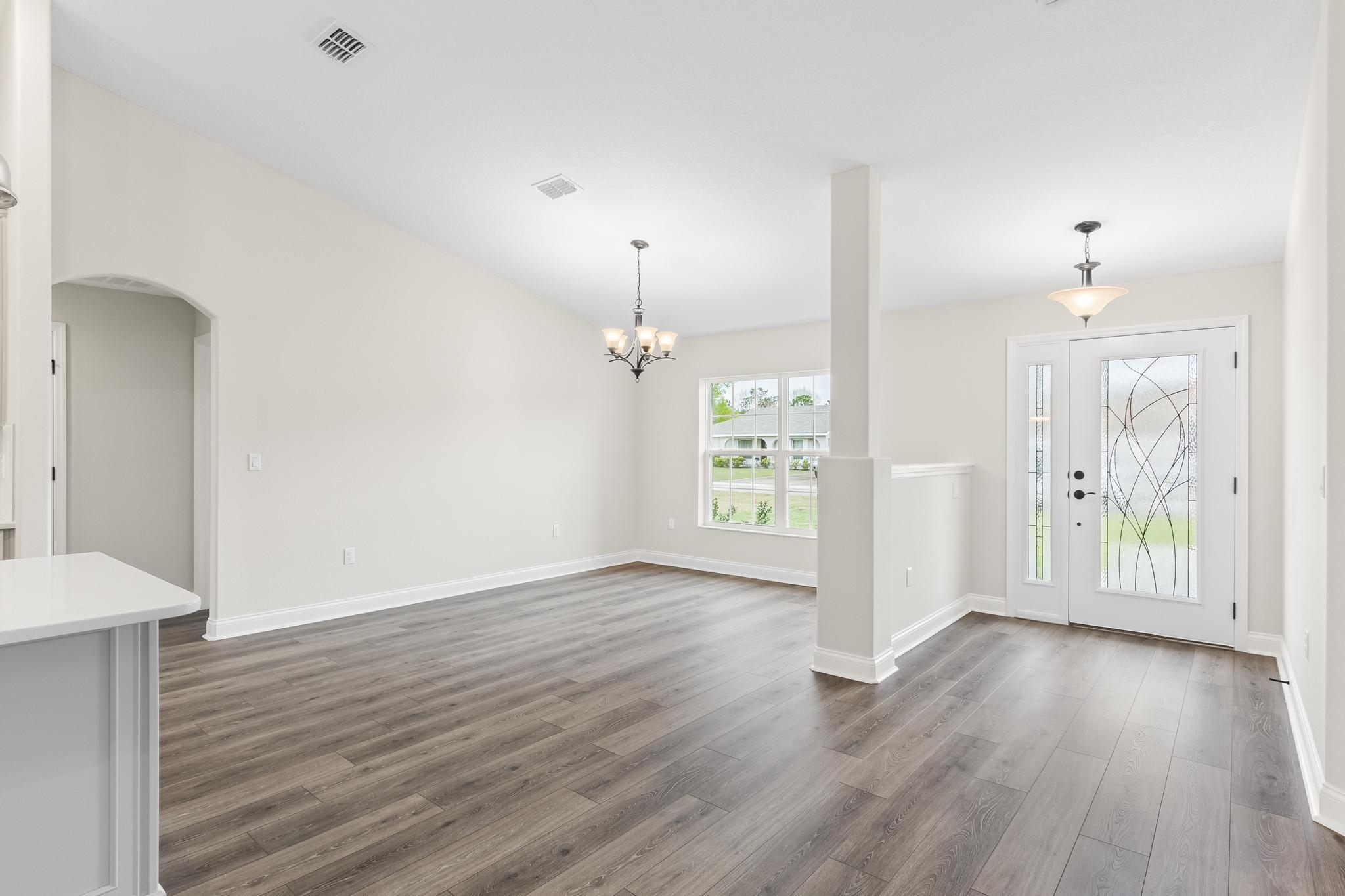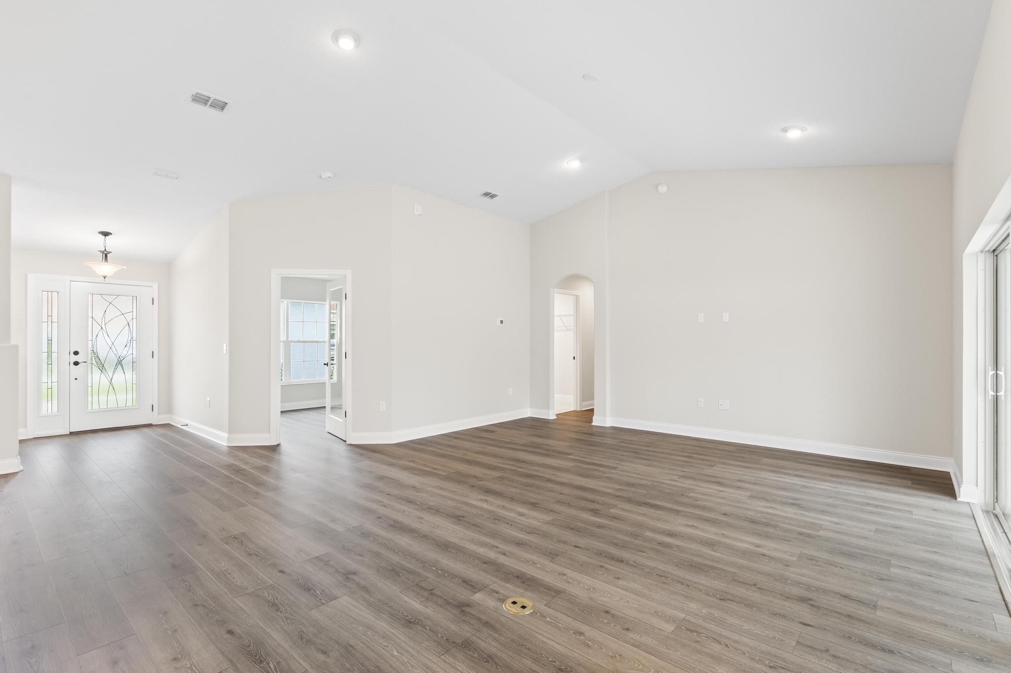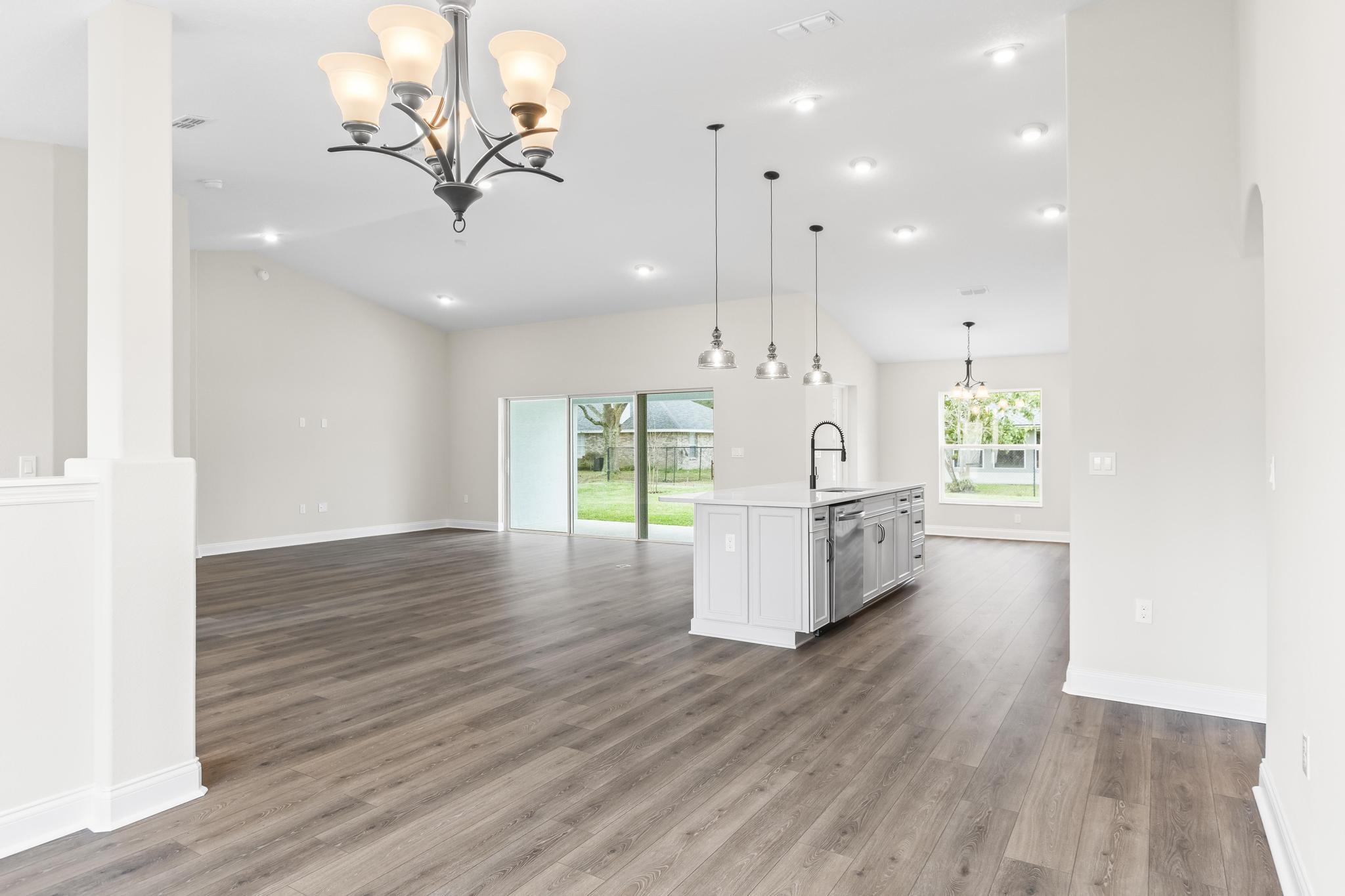 Welcome to the enchanting Willow model, a home that beckons with its warm embrace and thoughtful design. As you step inside, you'll be greeted by a spacious open floor plan adorned with arched entryways and Luxury RevWood seamlessly flowing through the main living areas and into the versatile den/flex room. For the culinary enthusiast, the kitchen is a true masterpiece, featuring quartz countertops, pendant lighting casting a gentle glow over the island bar, designer backsplash, and stainless steel appliances. Stylish hardware accents and 42" cabinets adorned with crown molding extend into the adjacent cafe, creating a perfect blend of functionality and elegance. The private owner's suite is a sanctuary of luxury, showcasing a recessed ceiling detail, two oversized walk-in closets for ample storage, a dual sink vanity offering convenience, and a generously sized walk-in shower for a spa-like experience. Upgraded landscaping and floritam sod.