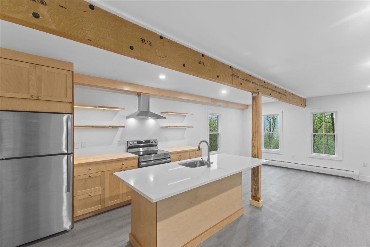 *The best deal in Barre!* This stunning, fully renovated home is perched high out of the flood zone. This classic cape has been taken to the studs, beautifully reimagined, and thoughtfully rebuilt, offering the best of energy efficiency, style, and functionality. Nearly every surface and system in the home has been upgraded. The kitchen features a modern Scandinavian aesthetic, and includes custom-built natural wood cabinetry, butcher block accents, a sleek quartz island, and stainless-steel appliances. A flexible side-entrance bonus room is ideal as a mudroom, home office, or playroom, and the open-concept kitchen/living/dining area perfect for entertaining. The first-floor full bath doubles as the laundry room, with a full tub with modern tilework. Upstairs, find three comfortable bedrooms and another high-end bathroom. Wash away the cares of the day in the luxurious shower, featuring ceiling-height tiled walls and panoramic downtown views! The unfinished basement offers generous storages. System & structural upgrades include: new 200-amp electrical panel and all-new wiring throughout the home; Brand-new heating system with modern low-profile radiators and completely redone piping; High-efficiency insulation with spray foam and batt insulation, and all-new exterior siding for a fresh and durable finish. The level backyard is prime for fencing in, and a perfect spot to celebrate your new central Vermont home!