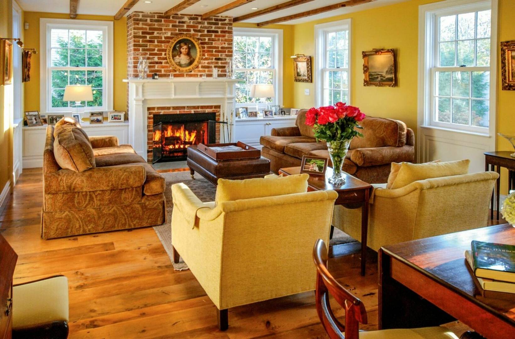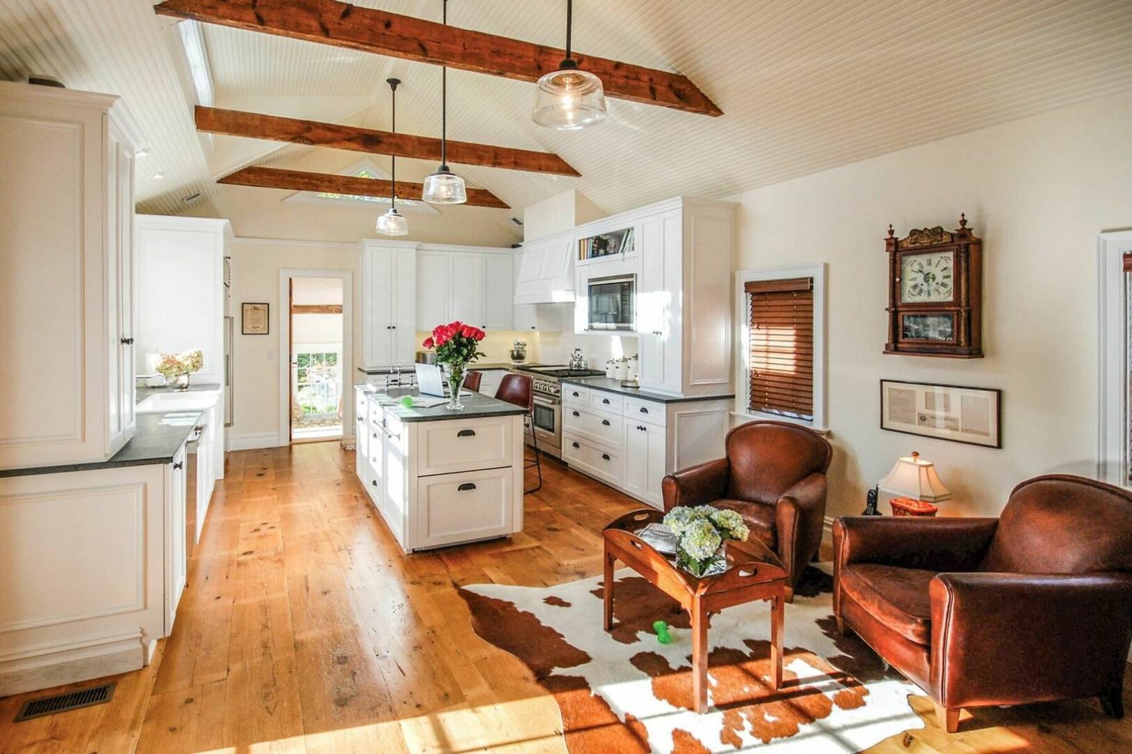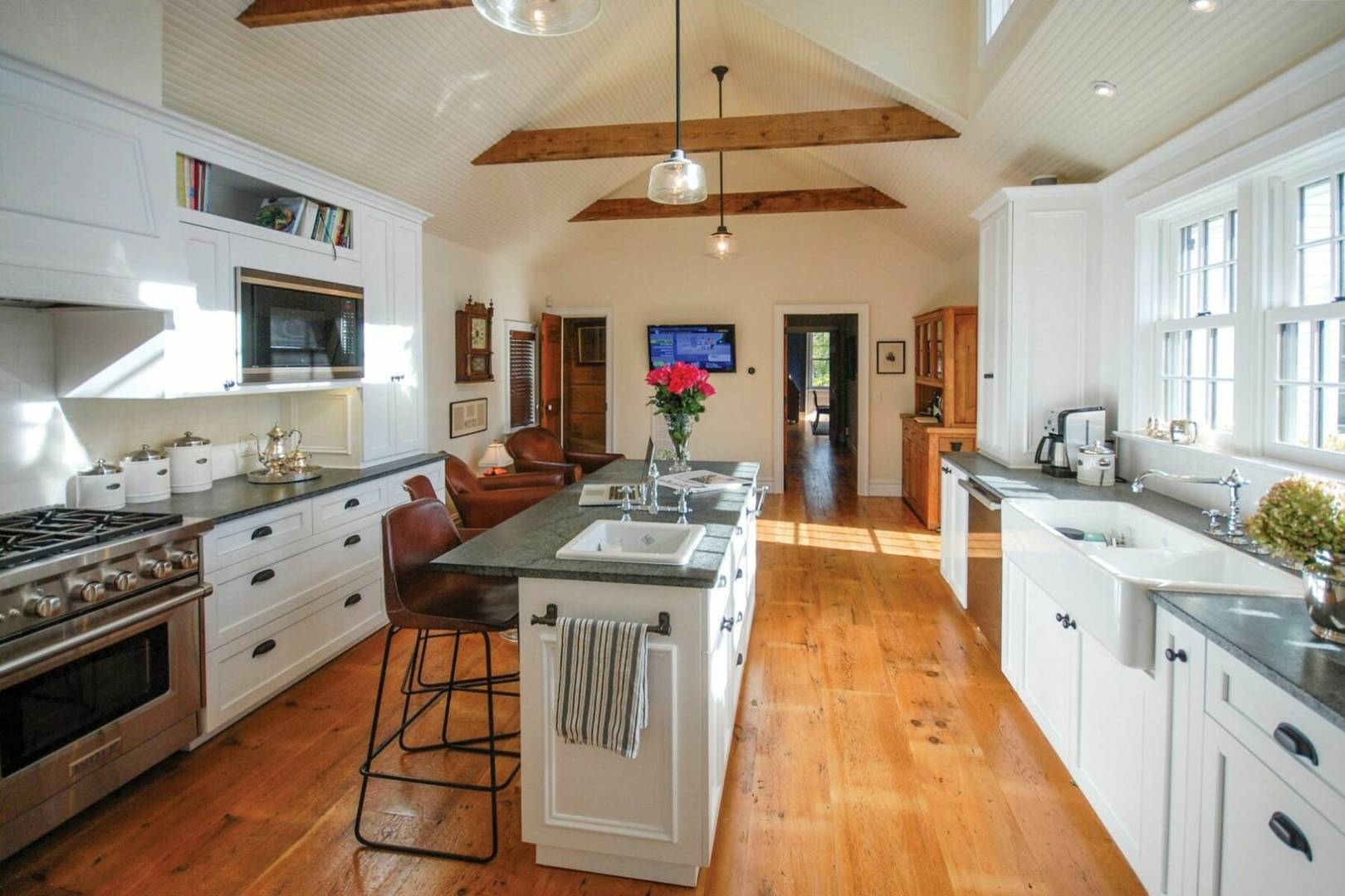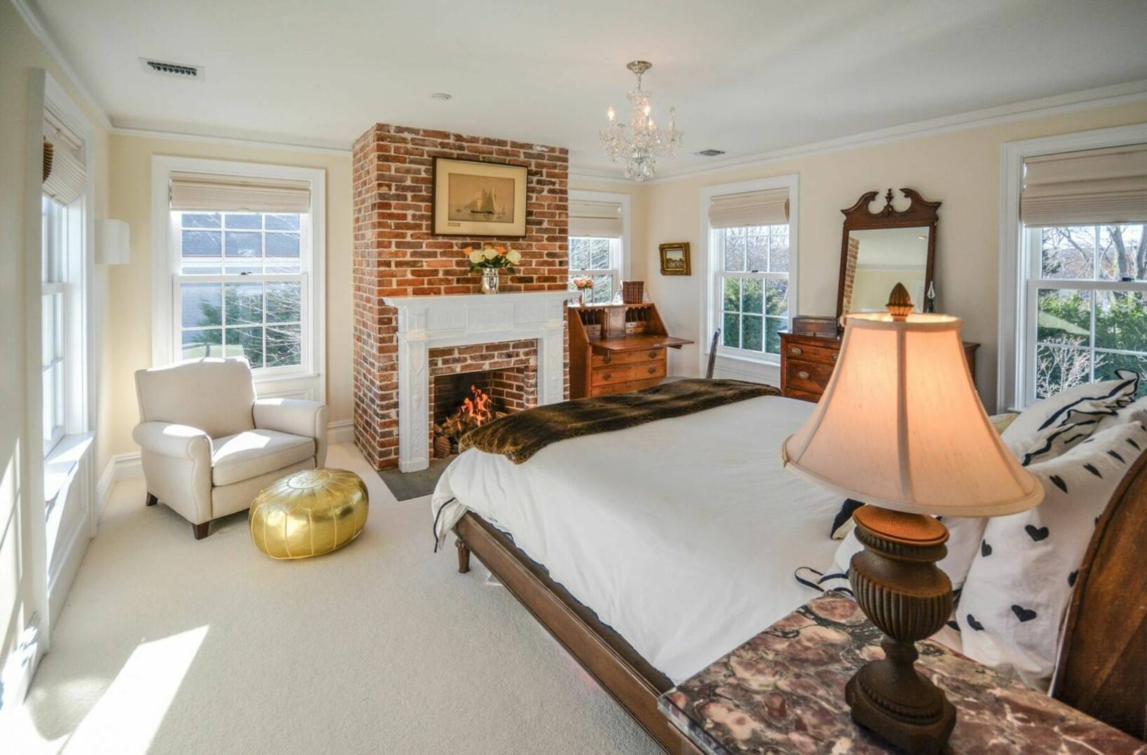 Charming historical 5 bedroom 4 bath home in the heart of Sag Harbor Village. Completely renovated with modern amenities. Beamed ceilings, chefs kitchen, beautifully appointed bedrooms, with five zones of air conditioning. Outside there is a stone terrace for dining, heated gunite saltwater pool and pool house with bath and loft.