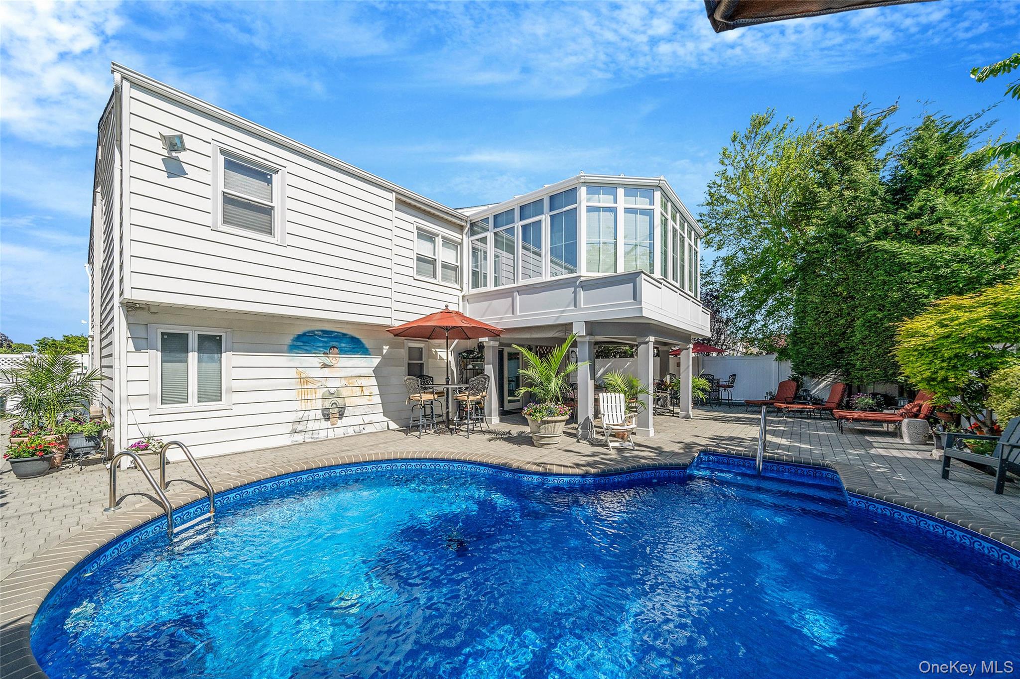 Magnificent Atlantic Beach Estates stunning Hi Ranch, all updated. Fabulous Eat in Kitchen high end SS Appliances, Gas Cooktop w/ 2 Wall Ovens, Granite Countertops, leads into a Custom Hampton Conservatory Room, Dining Room, living room w/electric Fireplace, Primary bedroom w/private Bath, lots of closets, Bedroom, Bedroom, Full Large Bath, Down to an entertaining area, Livning Room w/ Wood Burning Fireplace, Beautiful Custom Bar and entertaining area, leads out to a stunning backyard, inground pool. Whole House Water System. New H/W heater, New CAC 1st Floor, Full Attic partially floored w/ Cedar Closet, 2 car garage w/private driveway parking. Landscaping is amazing. Private Atlantic Beach Estates Beach Club w/parking. Scott Drive Park & Playground