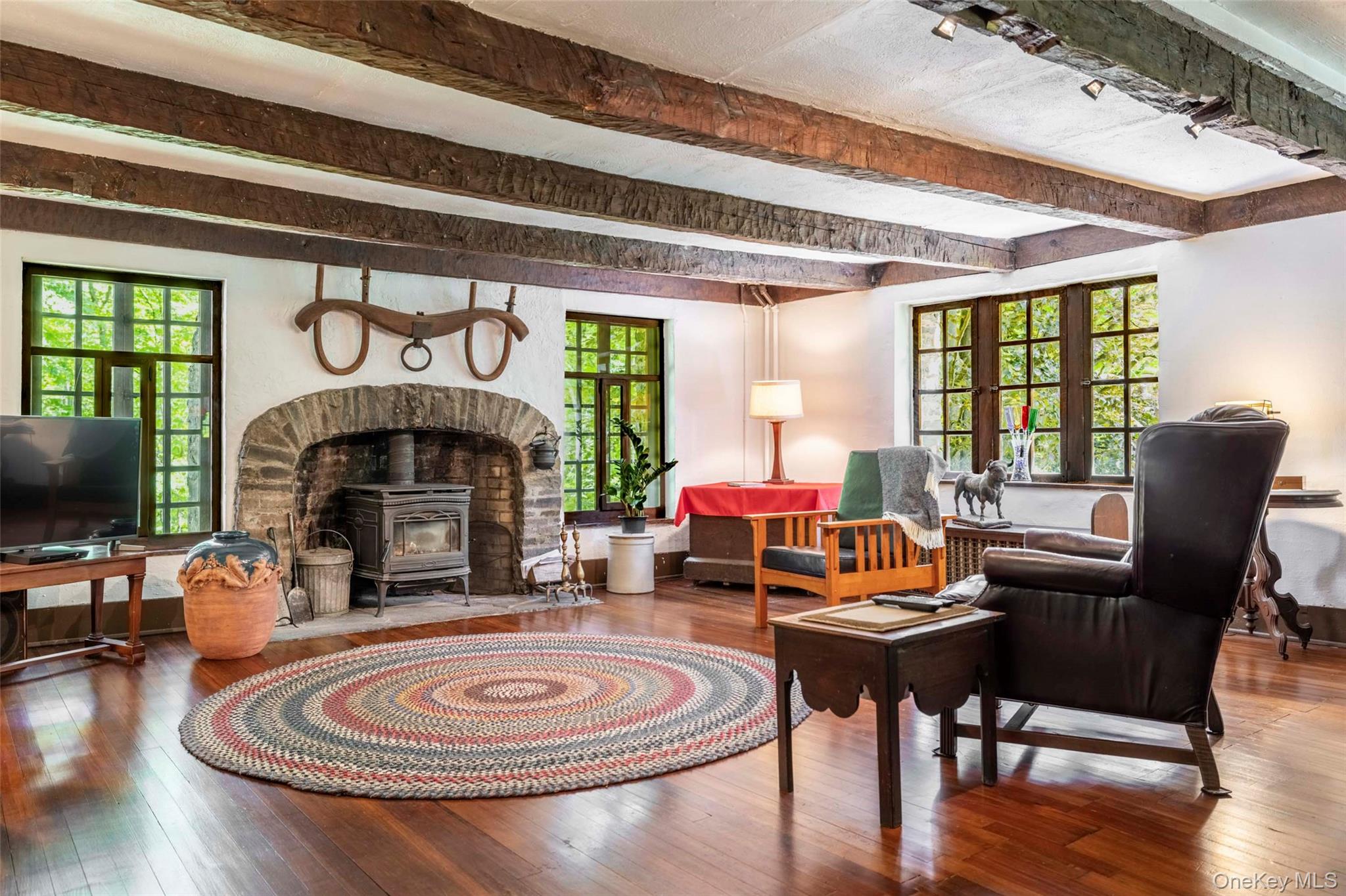 Live in an atmosphere you have always dreamed of. Become the talk of the town. . . your imagination escapes you. . . Step back in time with this enchanting antique farmhouse nestled on a sprawling 10+-acre semi-rural retreat. This historical gem, built in the early 1800s, captures the rustic elegance of a bygone era while offering a tranquil sanctuary for nature lovers and history enthusiasts alike. Once the cherished residence of Jody Wolcott Carson (Johnny Carson's first wife) and Donald Bright Buckley, an original ''Mad Men'' era luminary, this home has been lovingly maintained since passing to the current owners in 1972. The estate boasts an iconic large red barn, adding to the picturesque charm of the property. Explore the natural grandeur of the land, from the serene pond with its thriving wildlife, including Wide Mouth Bass, turtles, and blue herons, to the diverse horticultural collection featuring Sweetgum, Dawn Redwood, Dolgo Crabapples, Copper Beech and many other specimen trees. Enjoy summer days in the unique cement pool, which is partially shaded by a majestic Weeping Hemlock. Inside, the home features two inviting fireplaces and a tavern room, creating the perfect ambiance for cozy evenings. The studio/music room dazzles with a cathedral ceiling, a spiral staircase, leading to a sleeping loft, and an oversized arched paned window, complemented by a chandelier from the Biltmore in Manhattan. The kitchen, adorned with a cast iron cook stove, and the screened-in north facing porch add to the home's period charm. With a semi-circle driveway and room for two cars in the barn, the property proximity to both Woodstock and Saugerties, this home offers both seclusion and convenience. Discover a peaceful lifestyle surrounded by natural beauty and history at this Saugerties treasure. Welcome to your own slice of the Hudson Valley, where the past is your present. A 3D Walkthrough Tour is available in the digital Lookbook or by request from the listing agent.