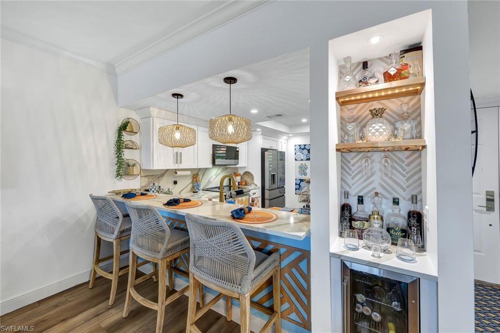 St Vincents at Pelican Bay! This first floor 3 Bedroom/2 Bath home has been exquisitely re-mastered and decorator furnished with beachy tones of tan, grey, and blue, plantation shutters, and eye catching artwork, creating a true SW Florida oasis. After enjoying the nearby Community pool/spa, take in the gorgeous sunset views over a serene lake and fountain from your comfortable lanai. A dual purpose wet bar and coffee bar is a wonderful addition and is sure to get lots of use. The beautifully functional laundry is in the unit and covered parking for your vehicle is attached for your convenience. St Vincent is close to the Commons with all the Pelican Bay amenities as well as the Tram which takes you to the private beach and restaurant. Artis Naples and Waterside are also nearby for upscale dining, shopping, and entertainment opportunities.