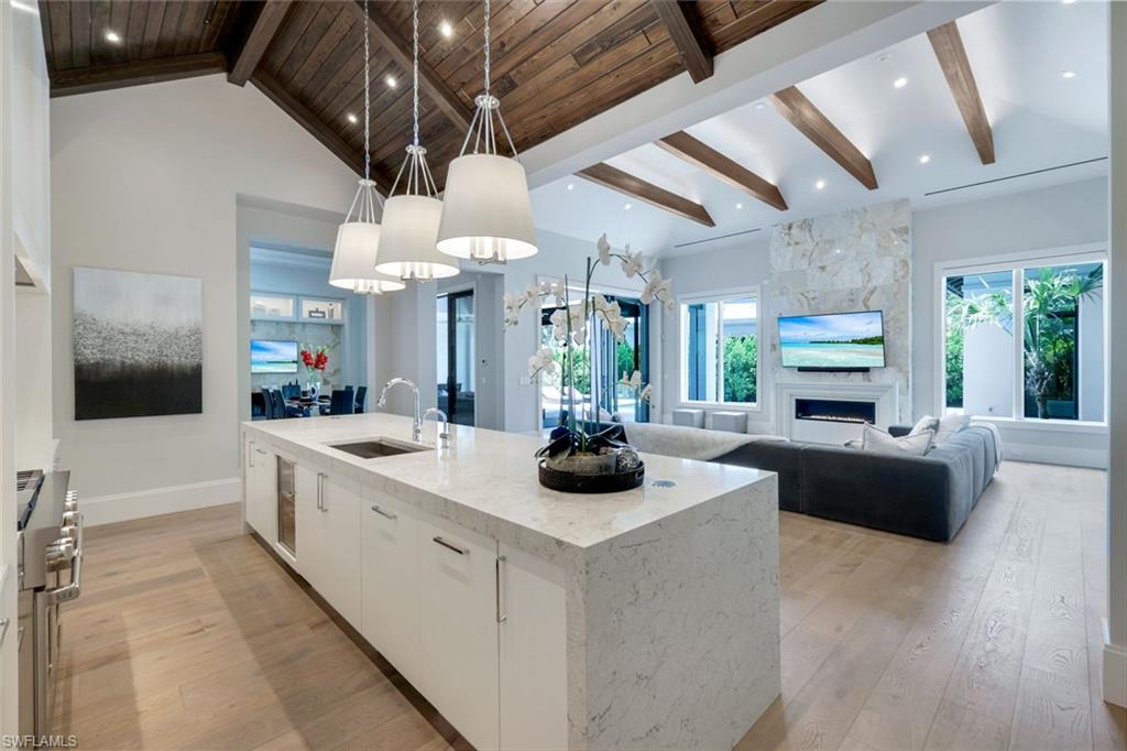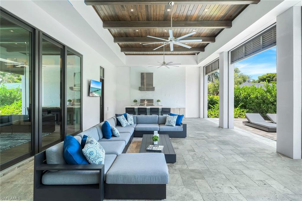 Outdoors, enjoy a relaxed Naples vibe with a casual outdoor kitchen, a sparkling pool, and generous covered seating areas ideal for lounging or hosting. Inside, the living area centers around a stylish fireplace, and each space is elevated by upscale finishes, designer lighting, and custom touches throughout.