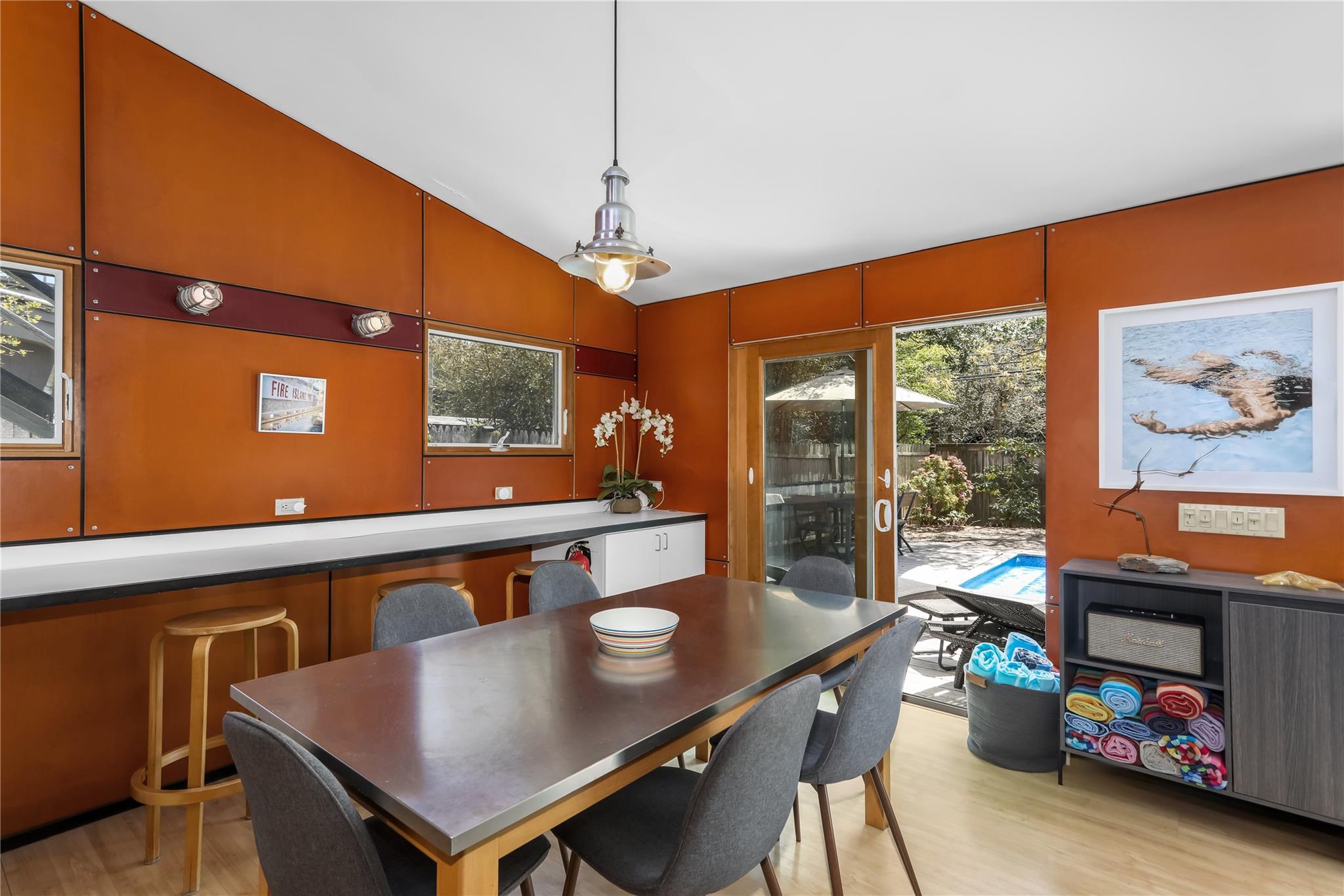 HEADS UP FIRST TIME BUYERS. Fully air-conditioned designer, 2 bedroom, 2 bath pool house. Master bedroom has king bed, separate entrance from the deck, and private bath. Second bedroom has 2 twin beds and plenty of closet storage. Stainless kitchen. Open floor plan. Direct TV, WiFi, front loading washer and dryer, outdoor shower, and gas grill add to the amenities. Large, private completely fenced in yard with heated, salt water pool and to top it all off, private roof deck to watch the sunset over the Great South Bay.