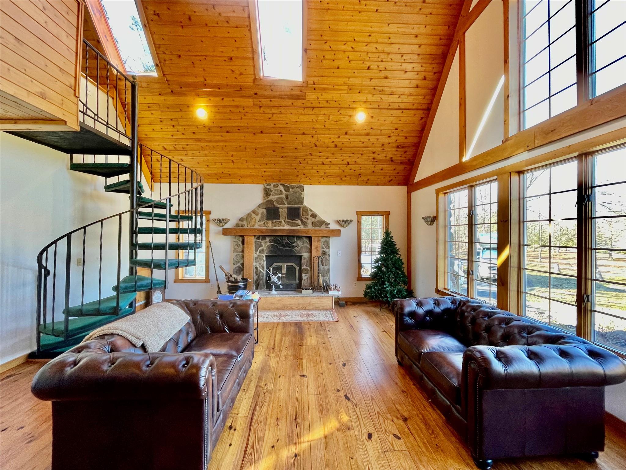 Paradise awaits you. Come experience the beauty of this unique, artistic, captivating, stucco & stone , 10 room, Tudor style contemporary with rustic, antique charm. It is set back in an upscale cul de sac on 5. 1 private, panoramic acres with glorious Shawangunk Mtn views and pond. It features a dramatic open floorplan with high & vaulted ceilings, custom woodwork, some wood ceilings & wide plank floors, and specialty windows. The 1st floor has a grand 2 Story, 20x20’ living room w balcony overlook, designer kitchen, dining room & den/office. It also includes a fabulous, huge primary bedroom with vaulted wood ceiling, primary bath w whirlpool tub, shower, walk in closet & heated cedar spa room with hot tub. There is a 20x24’, 2 story family room with a stone fireplace, a wall of windows with spectacular views & spiral stairs leading to the 2nd floor with an enormous bonus room, 2 bedrooms full bath. There is 1. 1 acre adjacent lot in Town of Gardiner included tax # 92. 004-3-56. 140. Updates include roof 2020, furnace 2019. You will love one level living on first floor. Enjoy the serenity, privacy, peace, spectacular vistas, pond to fish, and relief from stress to commune with nature & relax. It is close to shopping in Pine Bush, Gardiner & New Paltz, Minnewaska State Park & more. Your home is your vacation.