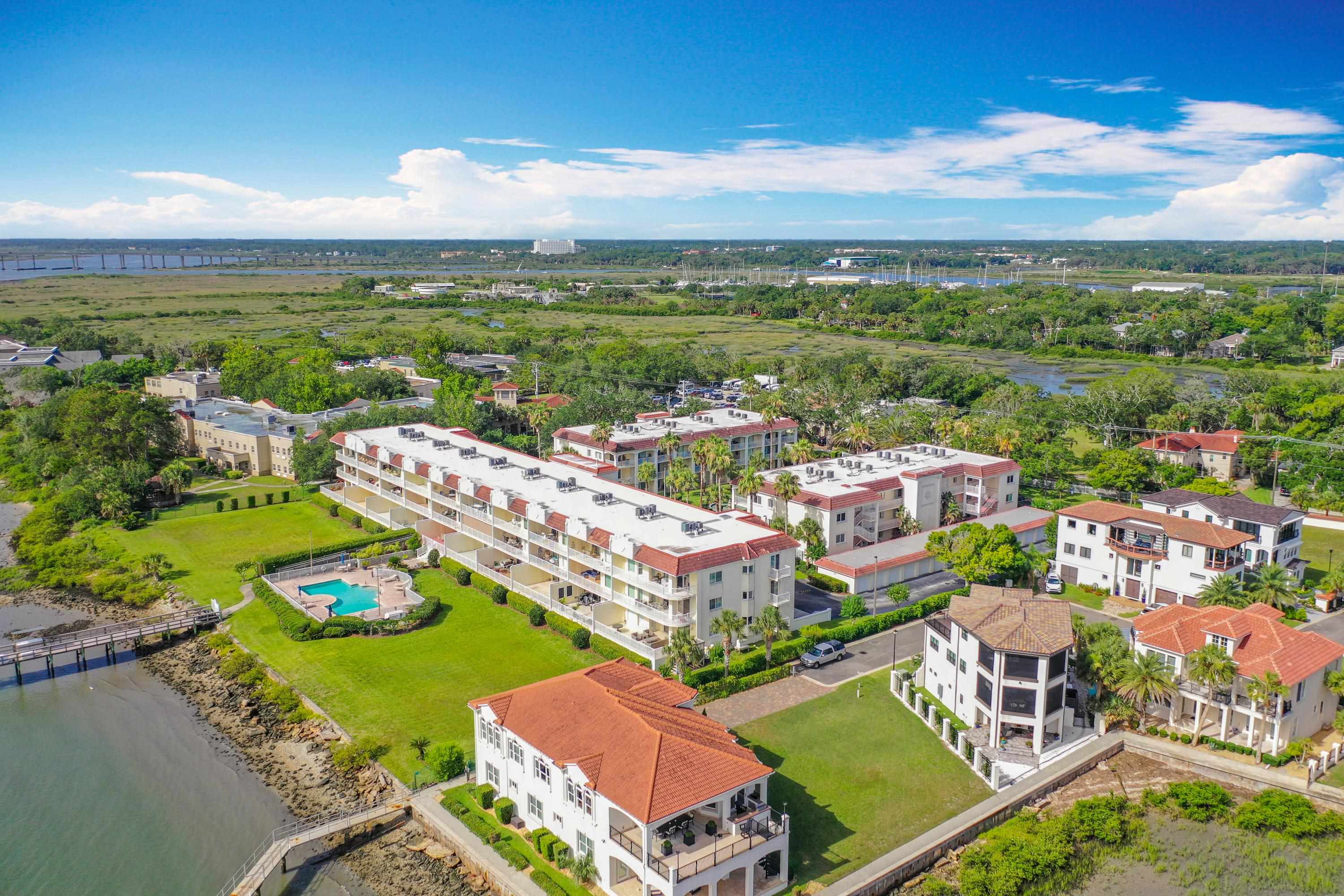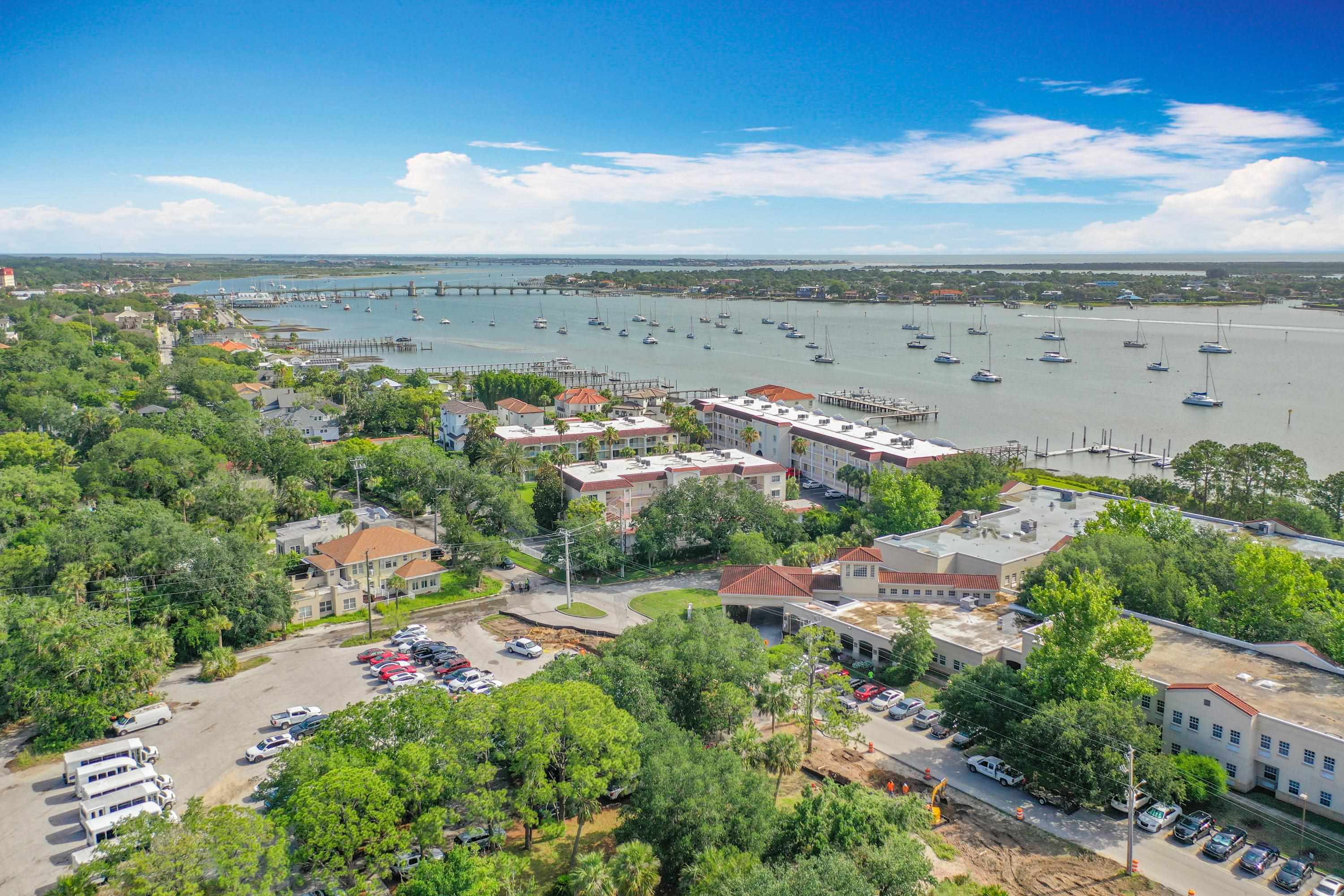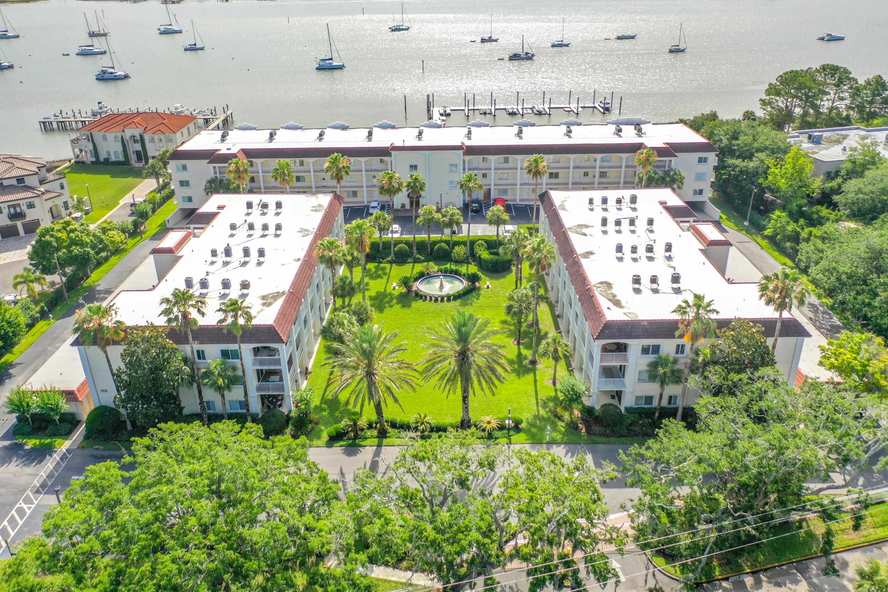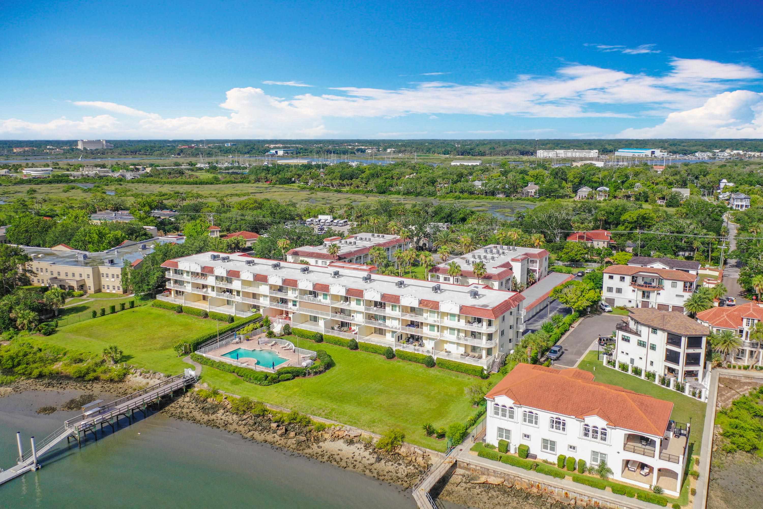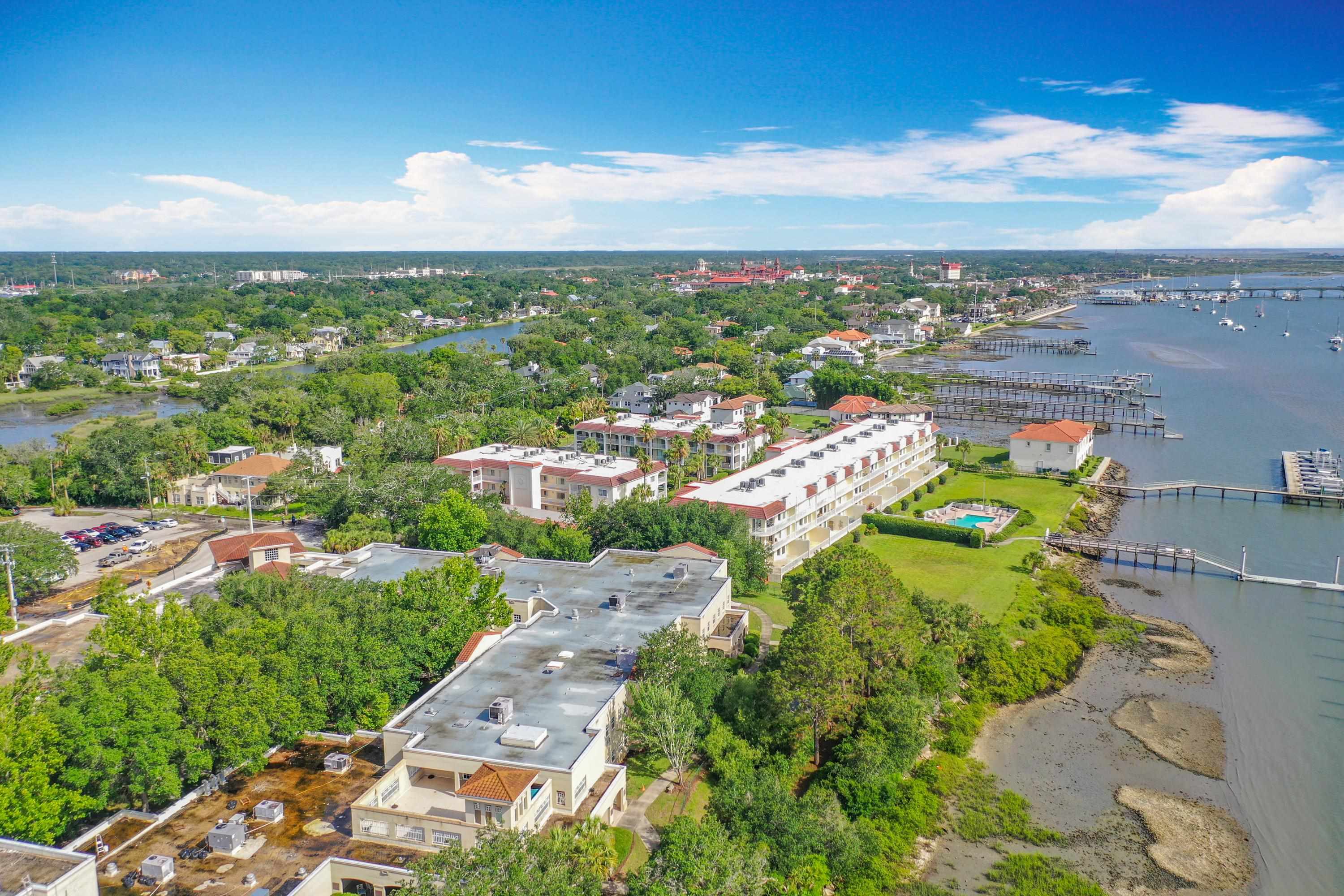 This wonderful 2nd floor condo in the Views at BayPointe is located in the heart of the historical district and includes a detached 1-car garage with additional storage space. Enjoy the rich history of the oldest city in the nation without worrying about where to park. Walk old brick streets and sidewalks to great restaurants, entertainment, unique shops, art galleries and museums. Flagler College is just a short walk as well as your choice of banks. Park your car in your assigned garage and get busy exploring. This condo features open floor plan with hurricane shutters and a view of the Intracoastal Waterway from your lanai. Full size washer and dryer off the kitchen. Large walk-in closet in master bedroom. Sunny lanai off the living room and master bedroom overlooks the Spanish style fountain and tropical courtyard with palm trees and lots of green space. Assigned one-car garage space is across from unit. Views at BayPointe offers a gated entrance, clubhouse, pool overlooking the Intracoastal waterway and private marina with boat slips owners can purchase separately, when available. New HVAC system with 10-year transferrable warranty. New owners pay a Capital Contribution of 2 months condo dues at closing. Condo docs available at: viewsatbaypointe. com Minimum rental period is 3 months. 3D Video tour link: https: //nodalview. com/s/3MnqSy6eb37R6Dc7Qz5Ck_