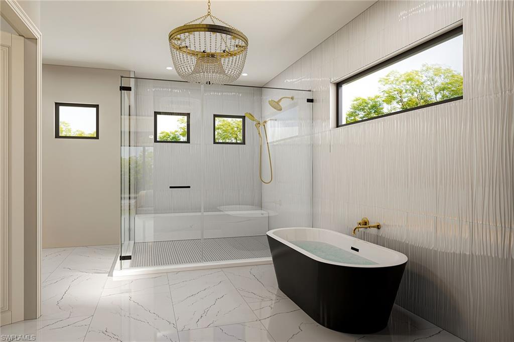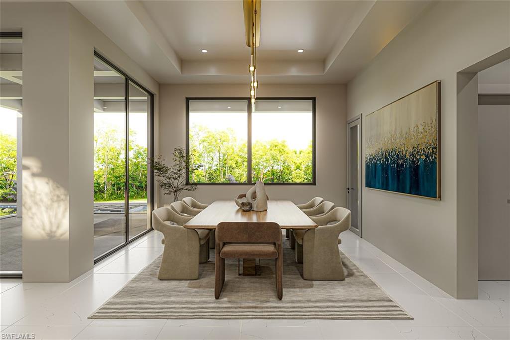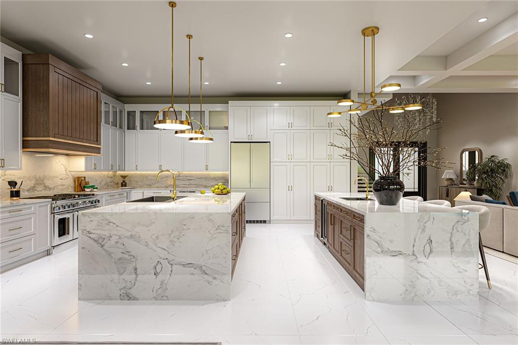 Discover the epitome of luxury in this custom-built five-bedroom plus den, five-bath contemporary home. This remarkable two-story residence spans over 4, 900 square feet of air-conditioned living space, offering opulence and comfort in every corner. Enter into the expansive great room, where a custom feature stone wall with built-in electric fireplace creates a breathtaking focal point. Adjacent, the gourmet chef's dream kitchen awaits, boasting working and social islands, hand-crafted custom cabinetry, Thermador gas range and a spacious butler's pantry. Completing this culinary haven is a unique built-in wine cooler. The intelligently designed floor plan ensures privacy and convenience, featuring a primary suite retreat and guest bedroom en-suite on the first floor with an additional three en-suite guest bedrooms, additional laundry room, loft and private balcony on the second floor. Tile floors throughout the home add a touch of elegance and durability. Enjoy the long water canal views and embrace the Florida lifestyle with an exceptional outdoor living space designed for relaxation and entertainment. The saltwater pool, spa, summer kitchen with bar, beverage cooler and ice machine, outdoor shower and firepit provide a haven for enjoyment. The covered deck areas are equipped with electric shutters and screens offering comfort and protection. Additional features include a whole-house generator, 500-gallon propane tank, three-car garage, and impact windows and doors. This home is a sanctuary of luxury, thoughtfully crafted with meticulous attention to detail. Indulge in the unparalleled elegance and sophistication of this magnificent Marco Island estate, where every amenity and feature has been designed to enhance your living experience. Estimated completion date September 2026. Photos in this listing have been virtually rendered and are not of actual home.