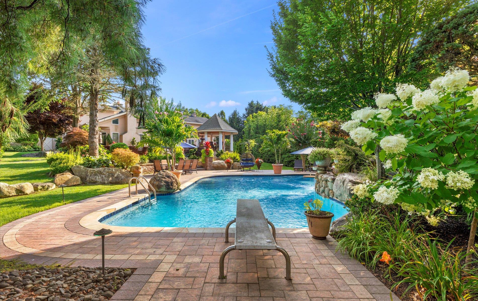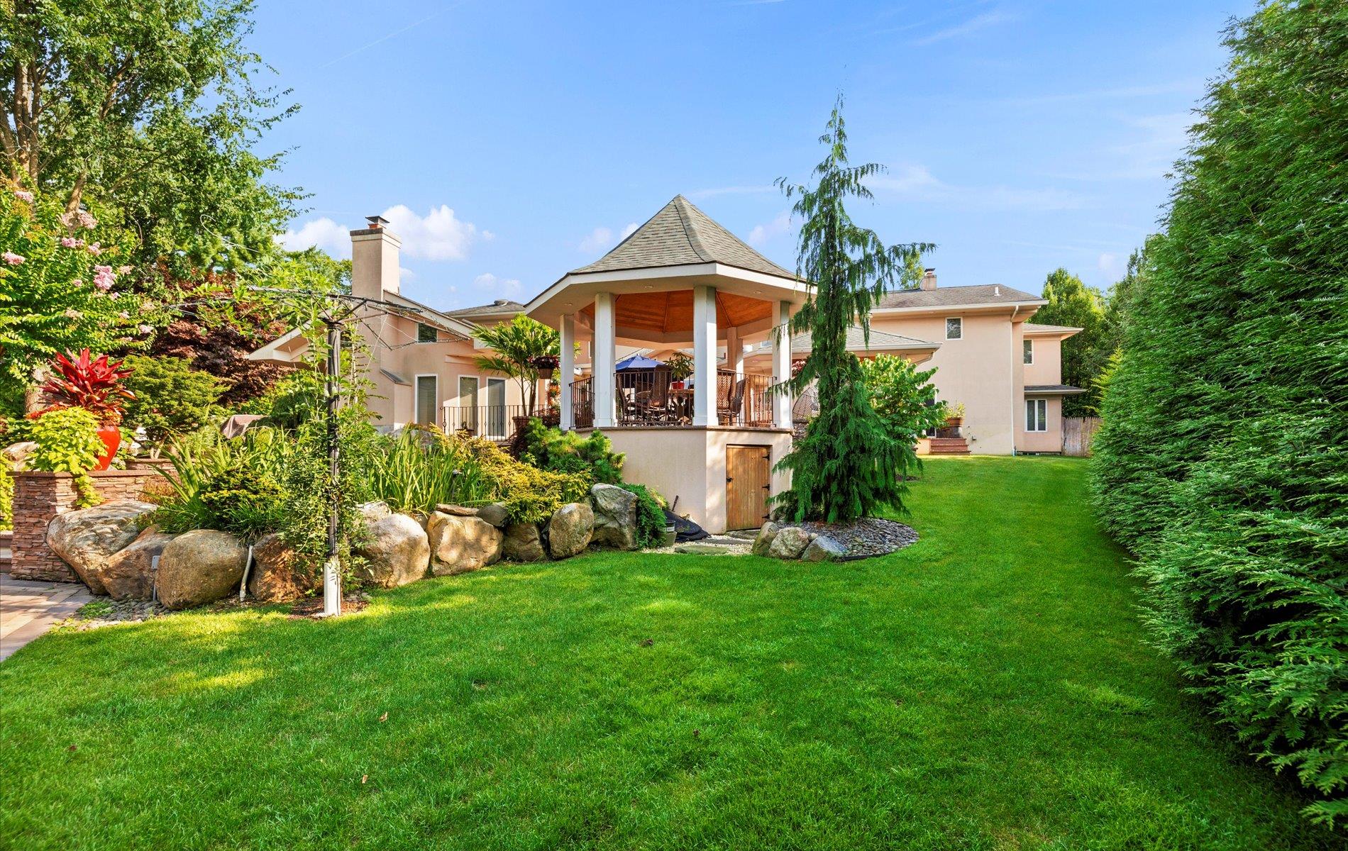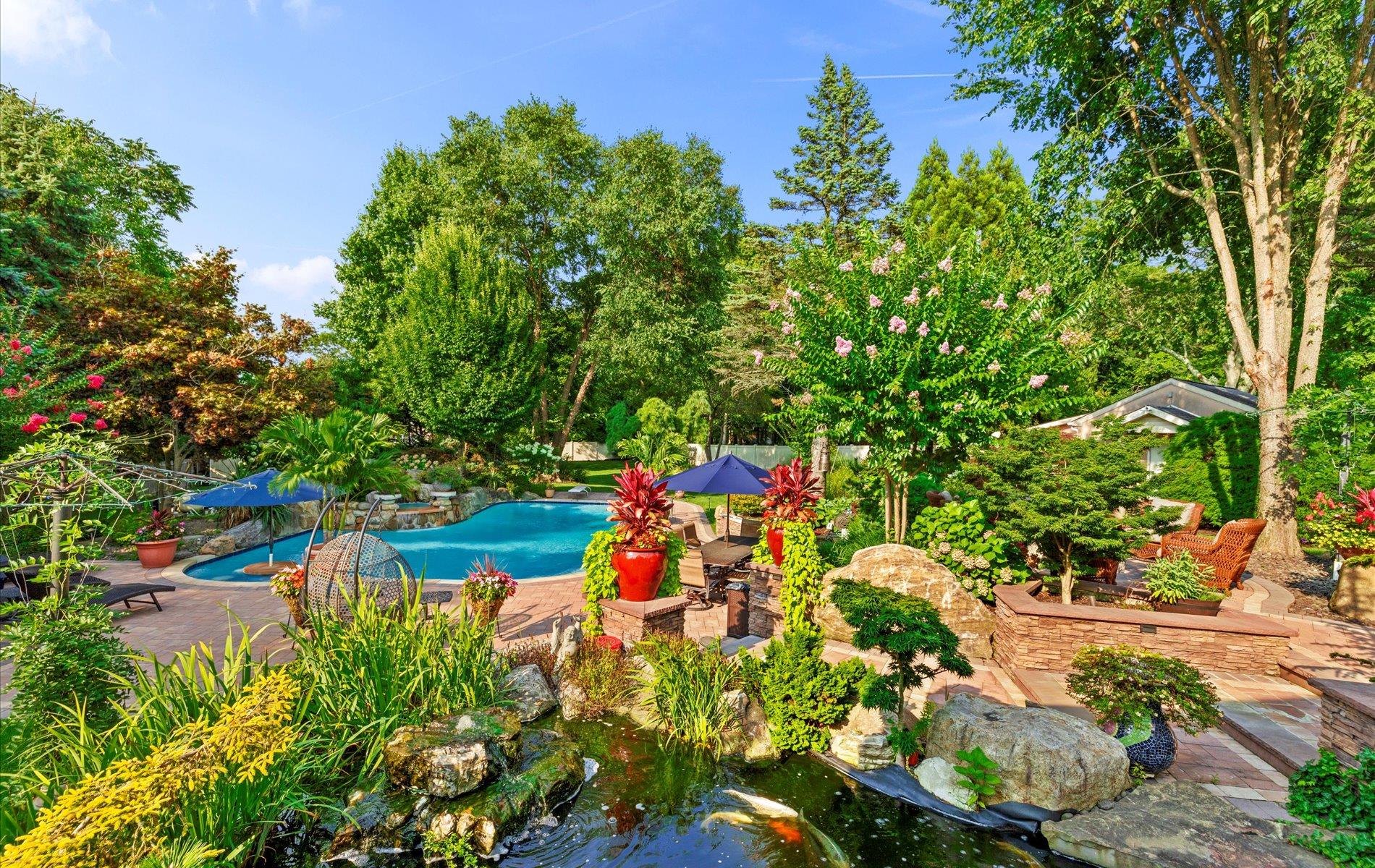Welcome to your private oasis in the heart of the Half Hollow Hills School District! Tucked away on a QUIET cul-de-sac, this immaculate 5, 000+ square foot contemporary colonial offers the ultimate in luxury living and resort-style amenities, set on a magnificently landscaped property that feels like a five-star retreat. Step into the grand two-story foyer and immediately sense the refined elegance and perfect flow of this beautifully maintained home. Designed for both comfortable living and stylish entertaining, the spacious layout includes a private guest ensuite on the first floor, four fireplaces throughout, and generously sized rooms bathed in natural light. At the heart of the home lies a stunning, fully renovated eat-in kitchen featuring sleek white cabinetry, gleaming countertops, a massive center island, high-end appliances, cooktop, and a built-in BBQ—perfect for hosting and gourmet cooking. Upstairs, the luxurious primary suite is a true sanctuary, boasting a separate sitting room, a jaw-dropping custom walk-in closet with built-ins, and a spa-inspired bath complete with a jacuzzi tub. All additional bedrooms are spacious and beautifully appointed, offering comfort and privacy for everyone. The true showstopper is the extraordinary backyard. Multi-level and masterfully designed, this private resort paradise includes an outdoor kitchen with a pizza oven, charming gazebos, tranquil koi pond, multiple sitting and lounge areas, and a spectacular in-ground saltwater gunite pool with a swim-up bar. Whether you're entertaining or unwinding, every day feels like a vacation.