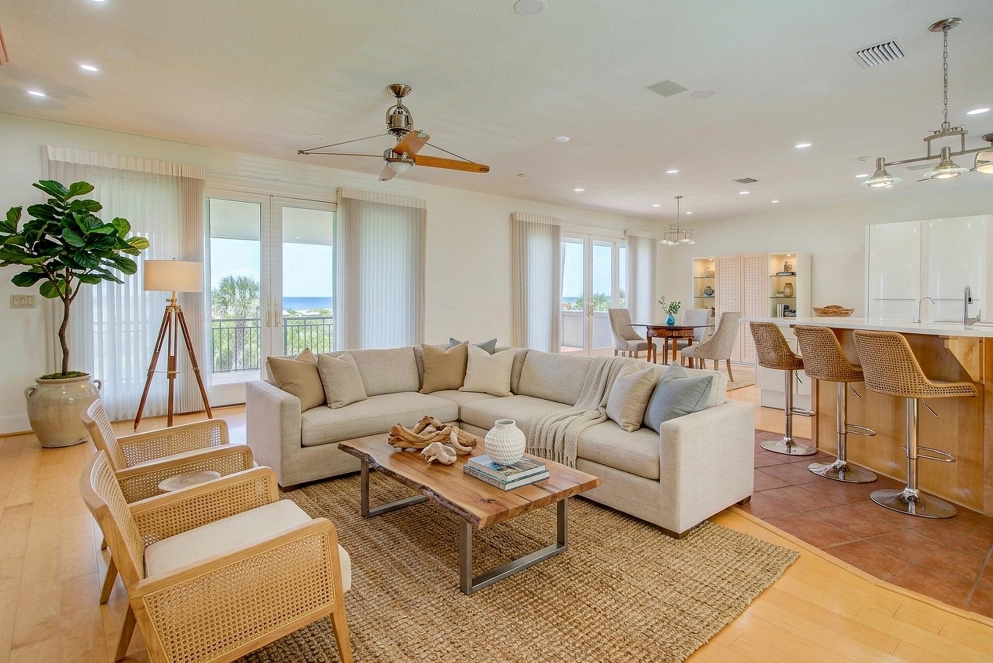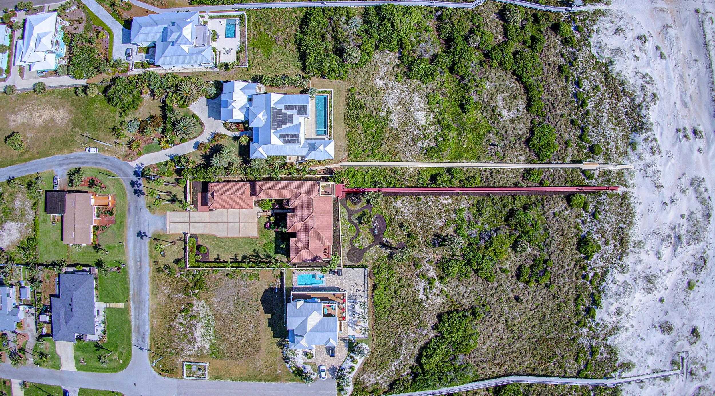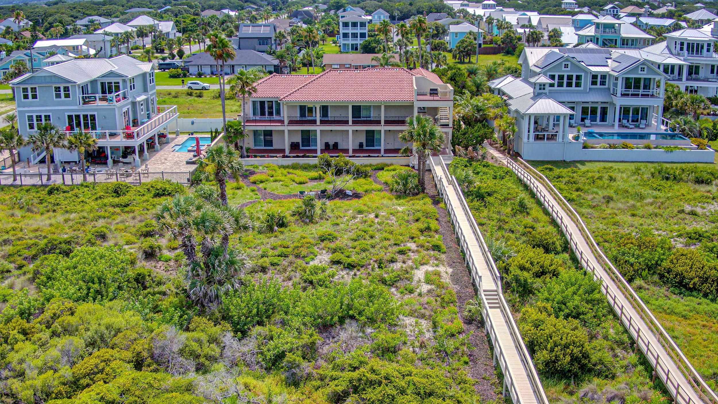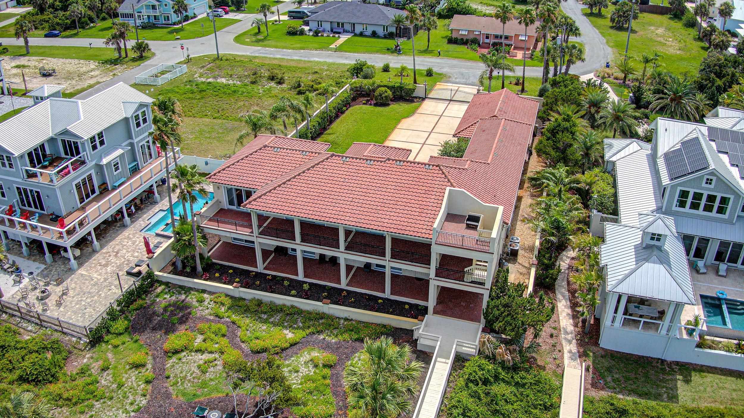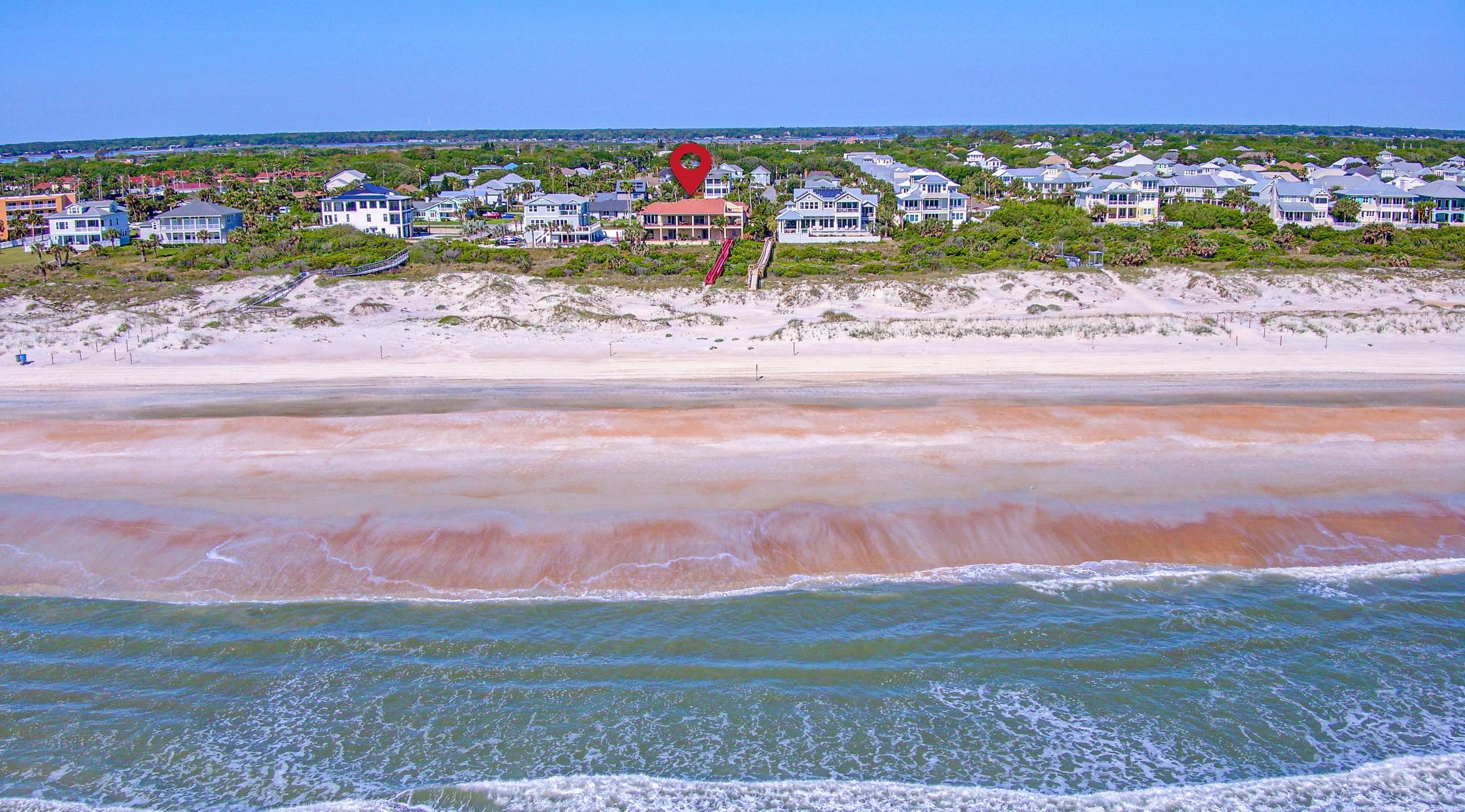 Oceanfront Luxury home with elevator on a large private lot at . 89 acres with 100 Feet of Private Beachfront and located within the City limits of St. Augustine beach plus no HOA. Indulge in the ultimate coastal lifestyle with this magnificent 5, 600 sq. ft. oceanfront estate, offering 100 feet of private, pristine beachfront and an exclusive private walkway to the sand. Nestled within a gated driveway in a private, upscale neighborhood with no HOA, this breathtaking residence combines luxury, privacy, and panoramic ocean views. Designed with a reverse floor plan to maximize its stunning waterfront setting, the second-floor main living area offers factory finished solid oak floors, expansive balconies, perfect for enjoying the sea breeze, morning sunrises, and endless horizon views. The chef’s dream kitchen, newly renovated with veined artisan quartz countertops, high-end Viking appliances, two large islands, two dishwashers, 3 sinks, warming drawer and filtered water. Beautiful oak floors that provide for the perfect space for entertaining in style. The large master ensuite with an oceanfront balcony with custom closets and the generous sized executive office/study and guest half bath are also on the second floor. This sophisticated retreat features 4 spacious bedrooms, 4. 5 designer-appointed baths. A residential elevator provides seamless access to every level, ensuring both comfort and convenience. The oversized 3-car garage includes a second-floor storage area, offering plenty of space for your coastal living essentials. A large family room with pool table is perfect for enjoyment. Irrigation well and sprinkler system to maintain the beautiful grounds. Not limited by HOA restrictions here, you have the freedom to personalize your dream home without limitations. Concrete block, brick & stucco construction. Perfect space to design your own pool to match this luxurious setting. Some photos have been digitally enhanced to include virtual staging, including bedrooms and living area. Original photos are also included.