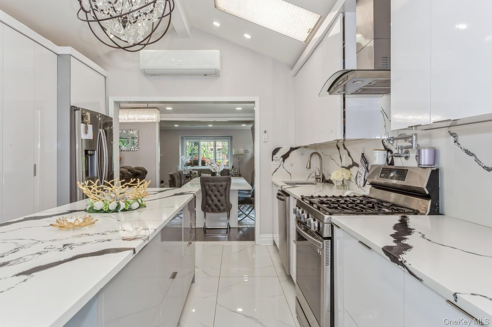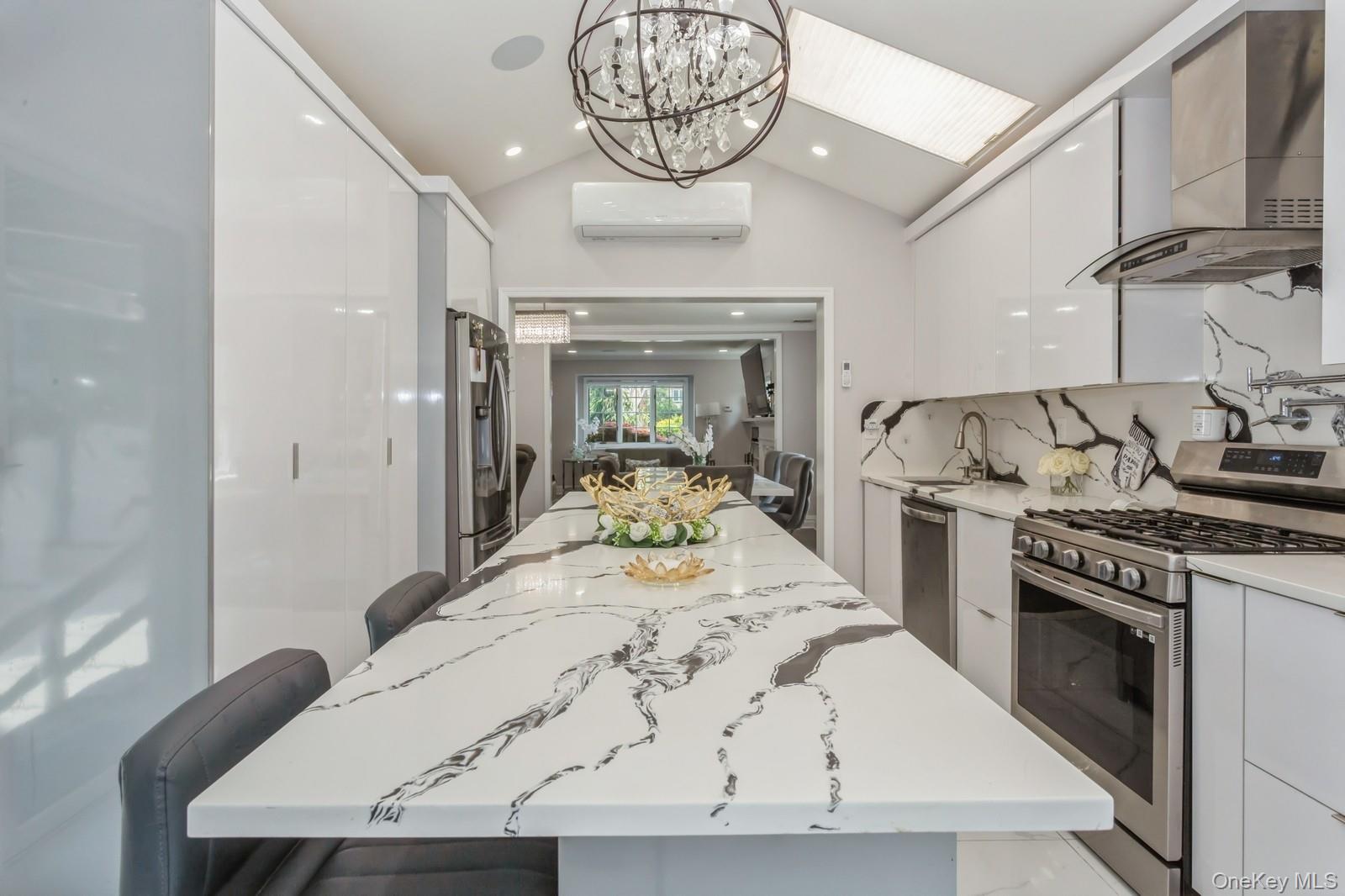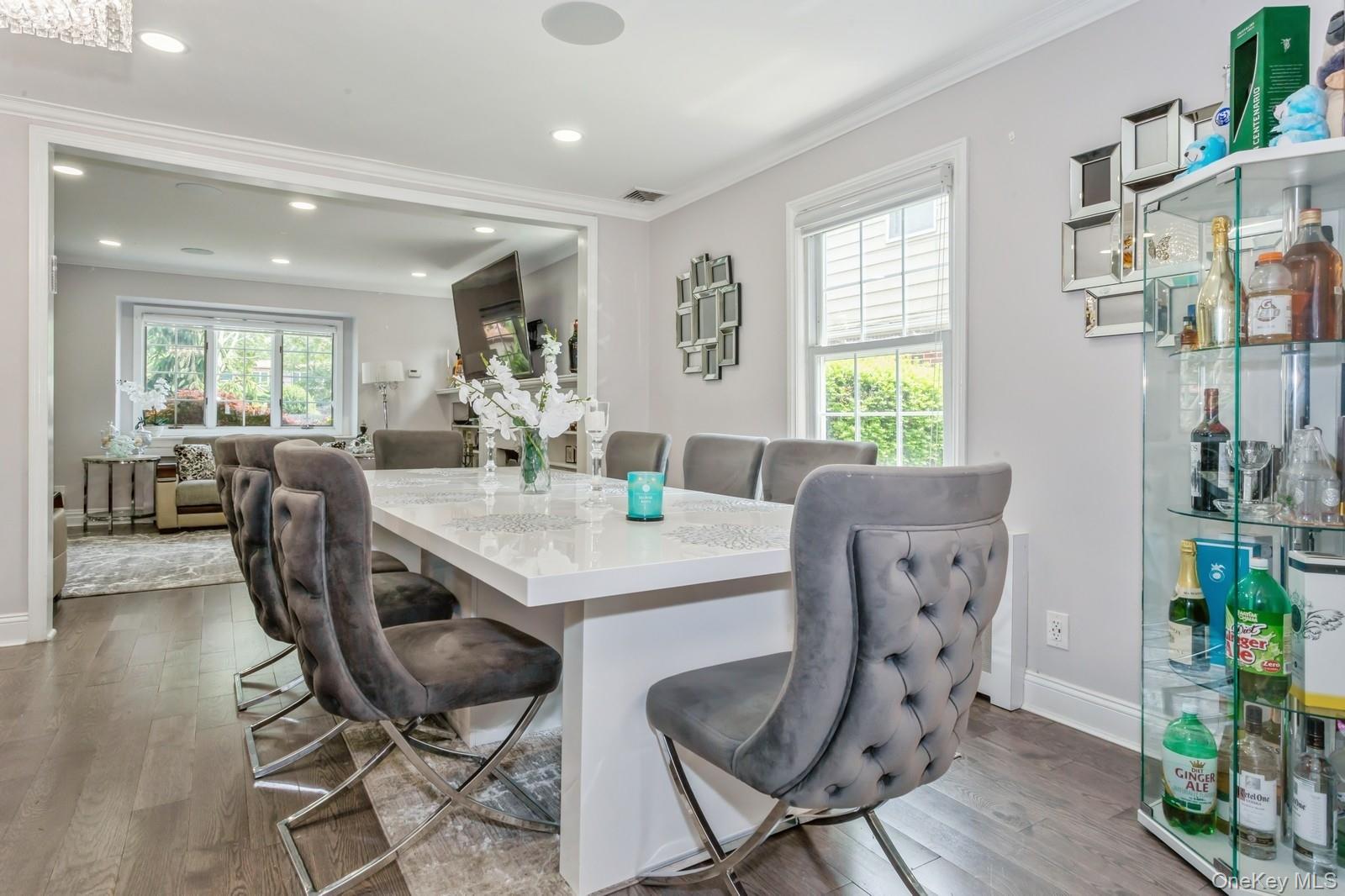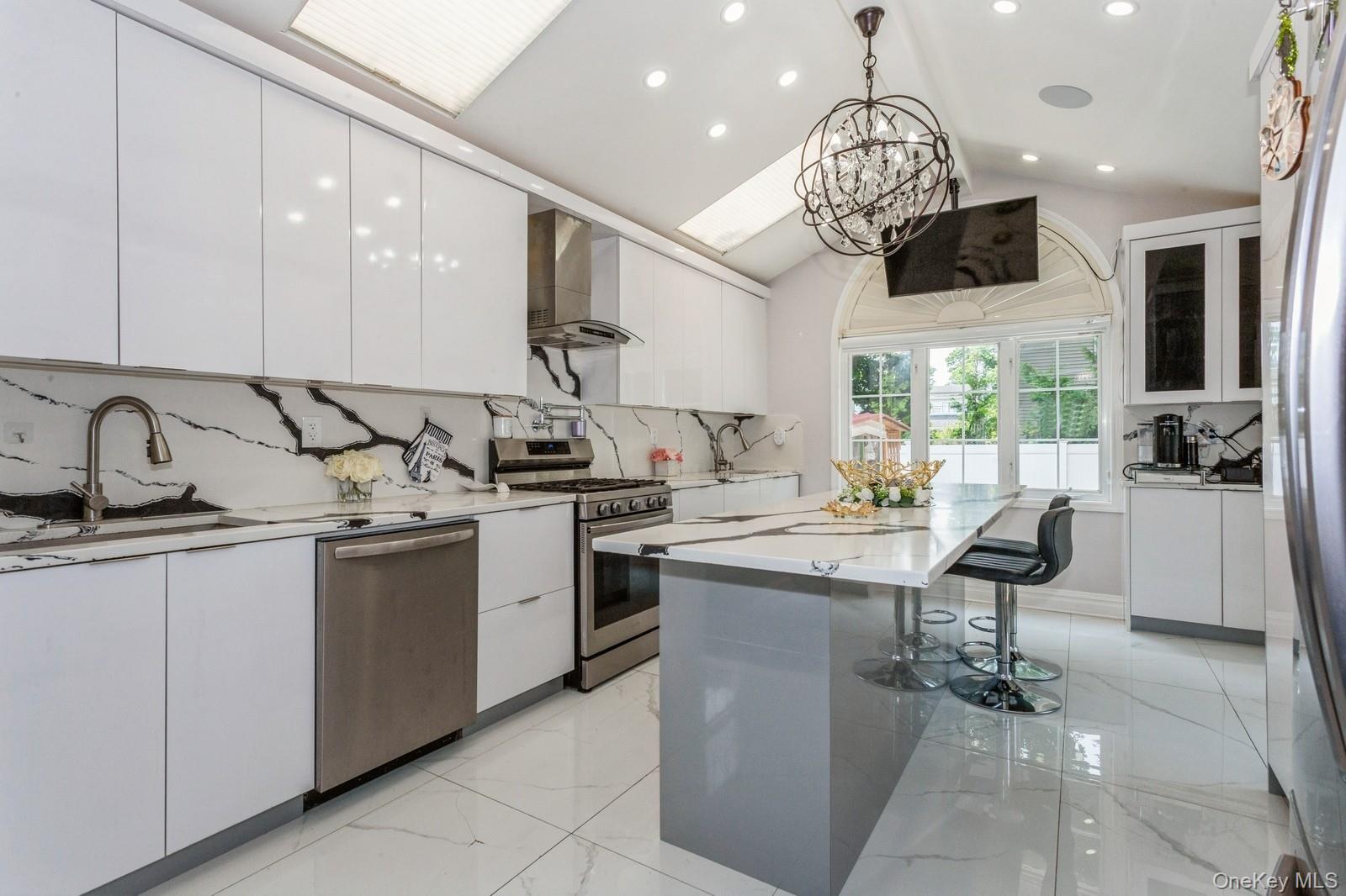 Move right into this stunning renovated COLONIAL in LYNBROOK SCHOOLS District #20. Welcome to this beautifully updated 4-bedroom, 2-bath home, ideally situated on an oversized lot on a tree-lined street. This home is move-in ready and features a range of luxury upgrades. Step into the inviting foyer with a convenient coat closet, leading to an elegant and spacious living room featuring a wood-burning fireplace, bay window, built-in speakers, hardwood floor throughout the house, and energy-efficient LED spotlights. The expansive dining room seamlessly flows into a cozy TV room, perfect for gatherings and entertaining. The heart of the home is a stunning, oversized, custom white eat-in kitchen: radiant floor heating, 2 sinks, cabinets with pull out drawers, LED under-cabinet lighting, built-in pantry with pull-out drawers, stainless steel appliances and gas stove with pot filler, quartz countertop with a matched backsplash for a seamless modern look, large center island with seating, two skylights, large arched window, and sliding glass doors that open to the backyard brings an abundance of natural light. A first-floor bedroom and updated full bathroom offer flexibility for guests or extended family. The 2nd floor has 3 spacious bedrooms and a full bathroom. European custom interior doors, central AC, ductless mini-splits, gas cooking, plenty of closet space, full finished basement with washer & dryer, full attic for extra storage, and attached garage. Enjoy the oversized, paved backyard ideal for entertaining with built-in speakers, water and gas connections for an outdoor kitchen, retractable awning, security cameras, solar panels, and new PVC fencing. No Sandy damage and no flood insurance required. This exceptional property is a true must-see. Schedule your private tour today and experience this beautifully renovated home for yourself!