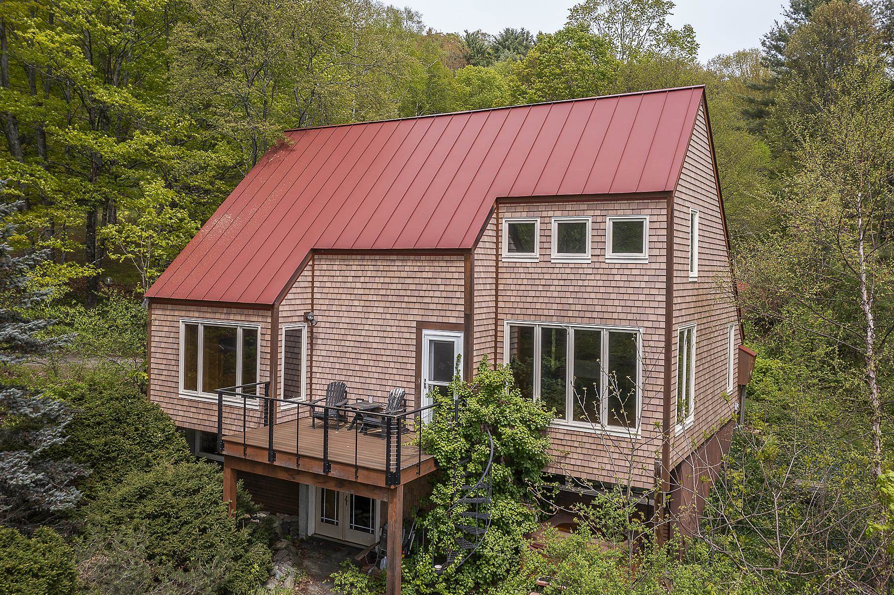 Enjoy privacy and lovely views from this well executed contemporary home overlooking copious gardens and mature plantings to a spectacular pond with an arched footbridge (spotlights highlight the bridge after dark) to access your own little island. Beautiful updates throughout the home include new maintenance-free manufactured cedar-tone shingles on the entire house and workshop shed. The kitchen features custom oak cabinetry, granite counters and updated appliances. The living room has sweeping cathedral ceilings, hardwood walls, oversized windows, and a wood burning fireplace. There is a primary Bedroom ensuite, and a guest powder room off of the foyer mudroom complete with slate floors. Step out to a private iron balcony with Trex decking and spiral stairway accessing a stone terrace below complete with fire pit, water feature and screened gazebo. Upper level has a spacious loft area, and a second bedroom. The walk out lower level includes a third bedroom, studio/rec room (could accommodate overflow guests) and laundry, plus a wine or root cellar. Oversized two car garage with plenty of storage above. Located just minutes from I 91. Easy access to Upper Valley, DHMC, Woodstock, skiing and all recreation.