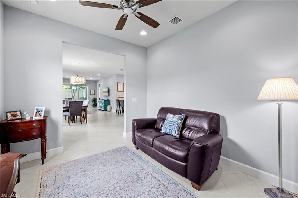 Welcome to Tidewater, where this attached villa by Pulte is located in an active Del Webb 55+ community, in the heart of Estero. Built in 2017, this home has been meticulously cared for, and offers 2 bedrooms + Den, 2 baths, and a 2-car attached garage. Come inside where this open concept spacious living area offers tile flooring on the diagonal throughout the main living area, den, baths and laundry, and carpet in the bedrooms. The upgraded, light/bright kitchen offers granite countertops, tile backsplash, stainless appliances, a pantry and natural gas for cooking. The split bedroom floor plan provides ideal privacy between the guest room and your spacious master suite. The master en-suite has an oversized walk-in shower, dual sinks, linen closet and large walk-in closet. Outside, the expanded screened lanai, offers a covered area to relax or entertain in the shade, and beyond the covered area, the lanai is expanded to enjoy the warm rays of the sun. Tidewater by Del Webb, is in Estero's premier 55+ community! The award-winning amenity center, offers bocce, Pickleball, tennis, a resort-style pool, a full-time social director and more! This active community offers the perfect location in Estero. Close to RSW Airport, Miromar Outlets, Hertz Arena, I-75. . . and more. Welcome home!