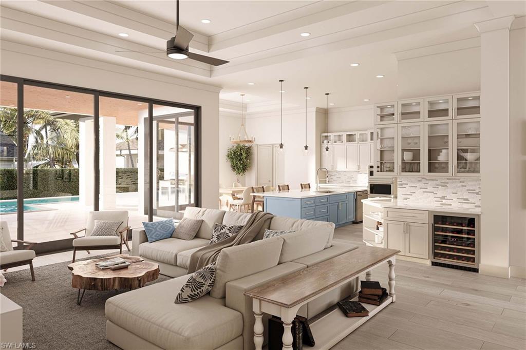 Newly completed coastal contemporary new construction only blocks from Residents' Beach. Expansive great room with open concept: gourmet kitchen with Shaker cabinets, shadow boxes and quartz countertops. Crown molding throughout. GE Profile & Cafe kitchen appliances. Over 2500 square feet, 5 bedrooms, 4 baths. 12-foot ceilings with double tray, peaking at 14 feet. Shaker cabinets with quartz tops in all bathrooms & laundry room. Spacious primary suite has two closets, soaking tub and separate shower. Wood plank porcelain tile throughout. Hurricane windows & doors. Inviting pool & cascading spa surrounded by marble tile lanai. Stackable sliders open to ample covered space, perfect for indoor/outdoor living. Custom outdoor kitchen includes built-in grill, counter refrigerator, custom exhaust fan encased in stucco, sink and granite countertop. Metal roof. Epoxy garage floor. Paver stone driveway. Excellent rental potential! Similar properties in this area can rent for upwards of $14, 000/week during High Season.