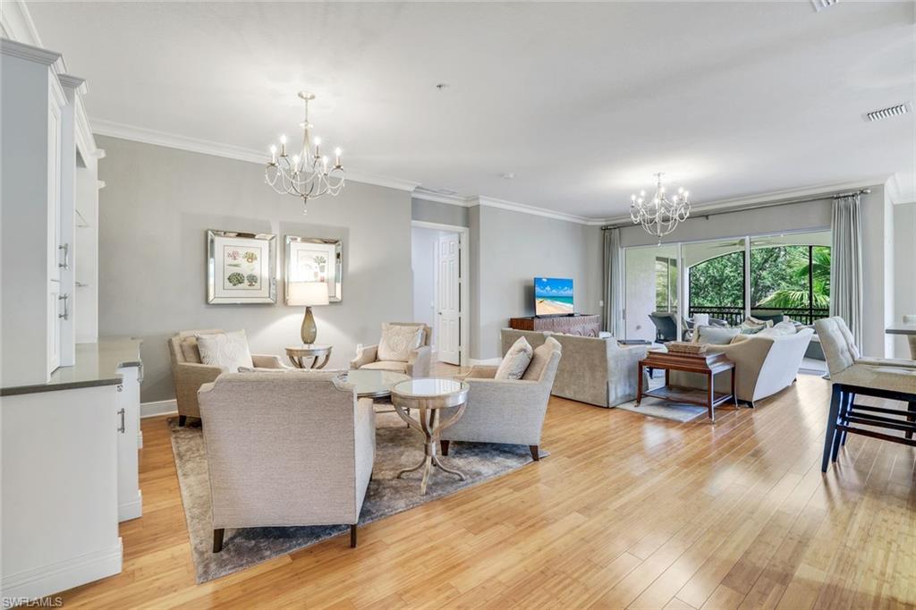 One of the finest second floor end-unit coach homes in Cascada at Fiddler's Creek, offered turnkey with 3 bedrooms, den and 3 full bathrooms. This stunning residence boasts 12-foot custom coffered ceilings, crown molding, hardwood flooring, upgraded carpet in bedrooms & tile flooring throughout. The gourmet kitchen features floor-to-ceiling custom cabinetry, quartz countertops, glass backsplash, Jenn-Air stainless steel appliances with natural gas oven, quartz island for extra seating, and custom bar with built-in wine cooler. The spacious master suite includes coffered ceilings, crown molding, chandelier, and a luxurious ensuite bathroom with dual vanities, upgraded tile flooring, large glass shower, and a soaking tub. Guest bedrooms offer ensuite bathrooms, custom wainscoting, large closets, bunk beds for young guests, and custom draperies. Landscape views from the expansive 12x24 screened lanai that is perfect for entertaining.