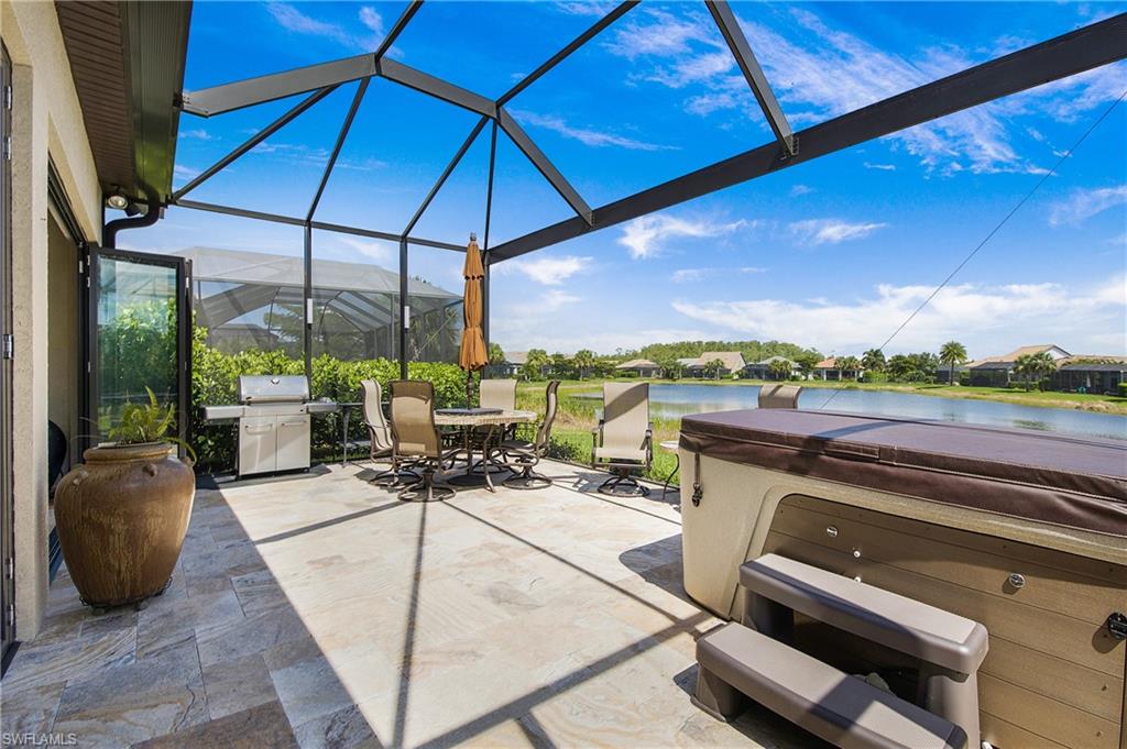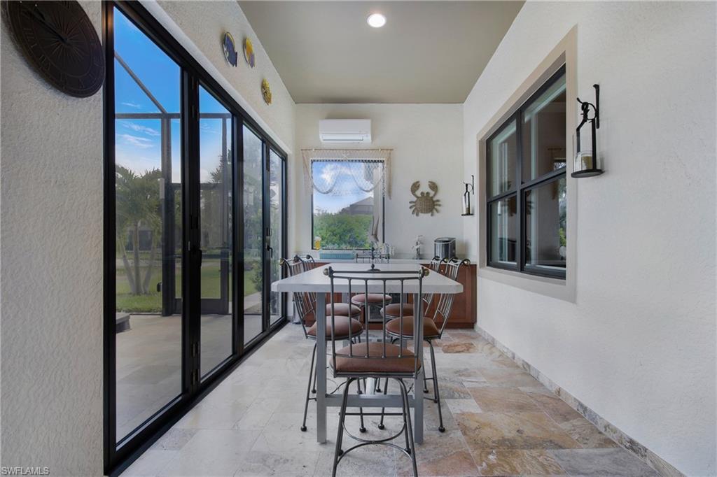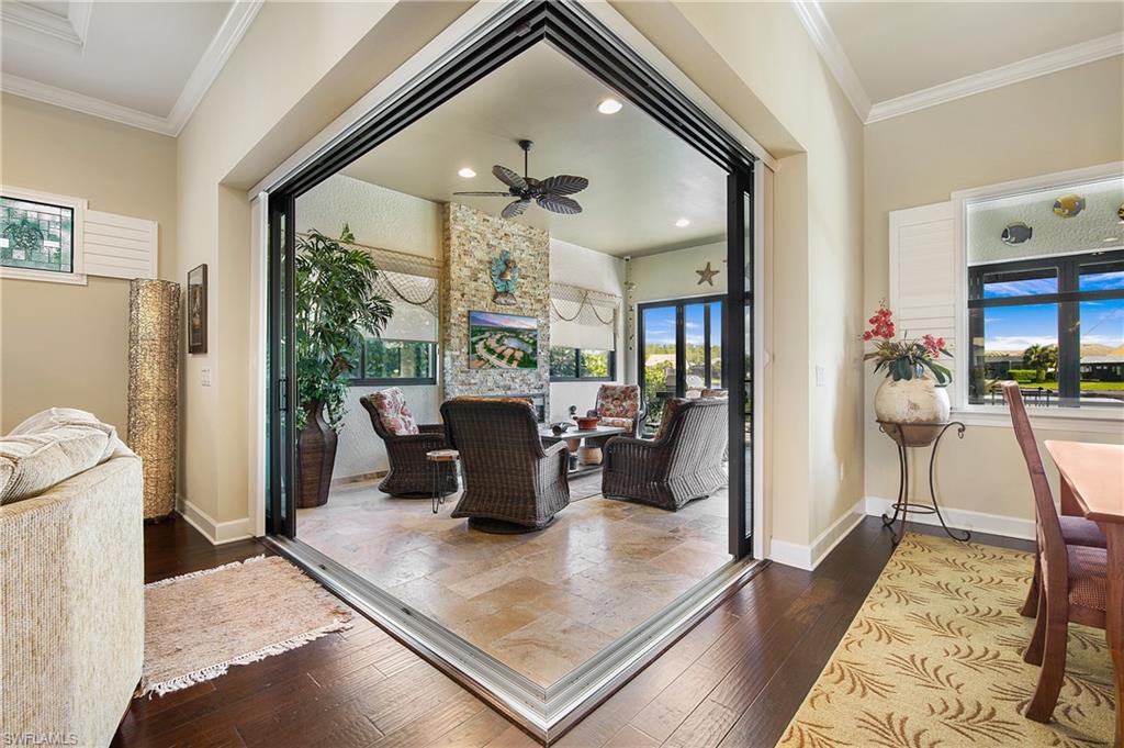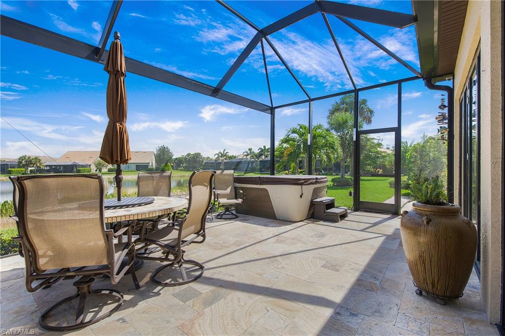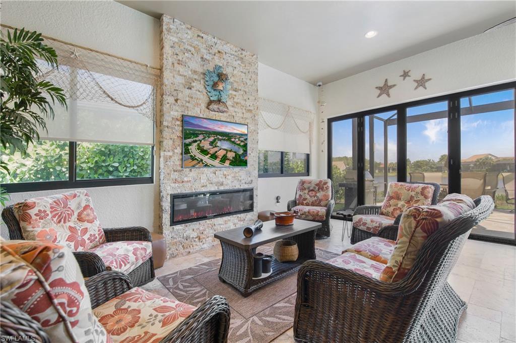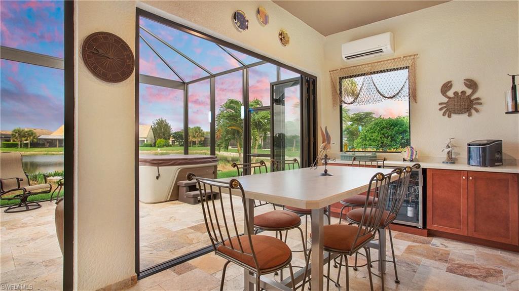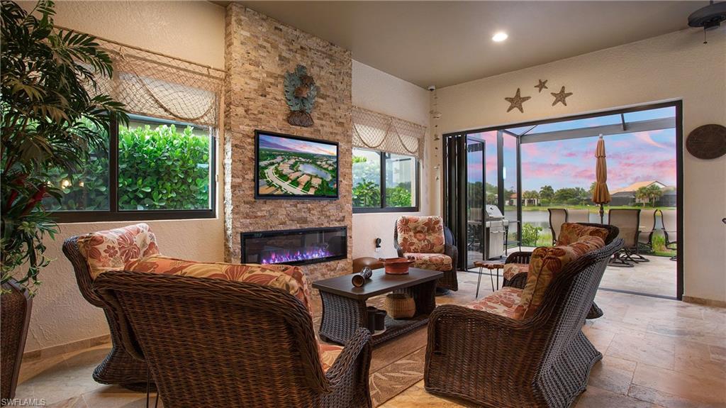 HIGHLY SOUGHT AFTER COMMUNITY! Freshly painted interior, this beautifully upgraded Summerwood model in the highly desirable gated Community of Corkscrew Shores. Located on the quiet Arrow Point Court. One of the home’s most impressive features is the custom air-conditioned Florida Room, complete with a built-in fireplace, stone accent wall, wet bar, mini-fridge, and bar-height seating and a new mini split A/C—ideal for entertaining year-round. This space is permitted and enclosed with hurricane-impact windows and NANA-style Hurricane bifold doors, which fully open to reveal an extended screened lanai with a picture window screen overlooking a peaceful lake view. The outdoor space continues to impress with a large, heated spa, perfect for relaxing in a private, tranquil setting. This 2-bedroom + den, 2-bathroom home offers exceptional indoor-outdoor living and thoughtful custom features throughout. Step inside to find rich wood flooring, fresh interior and exterior paint, and a spacious, light-filled layout designed for modern living. The open kitchen features gorgeous granite countertops with a center island and walk in pantry, beautiful custom cabinets with a designer backsplash, reverse osmosis system, and stainless-steel appliances. The traditional third bedroom has been converted into an extended garage—perfect for additional storage, hobby space, or a workshop. Additional upgrades include Zero-corner sliding glass doors. Both bathrooms have been completely remodeled with updated flooring and finishes, offering a sleek, spa-like feel. The owner’s suite features a large walk-in closet and a private en-suite bath with dual vanities and an oversized walk-in shower. An upgraded laundry room with custom cabinetry, full-size refrigerator, and new washer & dryer. As a resident of Corkscrew Shores, you’ll enjoy an unmatched lifestyle with access to a 240-acre lake, resort-style pool, clubhouse with restaurant & bar, fitness center, kayak launch, tennis, pickleball, walking trails, and more—all with no CDD fees. This one-of-a-kind home blends luxury and comfort in one of Estero’s most sought-after communities.