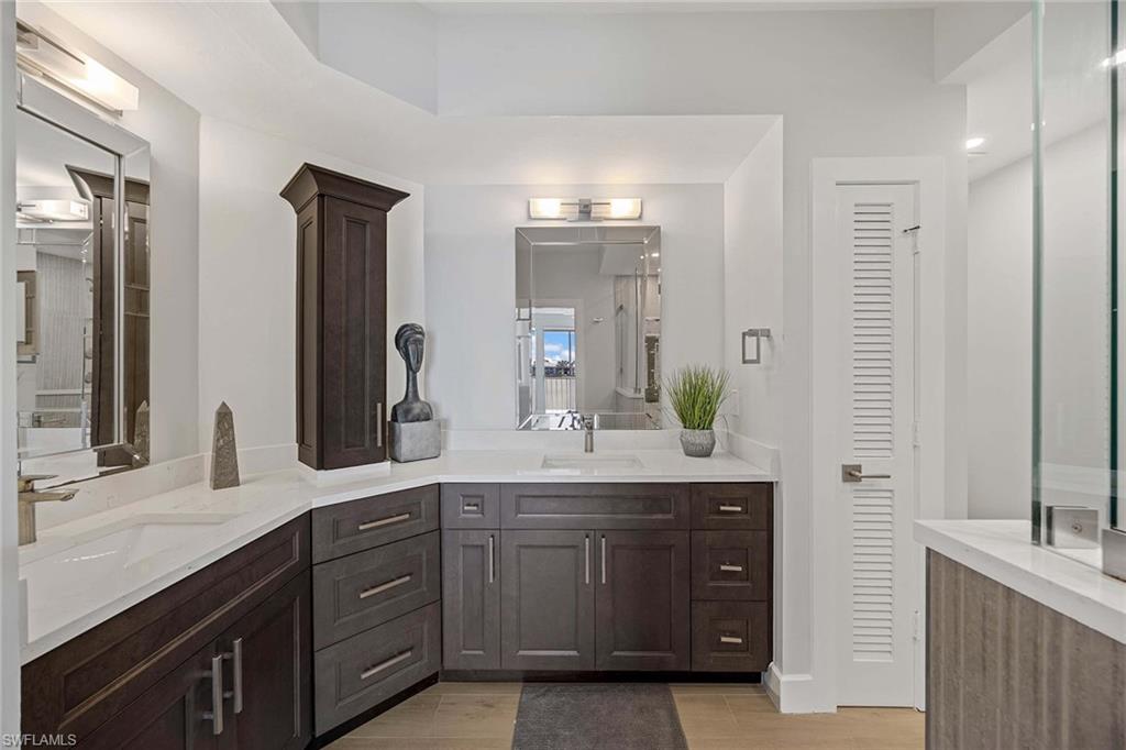 tranquil Bay views. The primary suite offers an upgraded ensuite bath complete with double vanities, wood cabinetry, and a luxurious walk-in