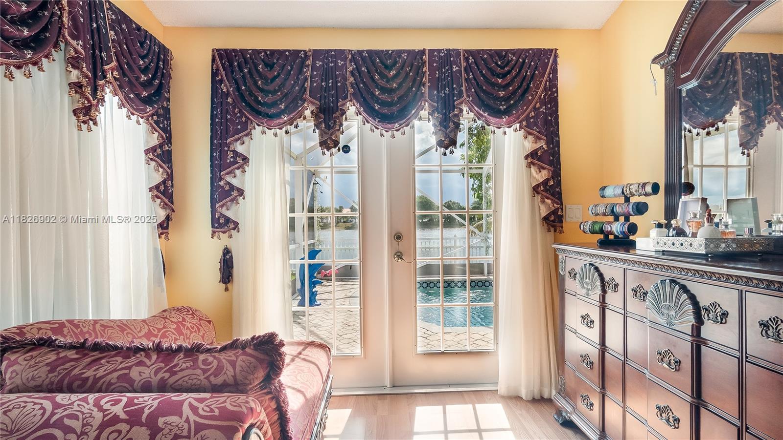 Welcome to this beautiful lakefront single story pool home located in the prestigious Flamingo Estates at Trilogy. Enjoy peaceful water views from your own backyard retreat, featuring a screened-in pool and patio—ideal for both relaxing and entertaining. This well-maintained home offers 4 bedrooms, 2 bathrooms, high ceilings, and an open layout filled with natural light. The updated kitchen includes granite countertops, stainless steel appliances, a breakfast nook, and plenty of space to gather. The spacious primary suite offers a walk-in closet and a spa-inspired bath with a soaking tub and separate shower. Located near parks, trails, playgrounds, picnic areas and top-rated schools, with easy access to shopping, dining, and major roadways. A perfect balance of comfort and convenience.