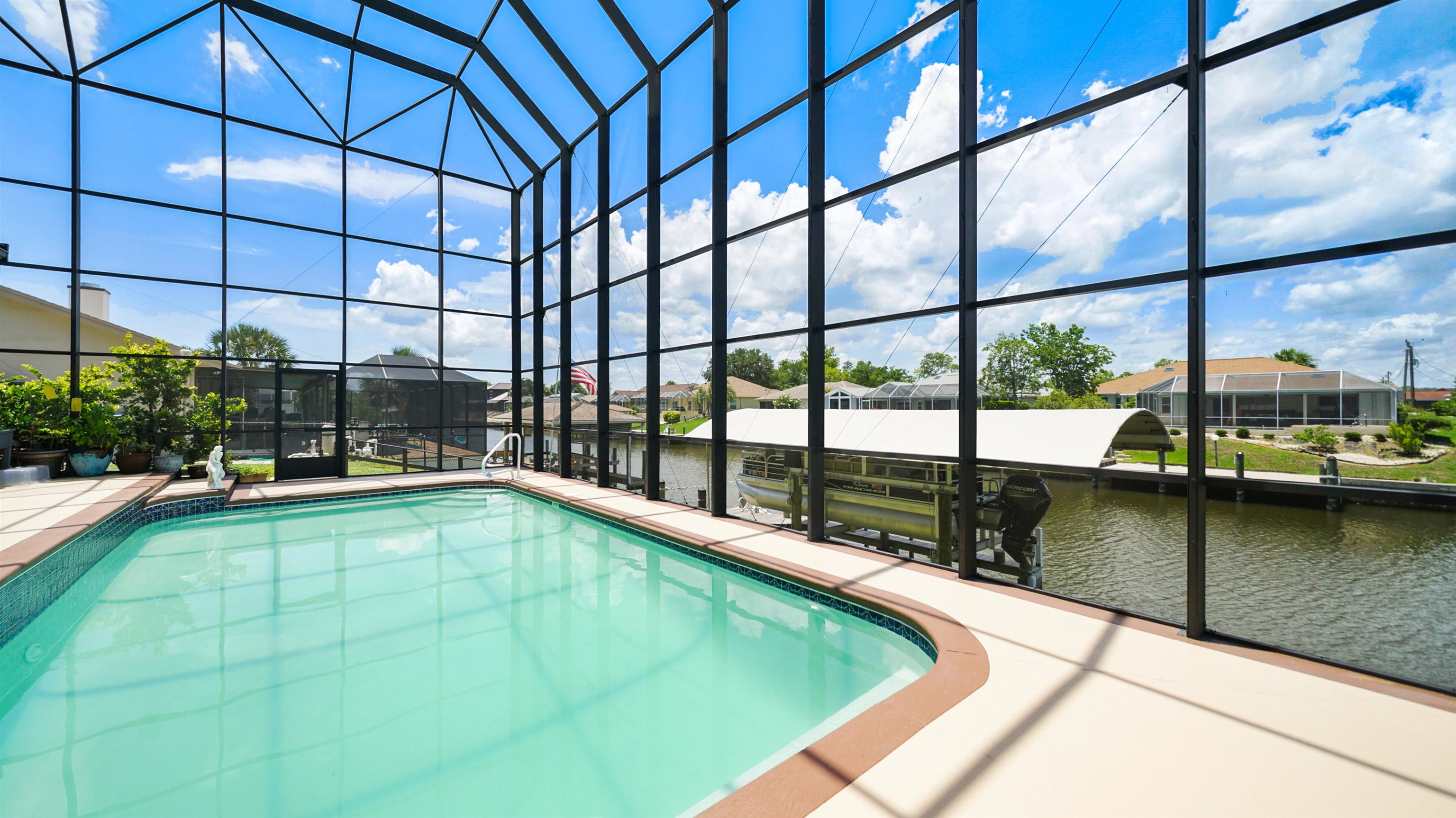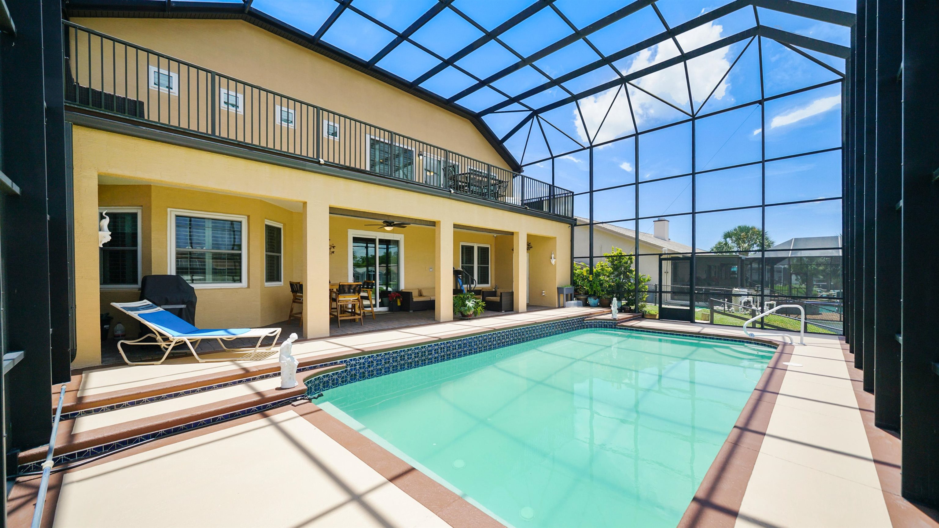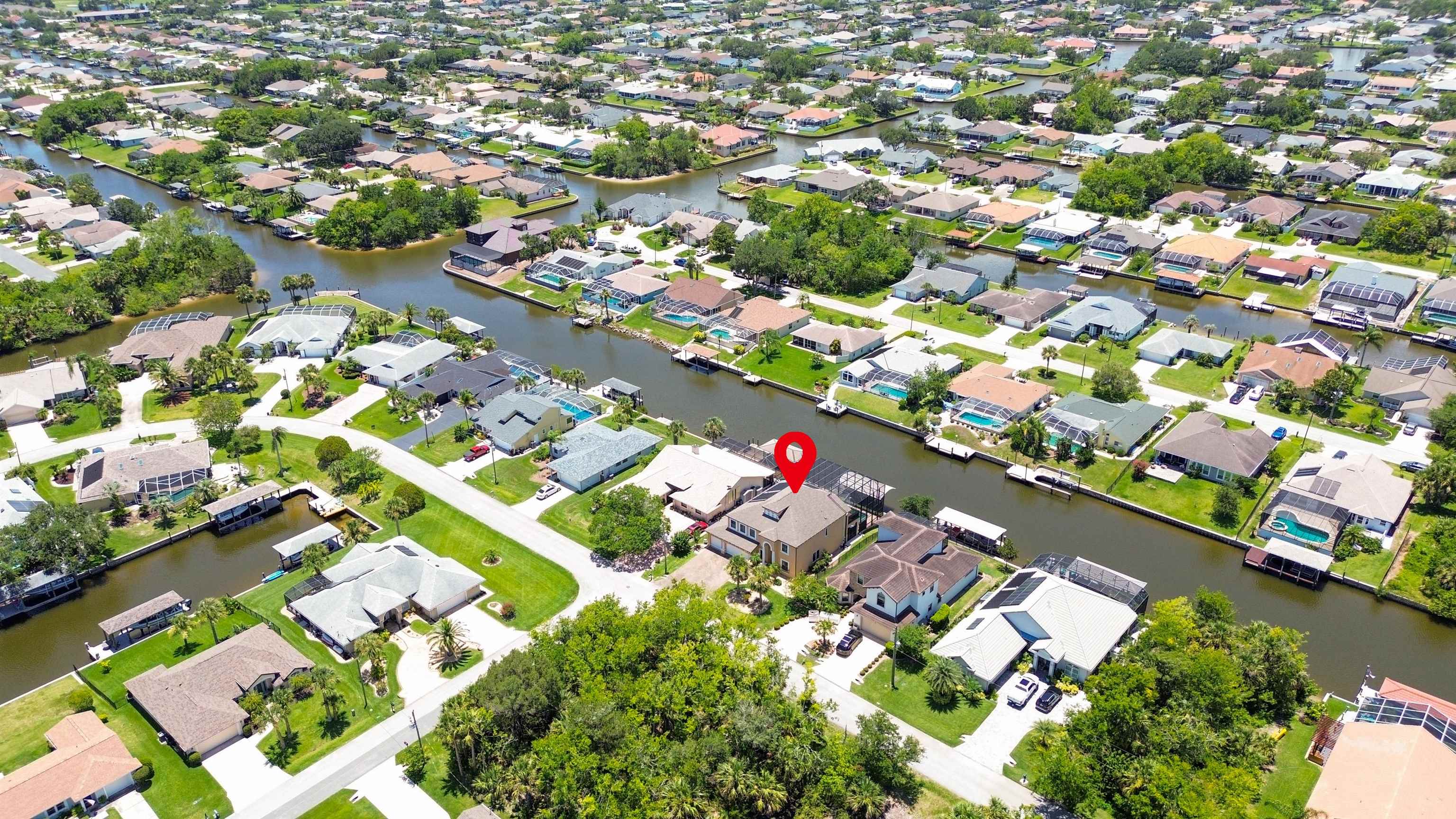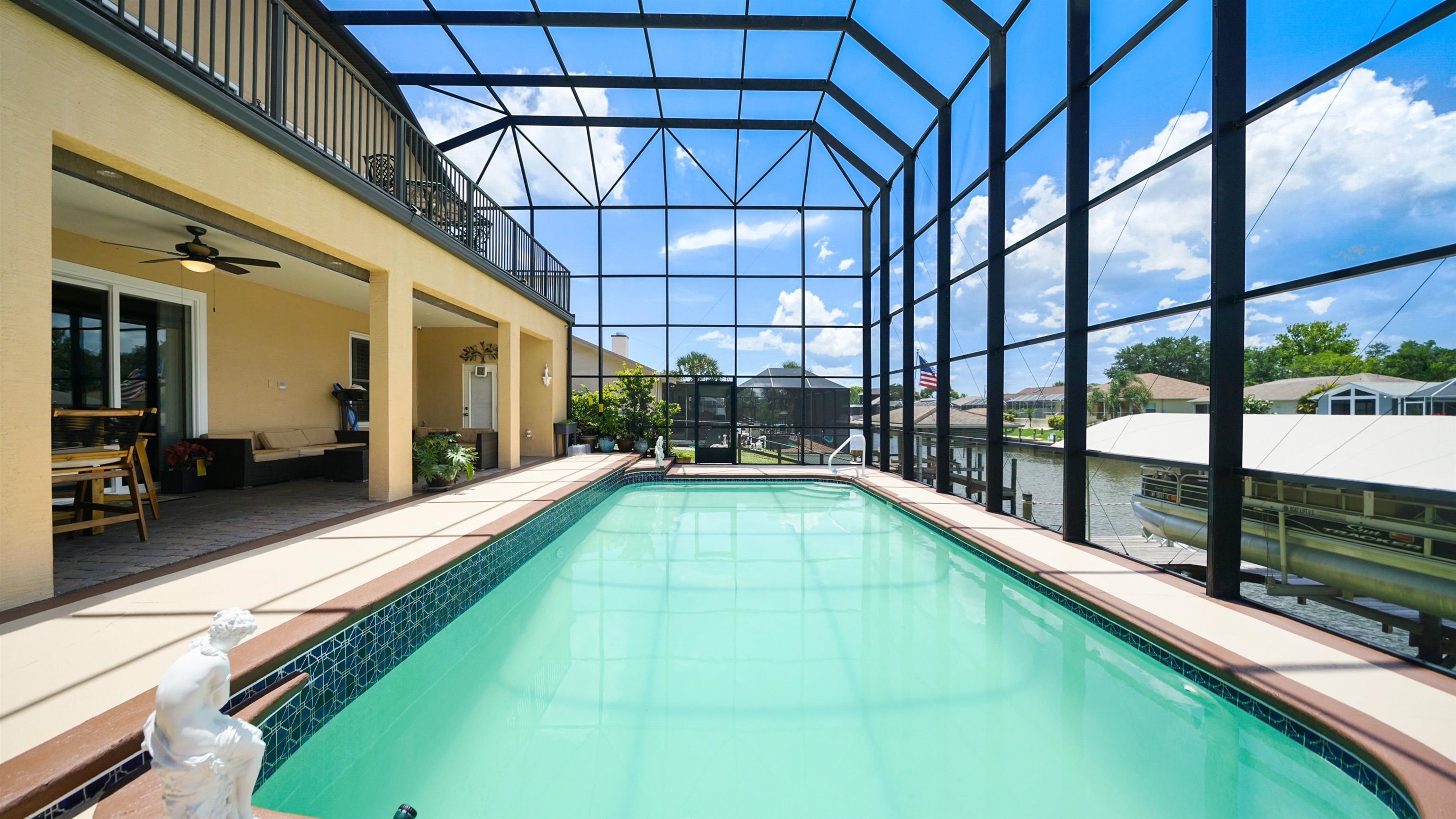 This exceptional concrete block home offers the ideal blend of waterfront luxury and everyday comfort. Nestled on a quiet canal with direct access to the Intracoastal Waterway, the property is a boater’s paradise—complete with a 31-foot dock (13. 5 feet wide), a boat lift, and full water and electric connections already in place. Beautifully landscaped with lush, low-maintenance greenery, the exterior delivers striking curb appeal without the hassle. Step inside to a bright, open-concept layout where the granite and stainless steel kitchen flows seamlessly into the sunlit living area. Elegant details like crown molding and plantation shutters add warmth and sophistication throughout. The nearly 30-foot-long pool invites morning laps or afternoon lounging, all within the dramatic setting of a two-story screened lanai. From the expansive second-story balcony, take in peaceful sunset views over the water. The spacious primary suite is conveniently located on the main level for privacy and ease. Upstairs, you’ll find three oversized bedrooms, a generous loft, and a dedicated media room—perfect for family living or hosting guests. A rare three-car garage offers abundant storage for vehicles, water toys, and more. Turn-key and thoughtfully designed, this low-maintenance home captures the very best of Florida living—boating, swimming, sunsets, and space for everyone to enjoy. All information pertaining to the property is deemed reliable, but not guaranteed. Information to be verified by the Buyer. Be advised that cameras may exist recording audio and video inside/outside the property, such as ring doorbells. Photos are digitally enhanced and could be altered, please verify.