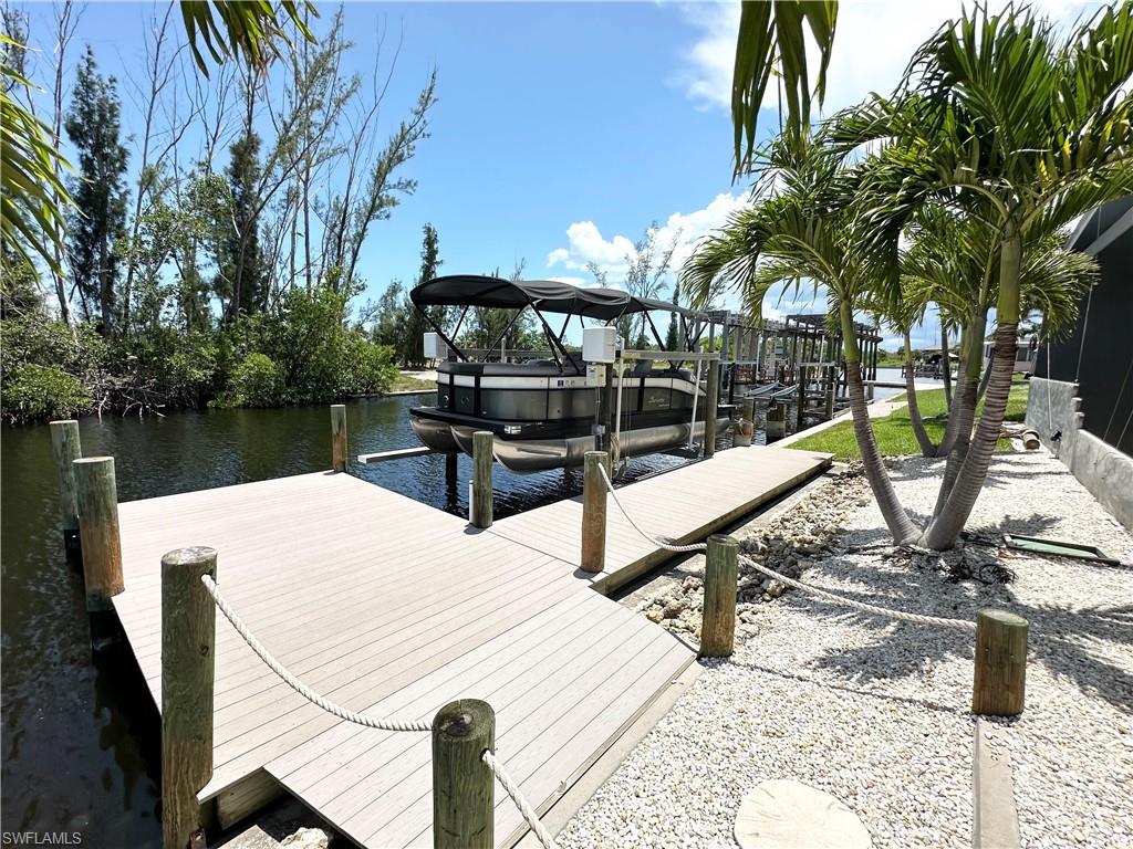 You have worked hard all your life, you raised your kids, done well for yourself-----and now it’s YOUR time. It’s time to enjoy what you have toiled all these years for. And what better way to reward yourself than to buy that vacation home in Southwest Florida you have been dreaming of. Imagine, a place to get away from the cold northern winters, a place with endless sunshine, white sandy beaches, tiki bars on every corner and a place to let the grandkids build sandcastles and write their names in the sand. Well, you need to look no further. This spectacular Bayside Estates home has that “wow factor” from all vantage points, especially when you first walk in. It is spacious, amazingly apportioned, fabulously decorated and nothing less than stunning. The focal point of the home is the kitchen, dining area and great room which seamlessly blends functionality with luxury. Both bedrooms are nicely sized, and the bathrooms are spacious and offer custom tile work and quartz countertops. The master bath has a spacious walk-in shower lined with thick, clear glass. There is a bonus room opposite the kitchen with a couch, chair and TV—a great place for the grandkids to entertain themselves while the adults do their thing. Equally as impressive as the inside of the home is the is the rear of the property. Adjacent the waterfront is a 55’ X 25-foot custom built lanai. Inside this lanai is a tiki bar complete with an outdoor TV, BBQ, sitting area and a lounge area to work on those tan lines. Beyond the lanai is a custom-built dock and boat lift which currently houses a pontoon boat. Make an appointment to see this home today and start living the dream.