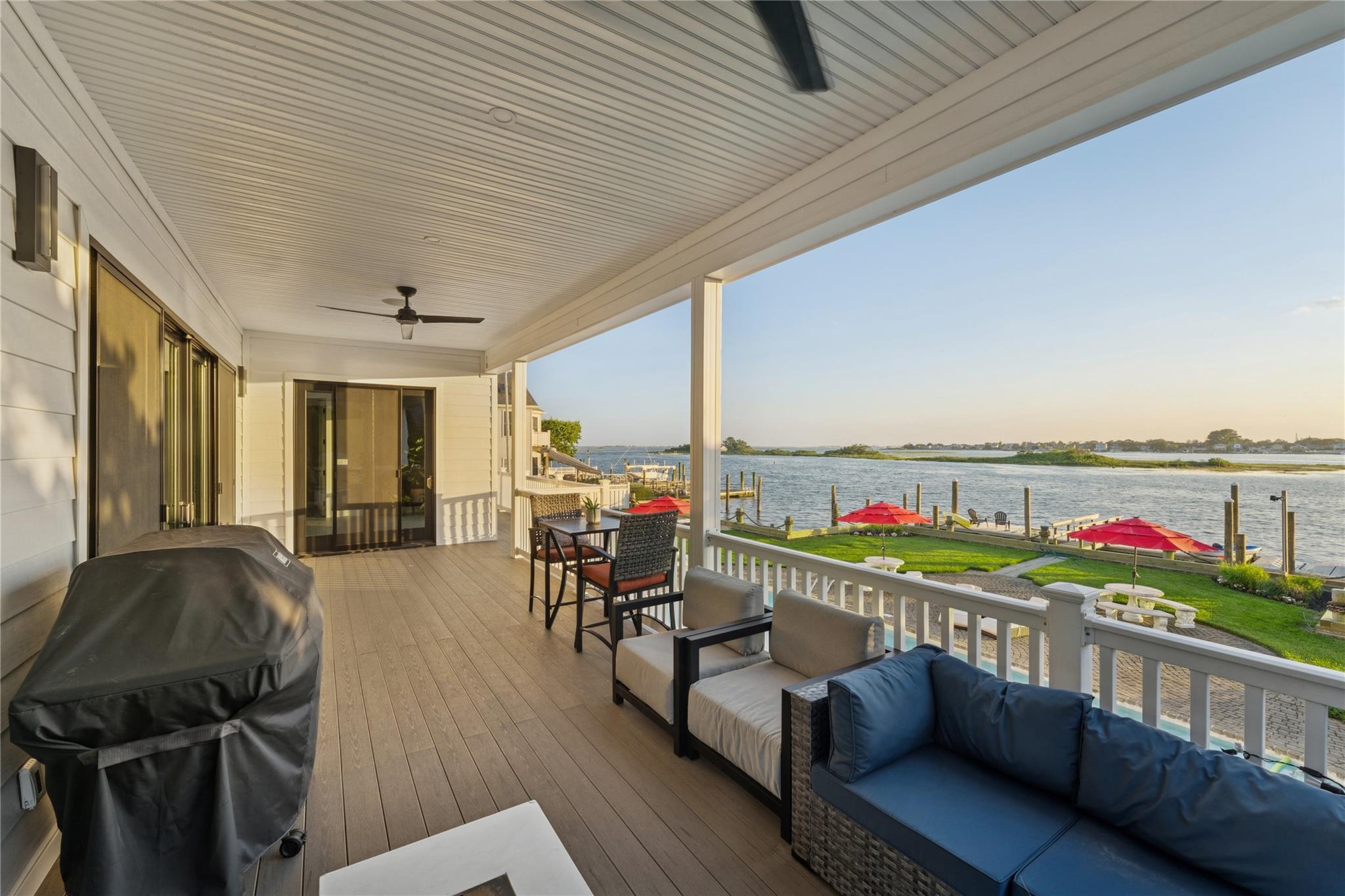 This Modern Luxury Home is a Three-Level Masterpiece Nestled Along the Bay. The home Features an Elegant Design with 10-foot ceilings that Enhance the Open, Airy Feel Throughout. Andersen Windows and Doors Flood the home with Natural light, emphasizing the modern, sleek aesthetic. The expansive Living Areas include Multiple en-suite Bedrooms, each designed as a private retreat, boasting high-end Finishes and thoughtful layouts. The Gourmet Kitchen is adorned with Floor-to-Ceiling Cabinets outfitted with top-of-the-line Thermador appliances, perfect for both casual meals and Lavish Entertaining. A wet bar and wine refrigerator add a touch of luxury to the space, ideal for hosting guests. The second floor includes a loft that serves as a home office, providing a serene environment for work with stunning views of the bay. A state-of-the-art elevator provides convenient Access to All Levels, Seamlessly Blending Convenience with Sophistication. Outside, French doors Open to a Wrap-Around Deck, Perfect for taking in the breathtaking Water and Sunset Views. The Backyard Features a Heated in-ground Pool, offering a private oasis for Relaxation. For Boating Enthusiasts, the property includes five boat slips, making it a paradise for water lovers. Radiant Heat & Central air conditioning ensures comfort year-round, completing this luxurious waterfront home.