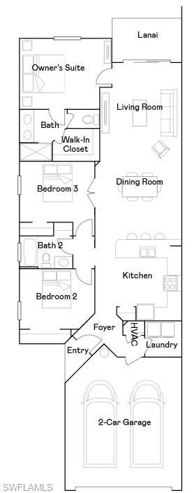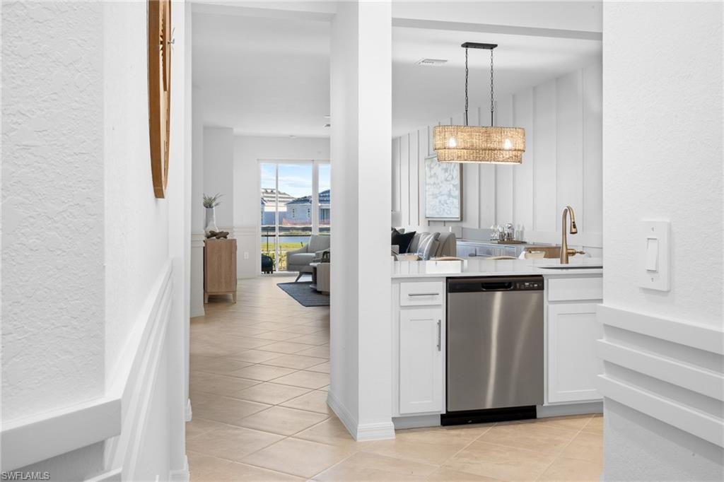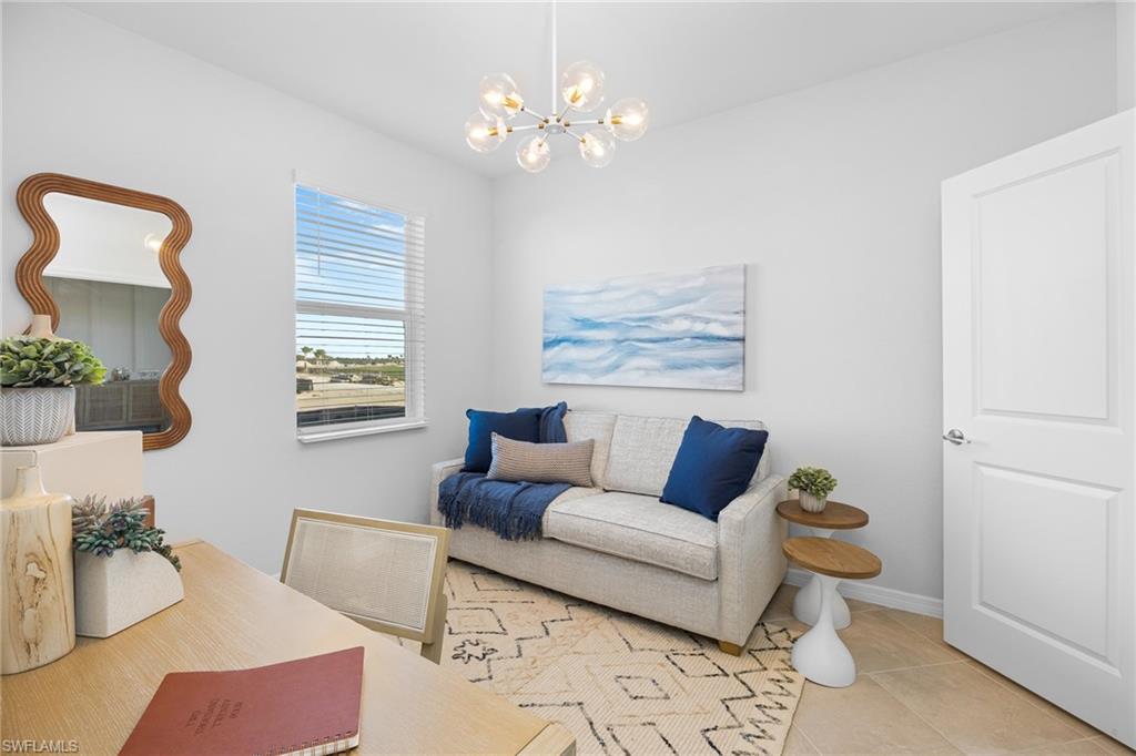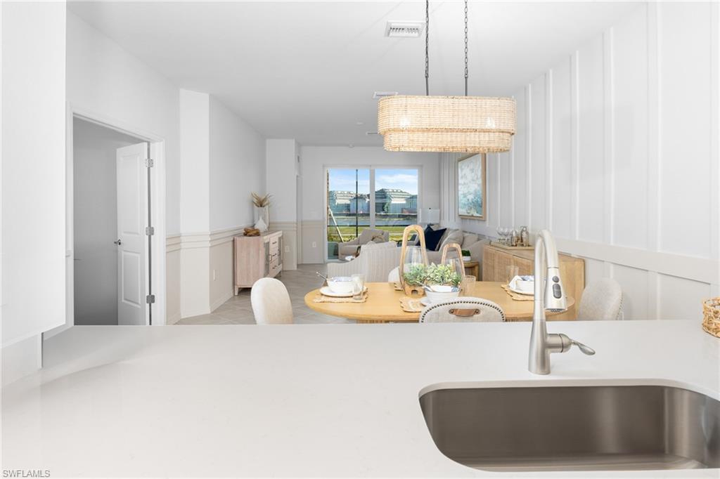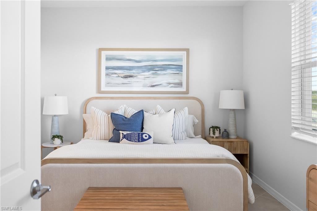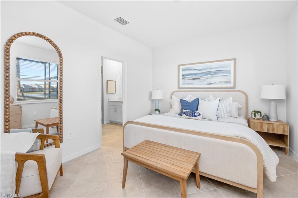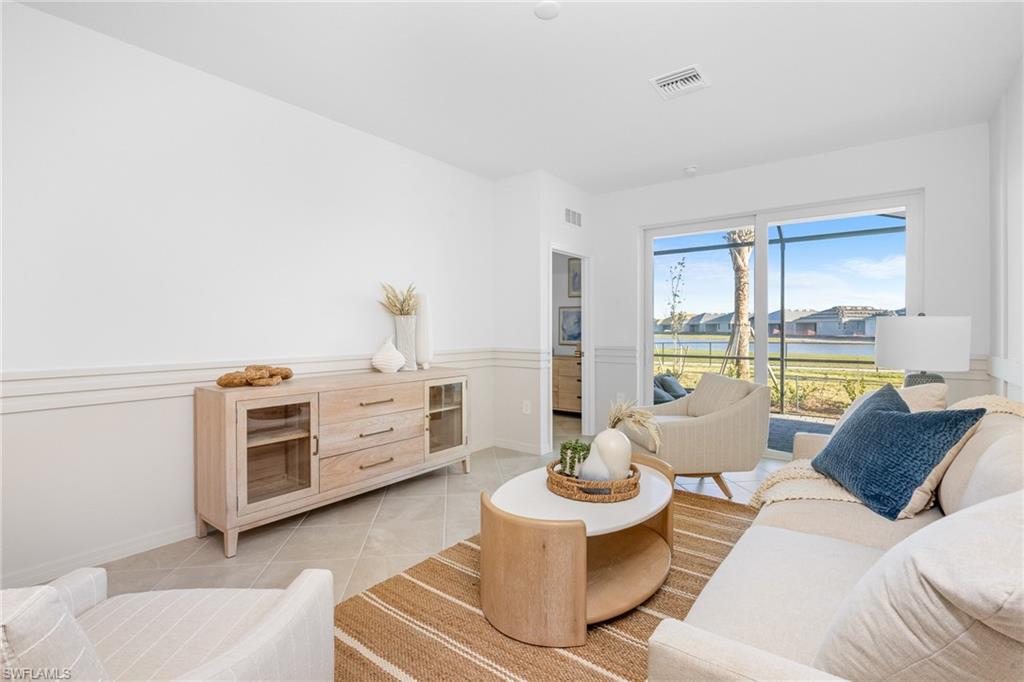 The open-concept floor plan features a spacious kitchen, dining area, and living room that flows seamlessly to a covered lanai, perfect for enjoying Florida’s indoor-outdoor lifestyle. The kitchen is appointed with quartz countertops, designer cabinetry, and natural gas appliances, combining efficiency with elegance. The owner’s suite offers a private retreat with an en-suite bath and walk-in closet, while two additional bedrooms and a full bath are located toward the front of the home for added privacy.