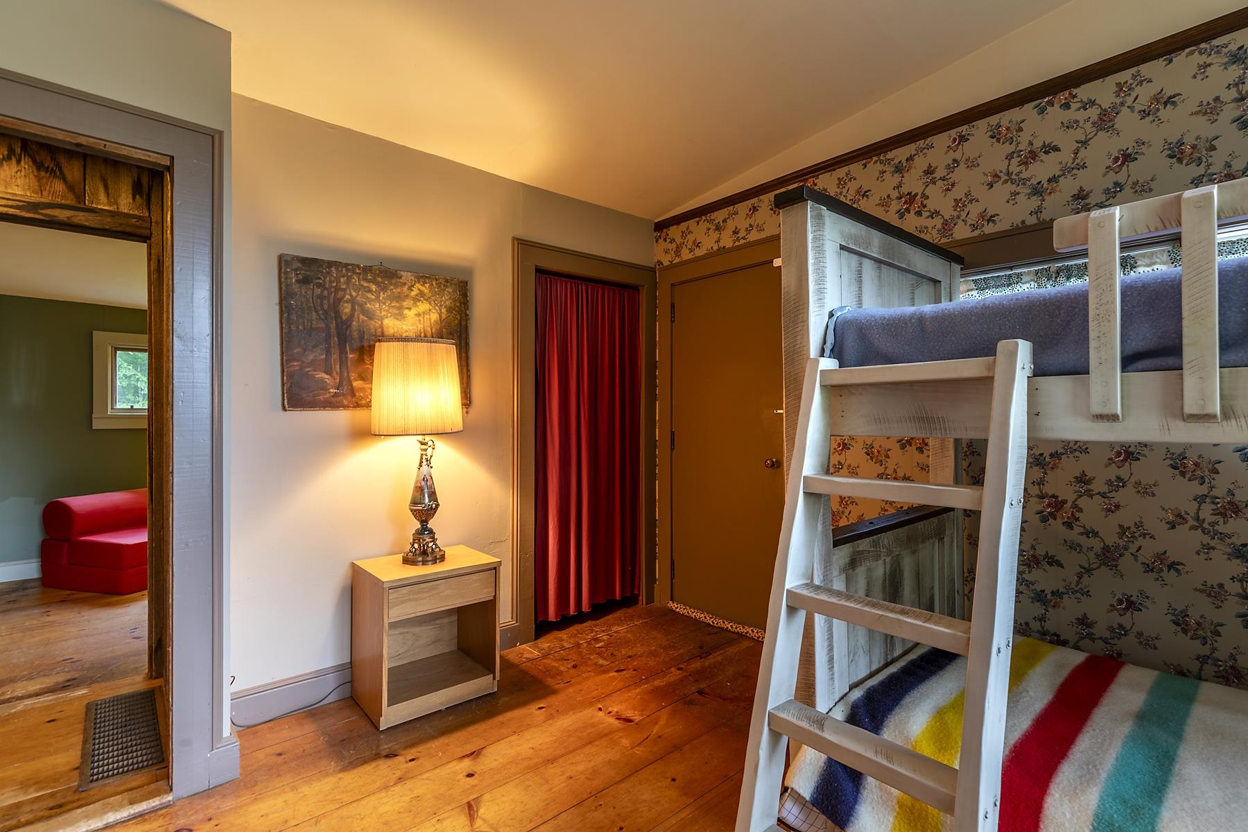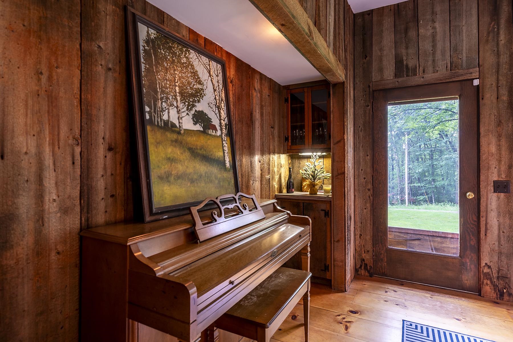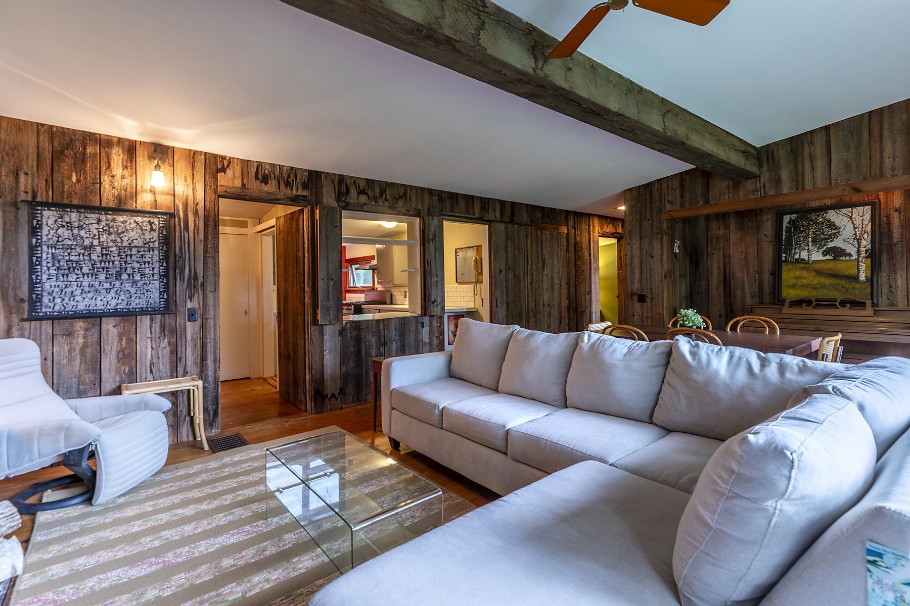PRICE ADJUSTMENT: On a gentle rise surrounded by 7. 5 acres of meadows and woodland, this Vermont style ranch subtly blends an appealing rustic charm with contemporary features. The current owners purchased the property in 2021 for family and friends and installed a new wastewater system, new furnace, new roof section, new appliances. The rough sawn clapboard exterior delineates the enduring character of the house. A fieldstone walkway introduces the central foyer with access to two wings. The focus of one is the living dining gathering area with the warmth of traditional wood paneled walls, pine flooring throughout, a stone fireplace and hearth, views from a window seat, bar entertainment nook, a pass through to the convenient kitchen, and access to the extensive deck. Two guest bedrooms, each with access to the deck, share a full bath and den or sitting room. A third guest bedroom has its own hallway full bath. A later addition wing opens to a spacious primary bedroom en suite with stone fireplace, built ins, cork floor, and window seat. Off a hallway a stairway leads upstairs to recreation room and an office. The attached garage with work space has access to utilities in the basement. A large shed off the back provides additional storage for gardening and equipment. With Bromley, Magic and Stratton resorts, trails, recreation areas, ponds, Manchester and neighboring towns shopping, dining, cultural events, this iconic property awaits the next generation's refurbishments.