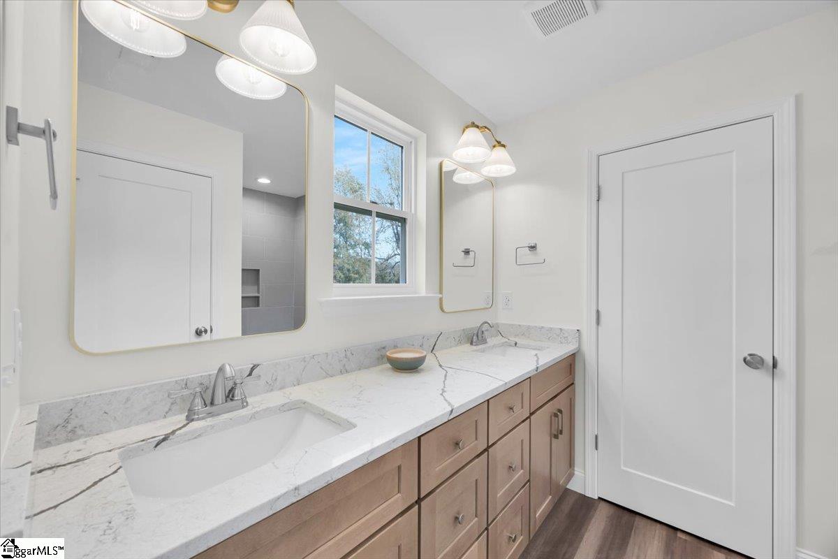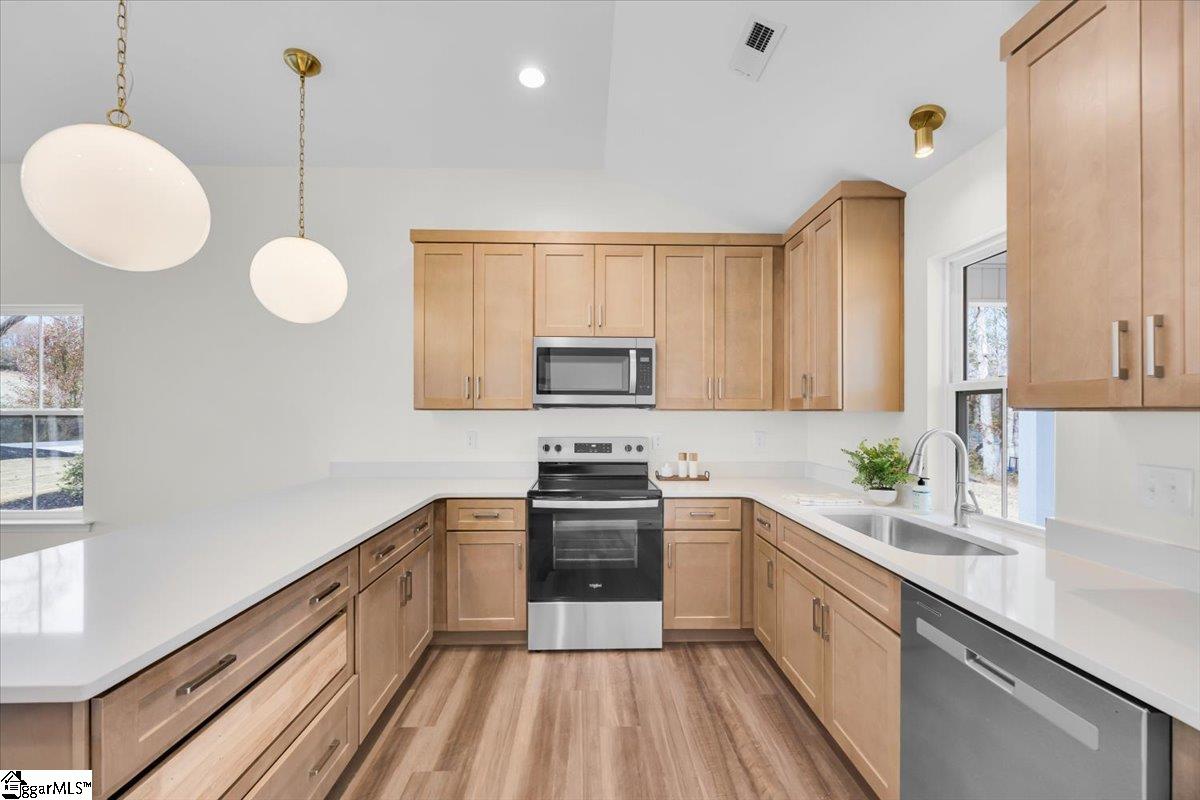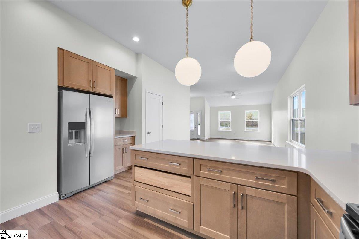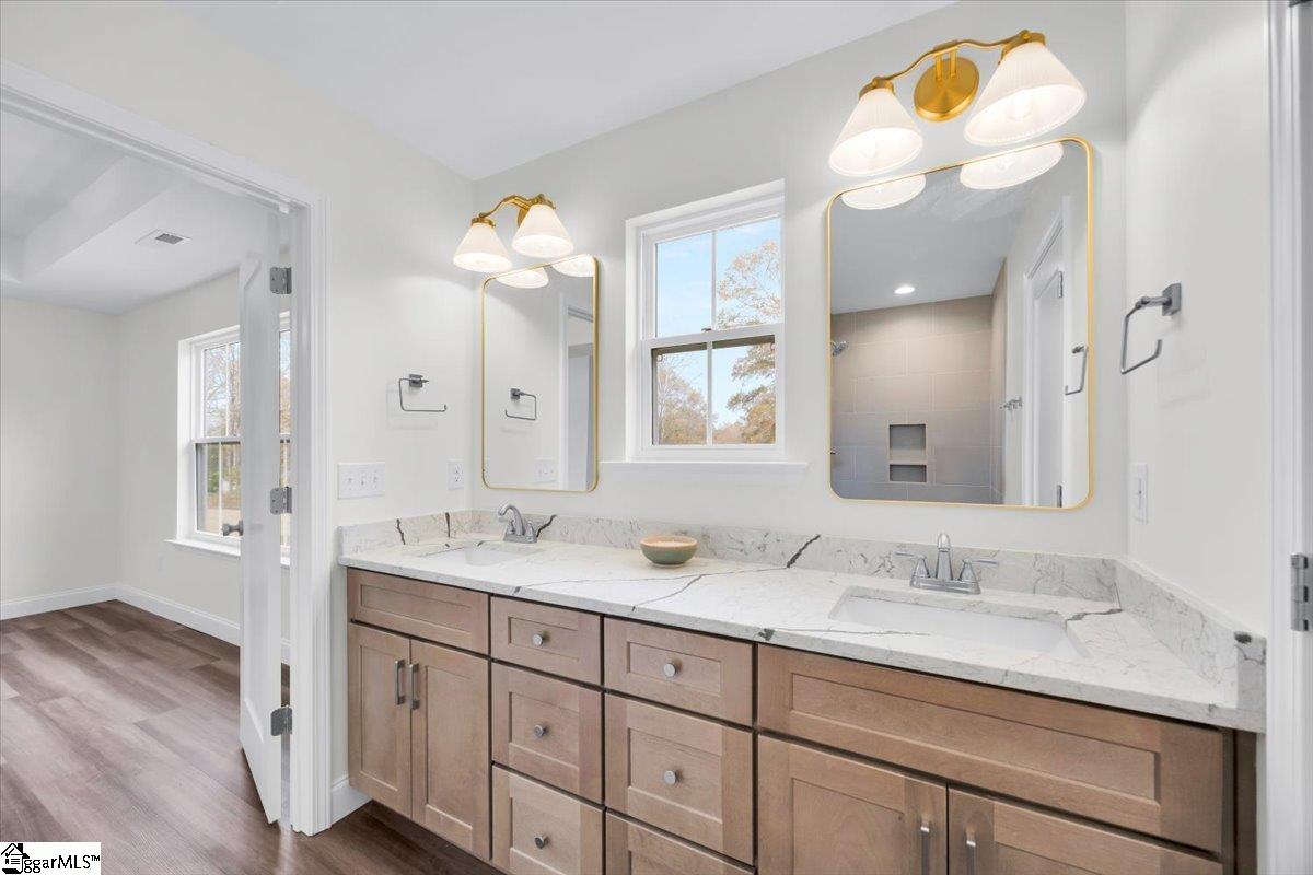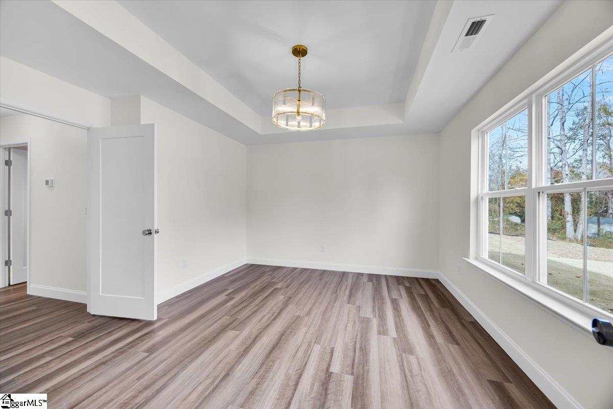 Welcome to your brand new home! This home features a peaceful area without HOA restrictions! The creamy exterior, brass lighting and a lovely soft green front door will have you sold and the sodded yard is ready for you to enjoy! Inside you have a soft green accent wall perfect for a drop zone or artwork. The living room features a ceiling fan and is open to the dining room and kitchen. The kitchen has wood cabinets, quartz countertops, and stainless steel appliances. An upgraded LVP is durable and beautiful and it runs through the entire home. Down the hall there is a walk in laundry room and laundry sink. The guest bathroom has a tub/shower and wood vanity with quartz countertop. There are two guest bedrooms. The primary suite has a tray ceiling and large window as well as an ensuite bathroom. The ensuite has dual vanities with wood cabinets and quartz counters, a walk in shower with a tile surround, and a separate toilet room. There is also a walk in closet. This home also has a 2 car garage. The location is convenient to Campobello and minutes from downtown Landrum and I-26. Make it yours today.