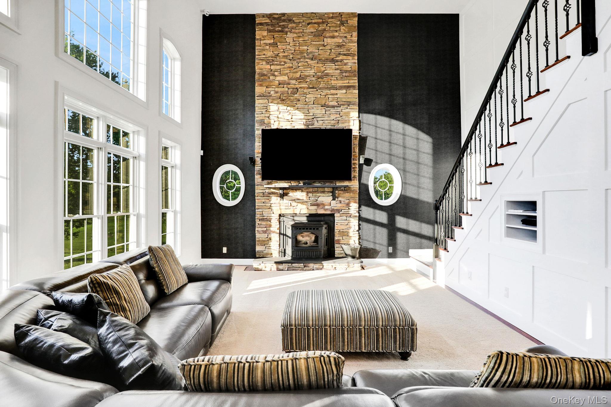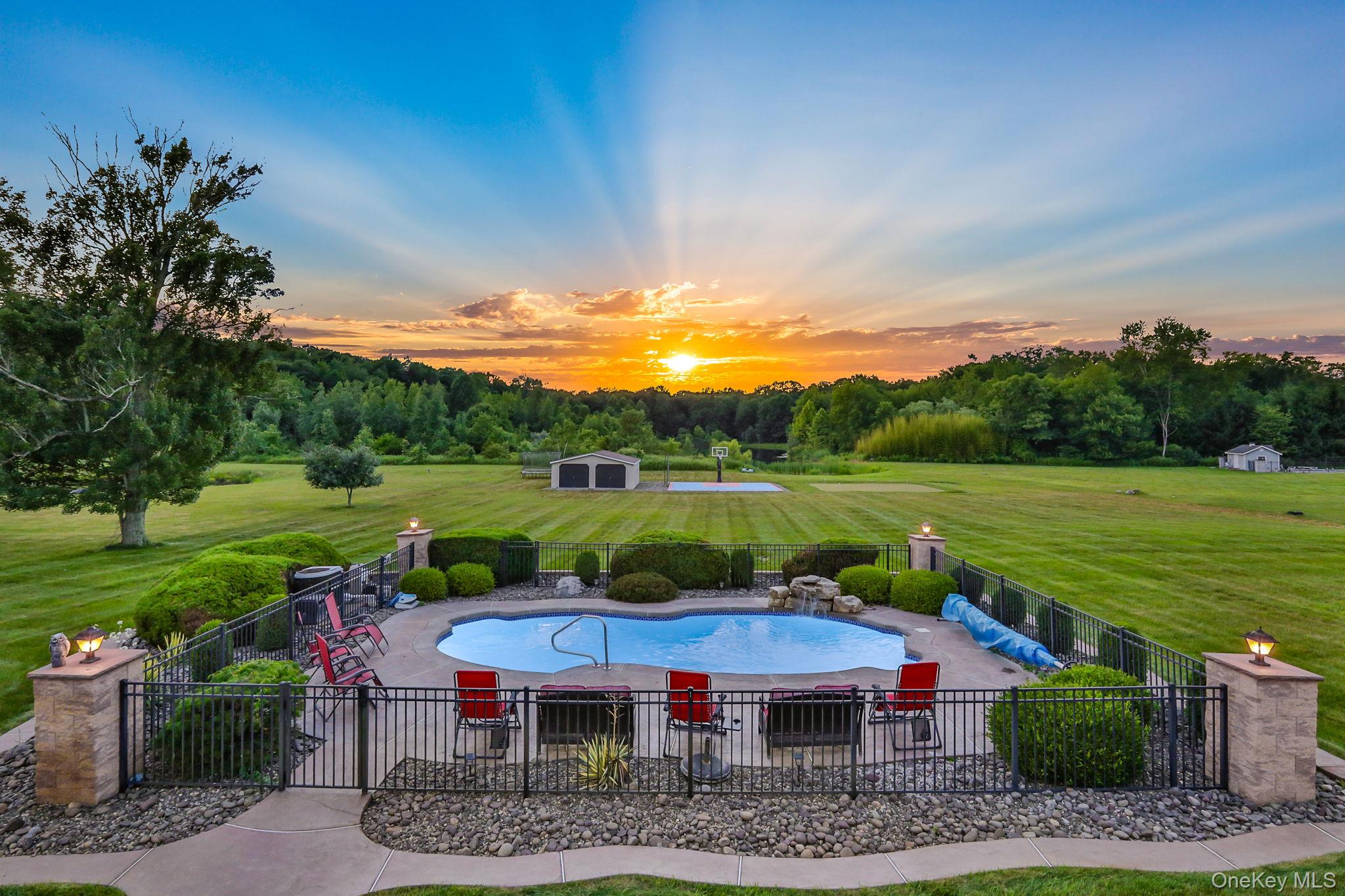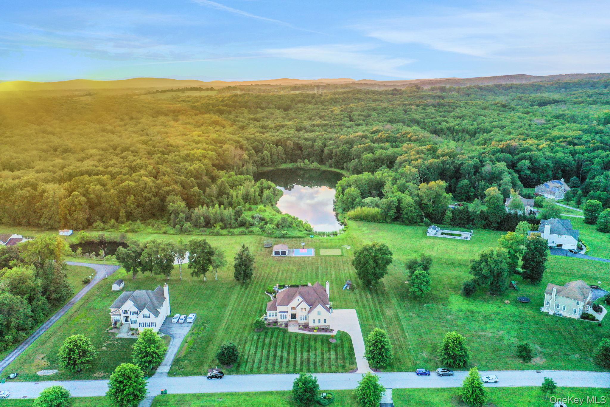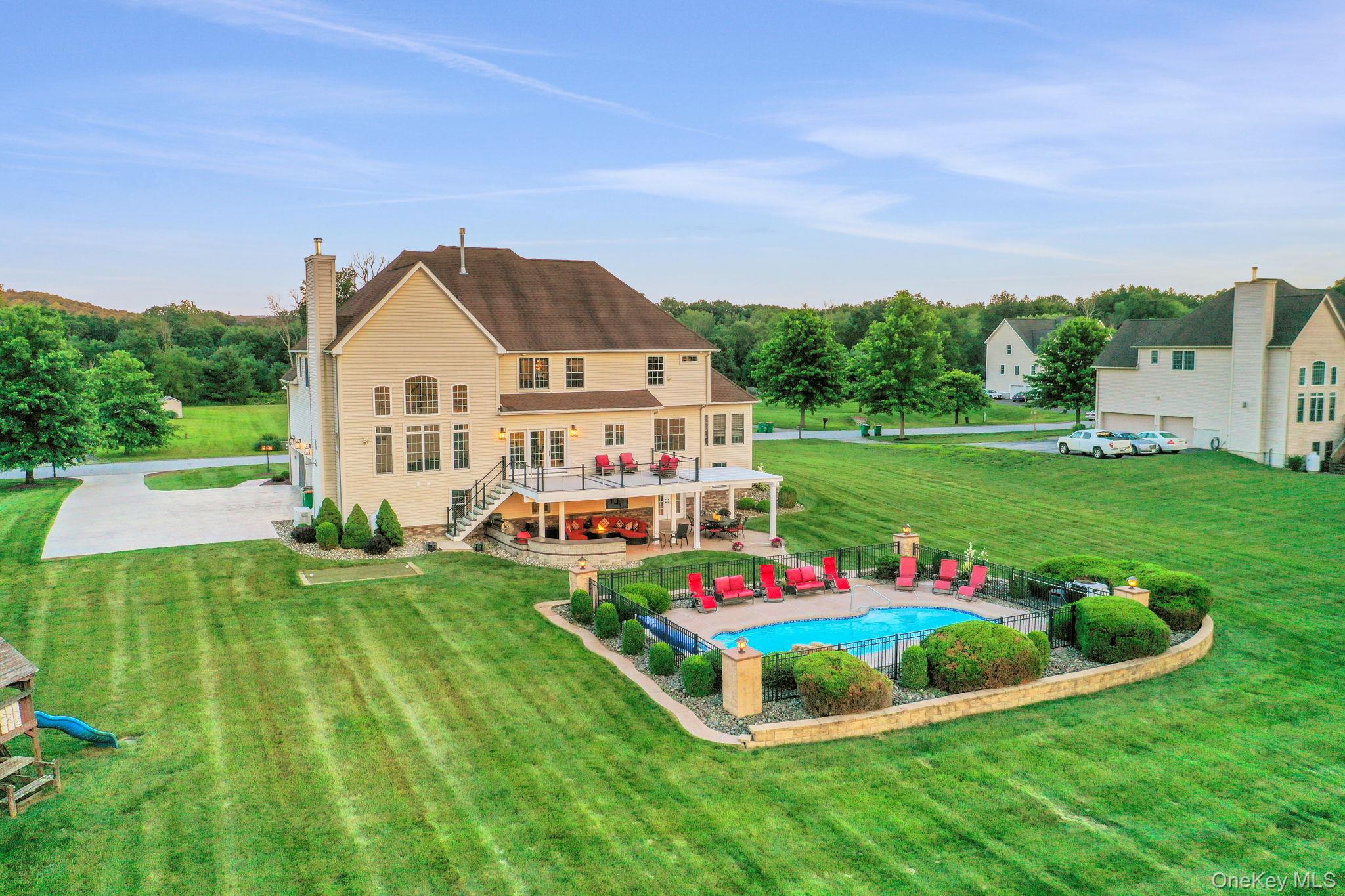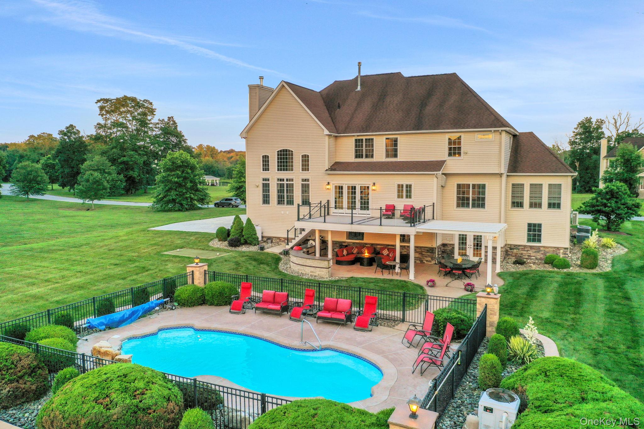 Discover the epitome of elegance in this timeless four-bedroom, six-bathroom estate, just over one hour from NYC via the George Washington Bridge. Nestled in the breathtaking Hudson Valley, this luxurious retreat captivates both NYC clients and locals alike, offering an unrivaled blend of sophistication and resort-style living. Arrive via the concrete diamond-stamped driveway and walkway, stepping through grand 8-foot double doors with wrought iron railings into a stunning foyer with 18-foot ceilings and flawless hardwood floors. The opulent entryway flows into a sitting room, formal dining room, sunroom, and office (which can be easily converted into a fifth bedroom), as well as a full bath. Over 200 LED high-hat lights and textured wall coverings illuminate the estate’s timeless allure. The seamless flow continues to an oversized chef’s kitchen, featuring granite and quartz countertops, newer appliances, and exquisite white cabinetry, opening effortlessly to the family and entertaining areas. The eat-in kitchen connects to a magnificent family room with 18-foot ceilings, floor-to-ceiling windows, and a 18-foot stone pellet stove fireplace. Sliding doors lead to a beautiful composite deck with cable railings, overlooking a resort-like backyard. A central vacuum system and whole-home Generac generator ensure ultimate convenience and peace of mind. Upstairs, the oversized primary suite radiates luxury with cauffed ceilings, a gas fireplace, a sitting area, a jacuzzi tub, a shower, dual sinks, and two walk-in closets. A laundry room off the primary suite leads to three oversized bedrooms, one with a full bath and two share a Jack-and-Jill bath. The lower level is an entertainer’s paradise, featuring a theater/media room with seven leather-stitched reclining seats, a full gym, Sauna, and a billiards room with an oversized granite kitchenette, wet bar, coffee station, and built-in seating for 12. Step through double sliding doors to a resort-style backyard, complete with an outdoor kitchen and bar boasting granite countertops, a Kamado Joe smoker, a grill, and a pizza oven. Enjoy a heated saltwater pool with a waterfall, a golf facility featuring a teeing area and a 6-hole practice green, as well as a synthetic basketball court and pond, all located on the property. An oversized shed provides ample storage. Spanning nearly 2 acres, the grounds feature full irrigation, an ADT security system, and an indoor-outdoor Bose sound system. Fully Bluetooth-enabled, control indoor and outdoor lights, blinds, washer, dryer, security, and a Bose system from your phone. The car collector’s dream garage includes epoxy flooring, a hydraulic lift, parking for four vehicles, and four EV charging stations with two dedicated power lines. This Hudson Valley masterpiece offers timeless luxury and modern sophistication, just over an hour from NYC. Schedule your private tour today!