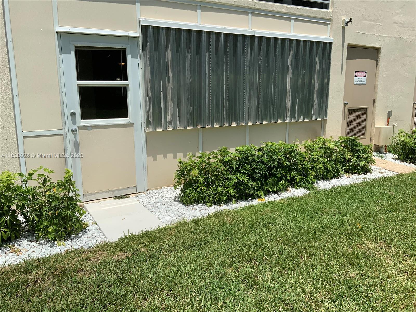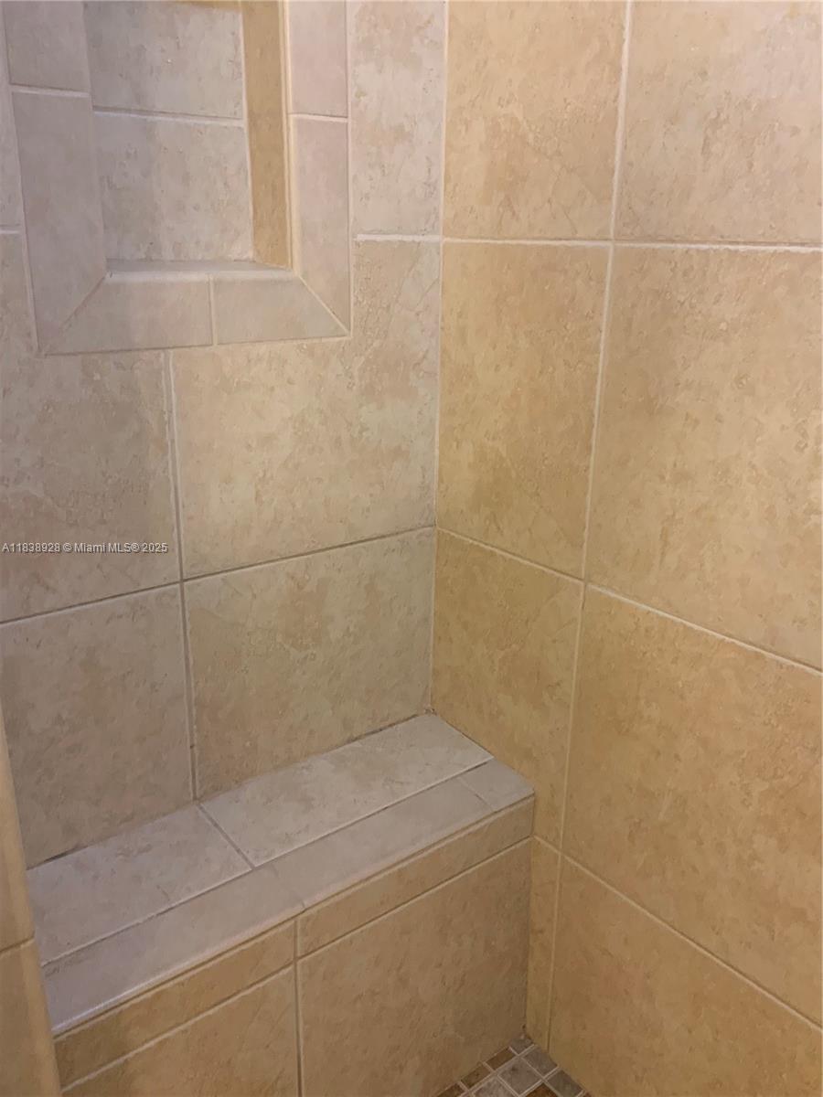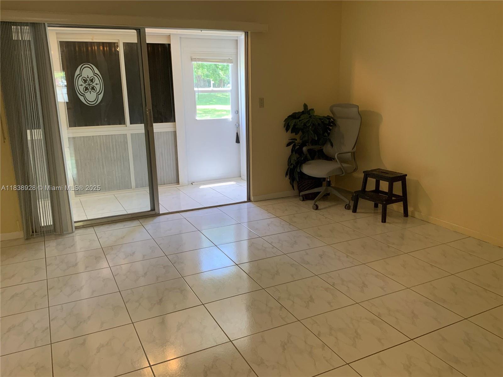 Size and Layout: 742 sq ft under air conditioning, one of the largest first-floor units in Wynmoor. a spacious master bedroom with a half French glass door entry, a large walk-in closet, and a tiled bathroom with a shower-only setup and bench seat for accessibility. Prime ground-floor location just inside the guard gate, with parking directly outside the front door, next to the laundry room and mailboxes. The back door opens to the pool area. Enclosed back porch with glass uppers and wood lowers, serving as a sitting area with two large built-in closets. Equipped with hurricane shutters. Tile flooring throughout, white kitchen cabinets, stainless steel appliances, drop ceiling in the kitchen, and specialty blinds in the living room for customizable light control.