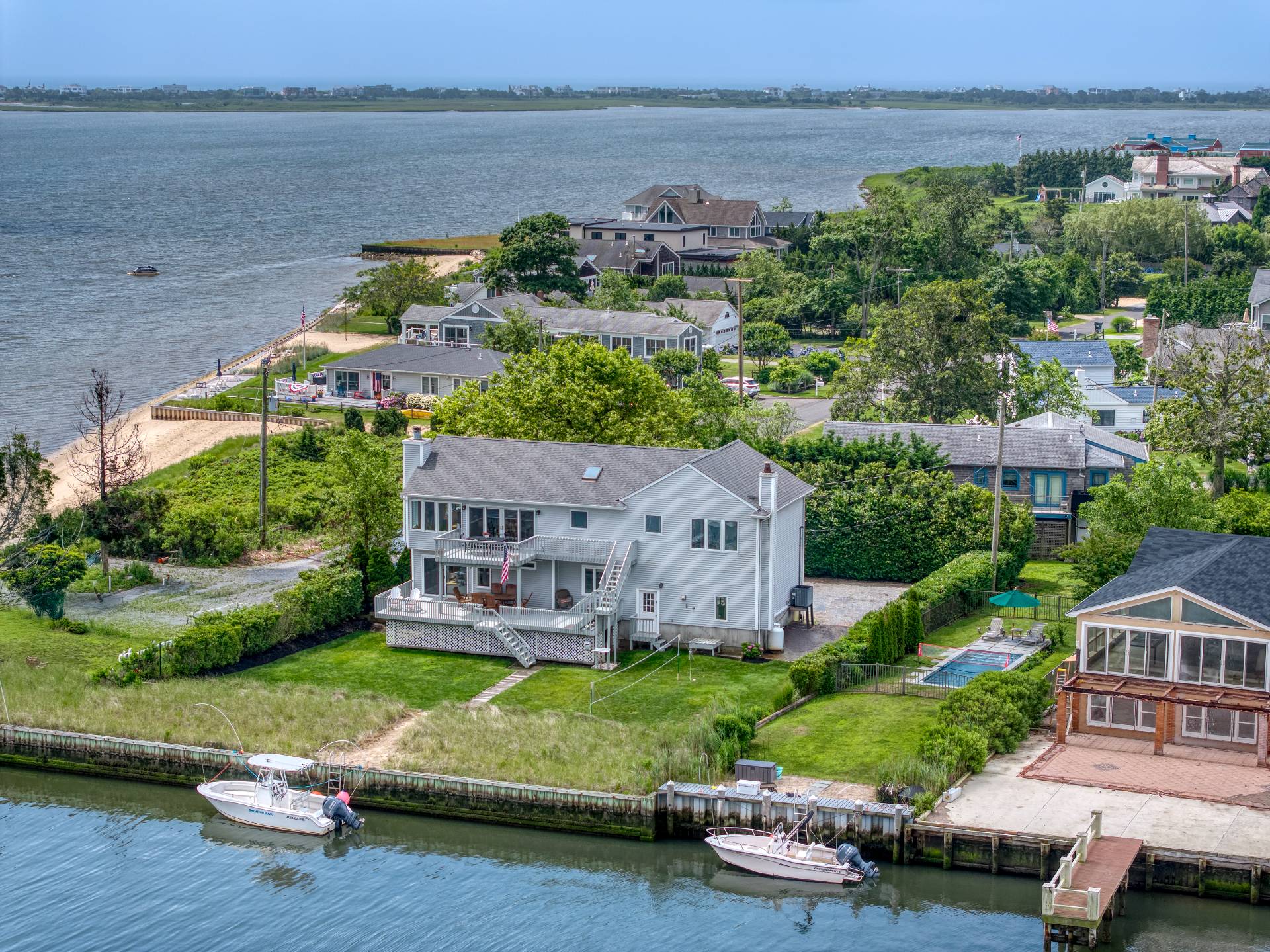 Waterfront Beach House | Shinnecock Bay, East Quogue Nestled along the shimmering shores of Shinnecock Bay, this stunning two-story beach house boasts panoramic water views to the east, south to Dune Road, and west-offering serene sunrises and captivating sunsets. Situated within an exclusive private beach community with residents-only access, the home is perfectly designed for effortless summer living. Expansive decks on both levels create inviting spaces for entertaining or peaceful relaxation by the water's edge. A bulkhead with ample space to dock your boat enhances the true bayfront lifestyle, complemented by four community docks providing added convenience for boating enthusiasts. Whether you're looking for a weekend retreat or year-round coastal sanctuary, this East Quogue gem embodies the best of Hamptons waterfront living.